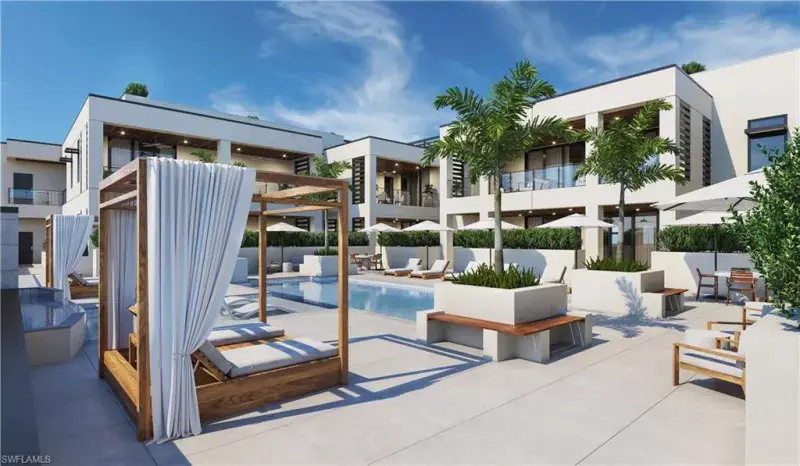 Just 10 exclusive luxury condos are for sale at Stella Naples. This boutique, three-story enclave converges the coveted Downtown Naples lifestyle with casual sophistication to create a truly unique urban-oasis bearing the prestigious Olde Naples zip code. The Bianca floorplan at Stella Naples offers 2 bedrooms, 2 full baths, plus a den. This third floor unit features a 371 square foot covered balcony looking out over a luxurious 42 foot resort-style pool area, and comes with a 1003 square foot private roof deck suite. Notable residence features include wide-plank hardwood flooring, custom mahogany front door with keyless entry, custom cabinets by Ruffino featuring an expansive kitchen walnut wood island, Cambria counters, walk-in closets, en-suite bathrooms with private water closets, formal dining room with wet bar, luxury appliances, walk-in pantry/laundry, indoor and outdoor fireplaces, and a long list of additional included offerings. Concierge Design Services are available for the ultimate in customization. Stella Naples is just three short blocks to 5th Ave S, everything you love about Naples within minutes of your front door!