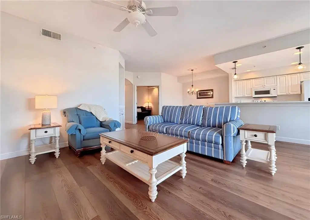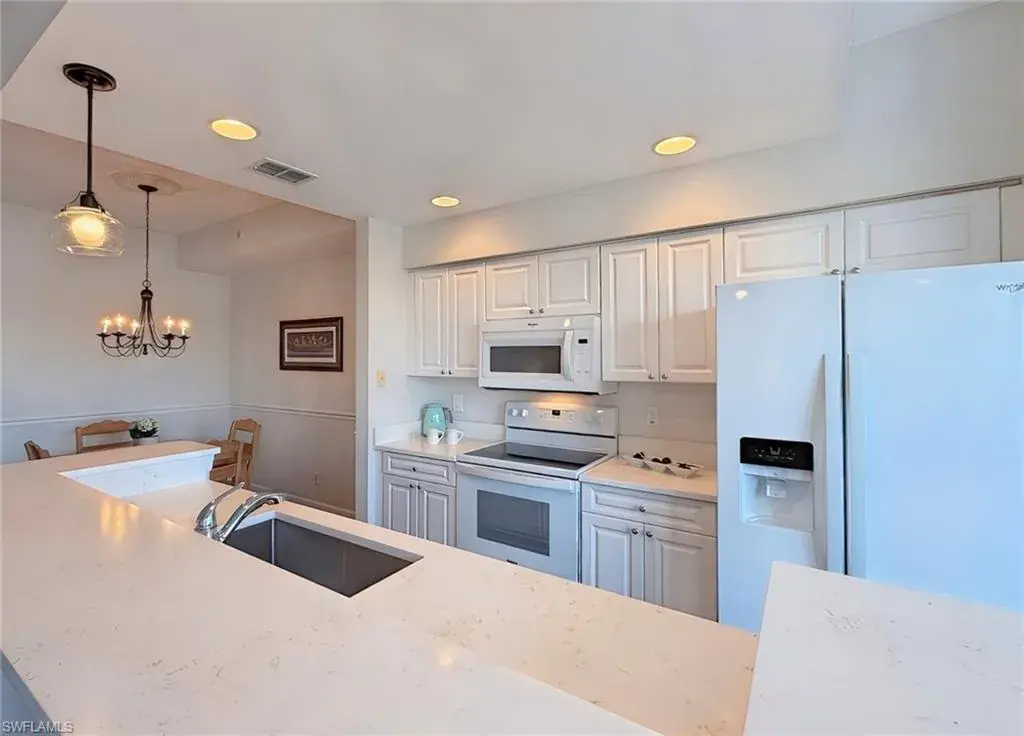 Condo’s open concept is perfect for everyday living as well as entertaining. Neutral paint and luxury vinyl plank flooring throughout. Kitchen with white cabinets, quartz countertops, newer appliances and pantry. Kitchen is open to living room and dining room. Den has French doors for privacy. Primary bed room has ensuite with walk in closet. Primary bath has walk in shower. Guest room is spacious. Water and golf view. Tastefully furnished – TURNKEY – Move in & immediately start enjoying all that this gated community has to offer.