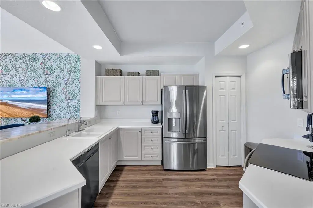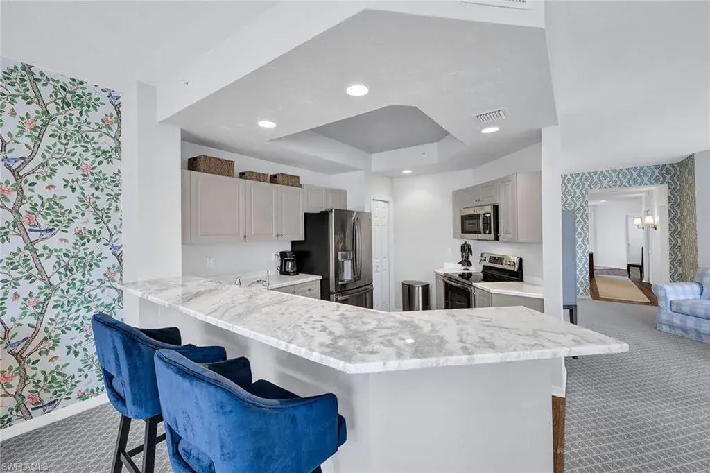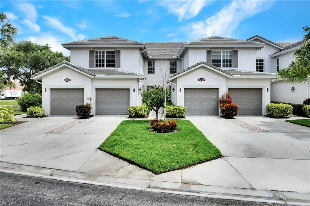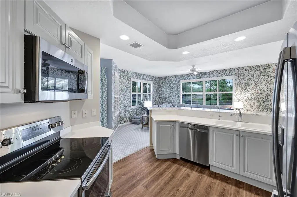 This pristine end unit home is set on one of the prettiest lots in Fiddler’s Creek with water and park-like views on two sides. Updated with a modern Palm Beach-inspired décor, the home boasts new luxury vinyl plank flooring, new Wilton carpeting, updated kitchen cabinetry with polished nickel hardware, and designer wallpaper from an artist who mixes vibrant and whimsical Floridian colors into traditional New England designs. Have coffee in the light-filled living room or enjoy a book in the cozy sitting area with lanai views. Entertaining is a treat with a large dining area. You and your guests will sleep comfortably as the home boasts a double-door primary suite with lanai access and attached bath with dual vanities and glass-enclosed shower as well as a second front-facing bedroom with adjacent full bath. Other features include impact windows, plantation shutters, tray ceilings, attached garage, full-size washer and dryer, and lakeside screened lanai with new electric hurricane shutters to protect the outdoor area. Enjoy Fiddler’s Creek’s world-class amenities including spa services, casual and fine dining, fitness center, tennis, pickleball, bocce, and resort-style pool with waterfalls and slides. Golf, beach and marina memberships available if desired. The location is the best of both worlds with easy access to shops and dining of downtown Naples as well as beaches of Marco Island.