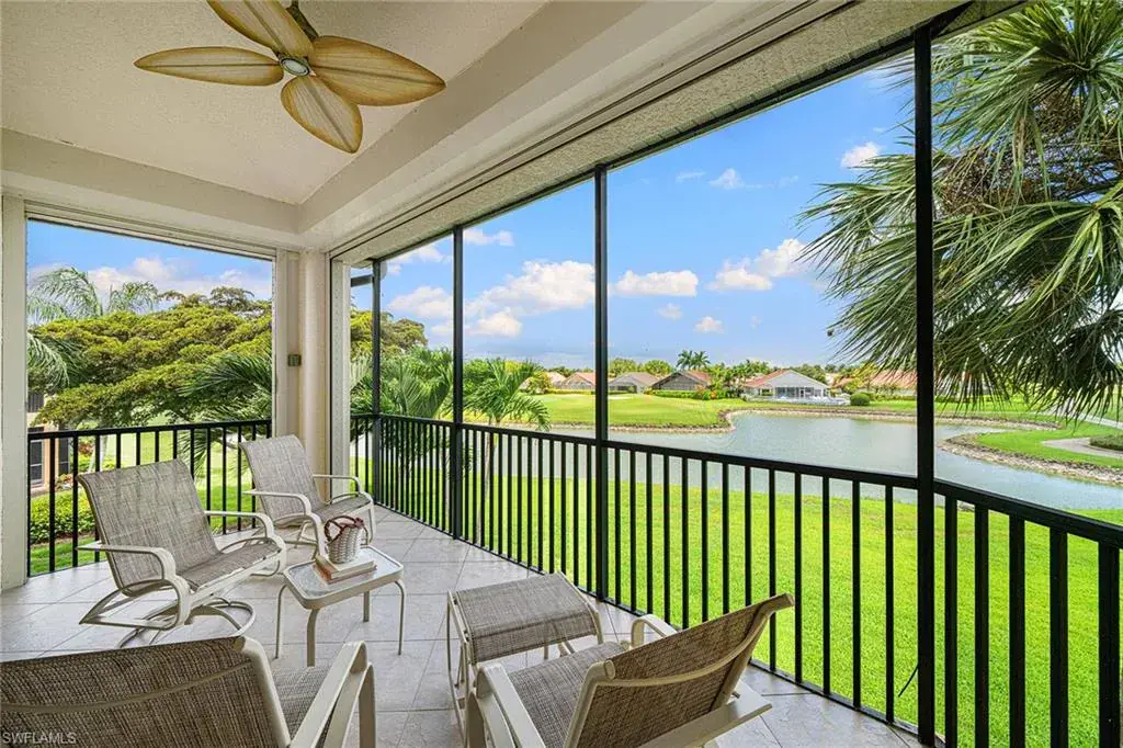 Enjoy dramatic southern views of the Mustang course and its waterways from this sought-after second-floor residence at Champions! A versatile freshly painted interior, with French Provincial accents, and numerous upgrades including PGT impact windows, automated hurricane shutters and a newly installed water heater. Open-concept kitchen, highlighted with refaced cabinetry, stainless steel appliances, tin ceiling detail and updated quartz countertops. A spacious living area is flooded with natural light and boasts white tongue and groove ceiling detail, crown molding and Mountain Timber wood-look porcelain tile flooring. The primary suite is tucked away and includes dual custom closets and updated bath with soaking tub. The extra-large third bedroom can be split into two rooms or used as an office or flex space. Enjoy a private two-car garage with private elevator access. Close to the community clubhouse which includes a pool, spa and grills for residents to enjoy. Champions is a double-gated community, and it is not a requirement to join the Player’s Club. Lely Resort is on 3,000 acres with exercise and recreational trails, beautiful lakes and preserves. A short drive to Marco and downtown Naples.