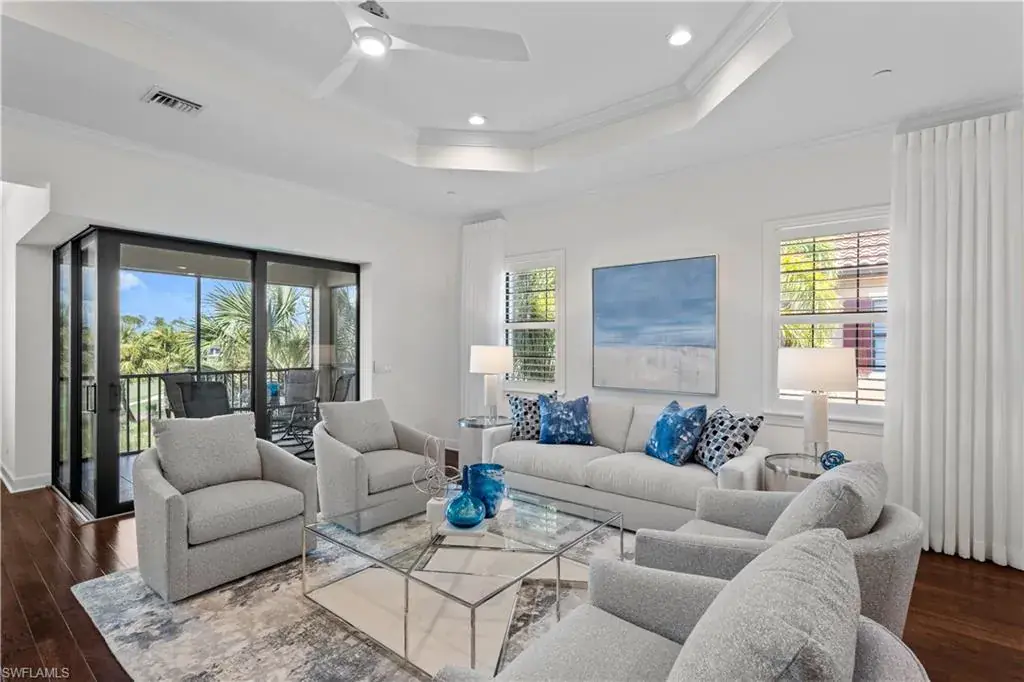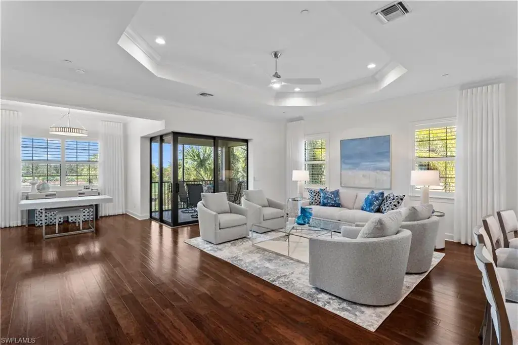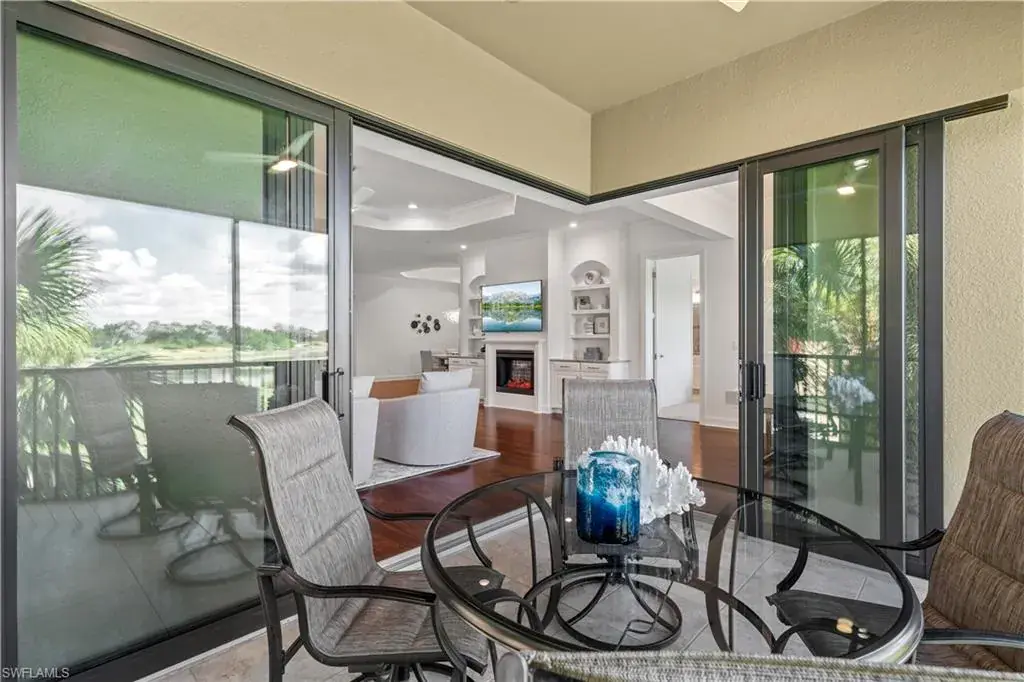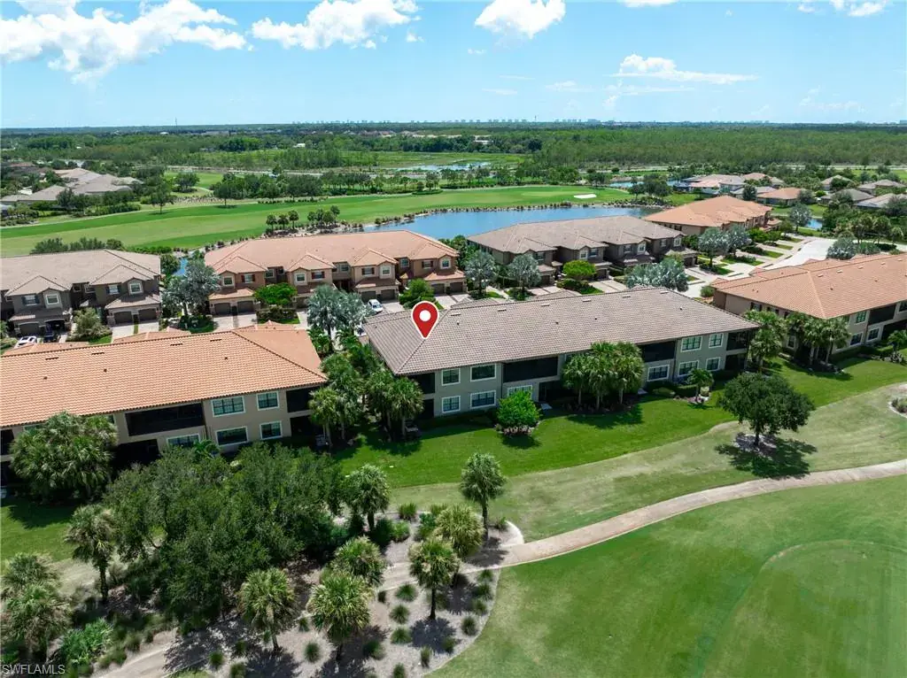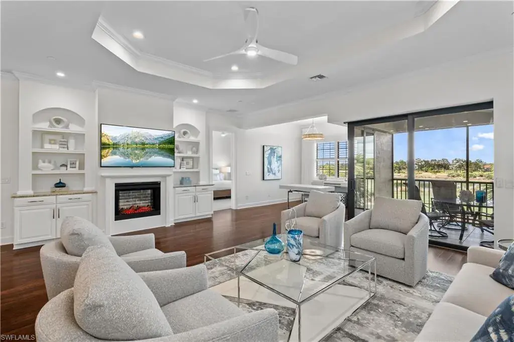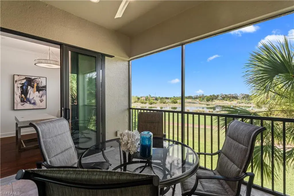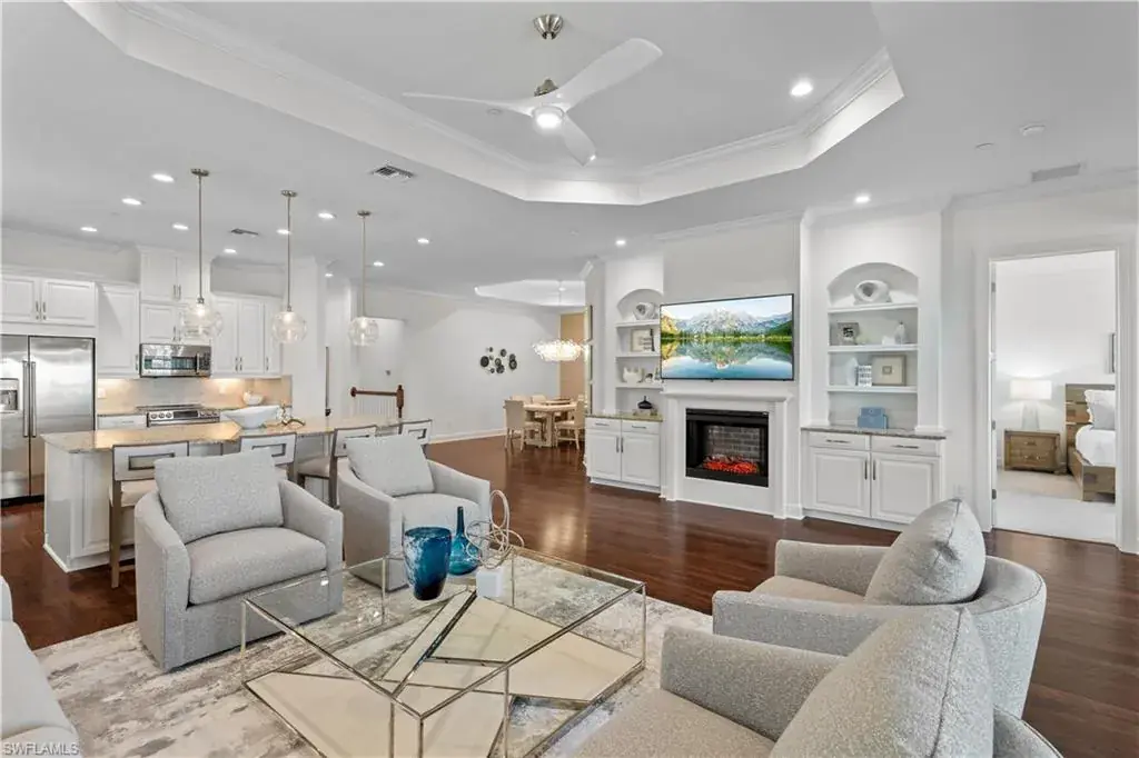 FULL GOLF MEMBERSHIP INCLUDED! $100k Designer Furniture/Decor package included! Start living a vacation lifestyle in Esplanade G&CC! This 3 bedroom plus bonus area, 3 full bath “Romano” second-floor END UNIT coach home blends style, comfort, and panoramic views of a tranquil lake, preserve, and the lush 8th green, with no rooftops interrupting the scenery, this residence offers an unparalleled sense of privacy and serenity. Designed with an open, airy layout, the expansive great room is anchored by an impressive zero corner pocketing sliding glass door, inviting you to step out onto a private, tiled and screened lanai—perfect for enjoying the warm Naples breeze and picturesque sunrises. The heart of the home is a beautifully appointed kitchen featuring a generous center island, stainless steel appliances, and abundant cabinetry, creating a space that is as functional as it is inviting. The great room showcases a custom feature wall complete with an LED fireplace, built-in cabinetry, and stylish shelving, adding both warmth and sophistication to the space. Crown molding and a freshly painted interior enhances the architectural detail. Elegant upgrades are found throughout, including hurricane-impact windows and doors, plantation shutters & custom window treatments throughout, special order designer lights/fans/chandeliers, and more!