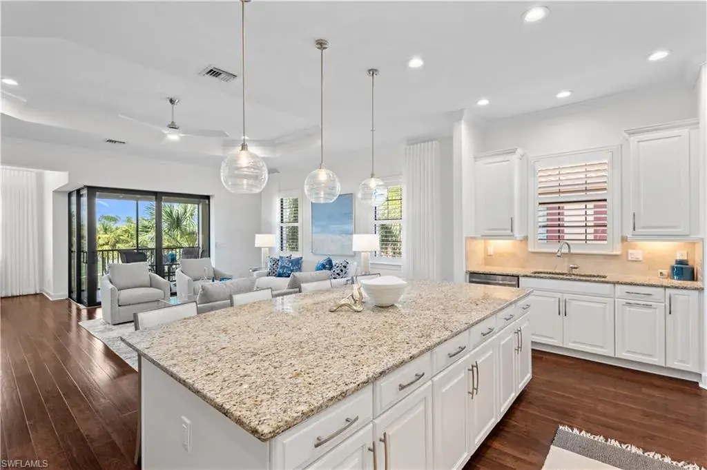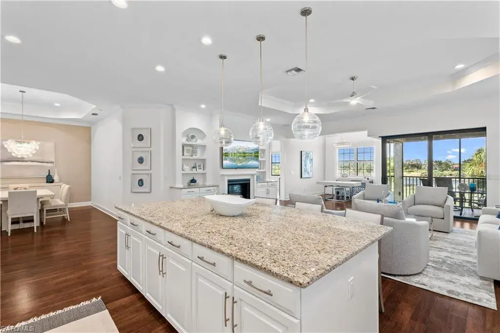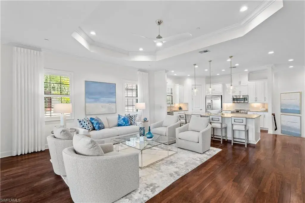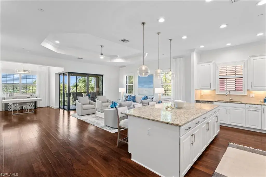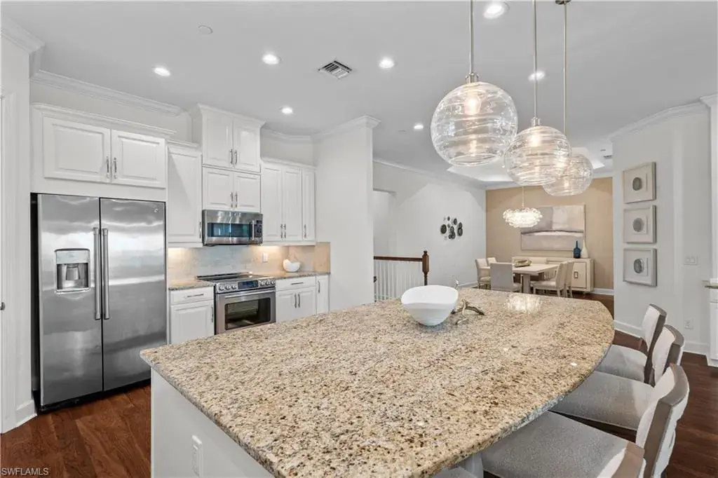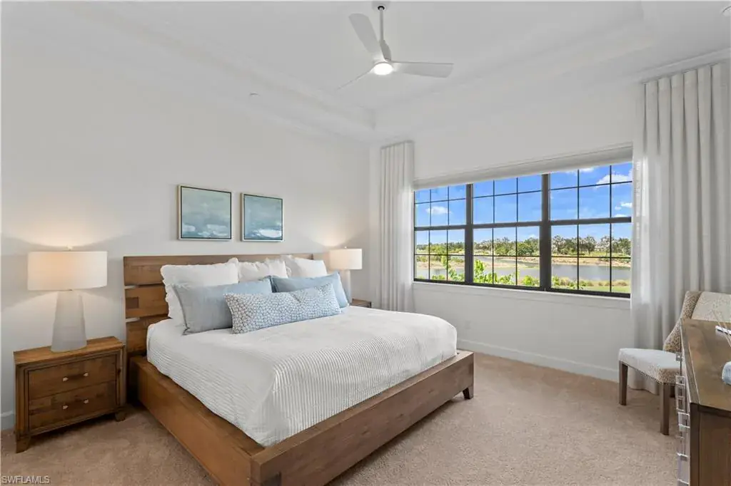 FULL GOLF MEMBERSHIP INCLUDED! $100k Designer Furniture/Decor package included! Start living a vacation lifestyle in Esplanade G&CC! This 3 bedroom plus bonus area, 3 full bath “Romano” second-floor END UNIT coach home blends style, comfort, and panoramic views of a tranquil lake, preserve, and the lush 8th green, with no rooftops interrupting the scenery, this residence offers an unparalleled sense of privacy and serenity. Designed with an open, airy layout, the expansive great room is anchored by an impressive zero corner pocketing sliding glass door, inviting you to step out onto a private, tiled and screened lanai—perfect for enjoying the warm Naples breeze and picturesque sunrises. The heart of the home is a beautifully appointed kitchen featuring a generous center island, stainless steel appliances, and abundant cabinetry, creating a space that is as functional as it is inviting. The great room showcases a custom feature wall complete with an LED fireplace, built-in cabinetry, and stylish shelving, adding both warmth and sophistication to the space. Crown molding and a freshly painted interior enhances the architectural detail. Elegant upgrades are found throughout, including hurricane-impact windows and doors, plantation shutters & custom window treatments throughout, special order designer lights/fans/chandeliers, and more!