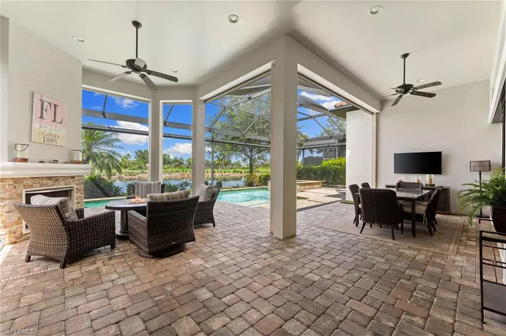 Designed for those who live for indoor-outdoor living, the expansive lanai features a sparkling pool and spa, a large dining space, fireplace lounge, and an outdoor kitchen—all with postcard-perfect views of the fairway and lake.
