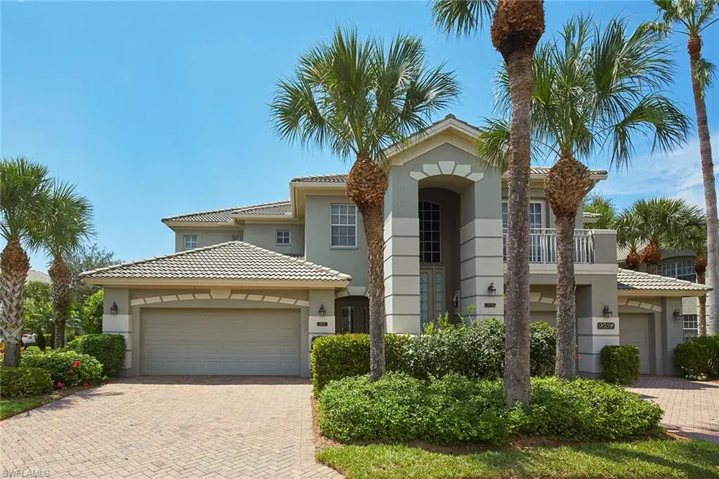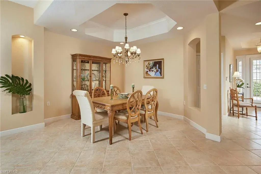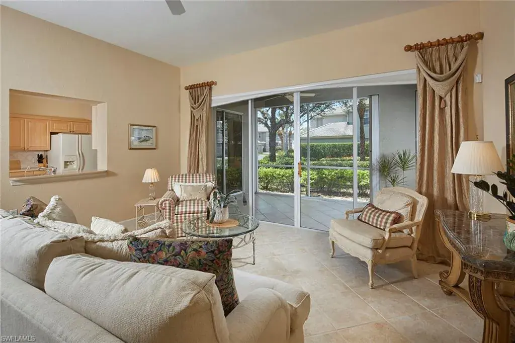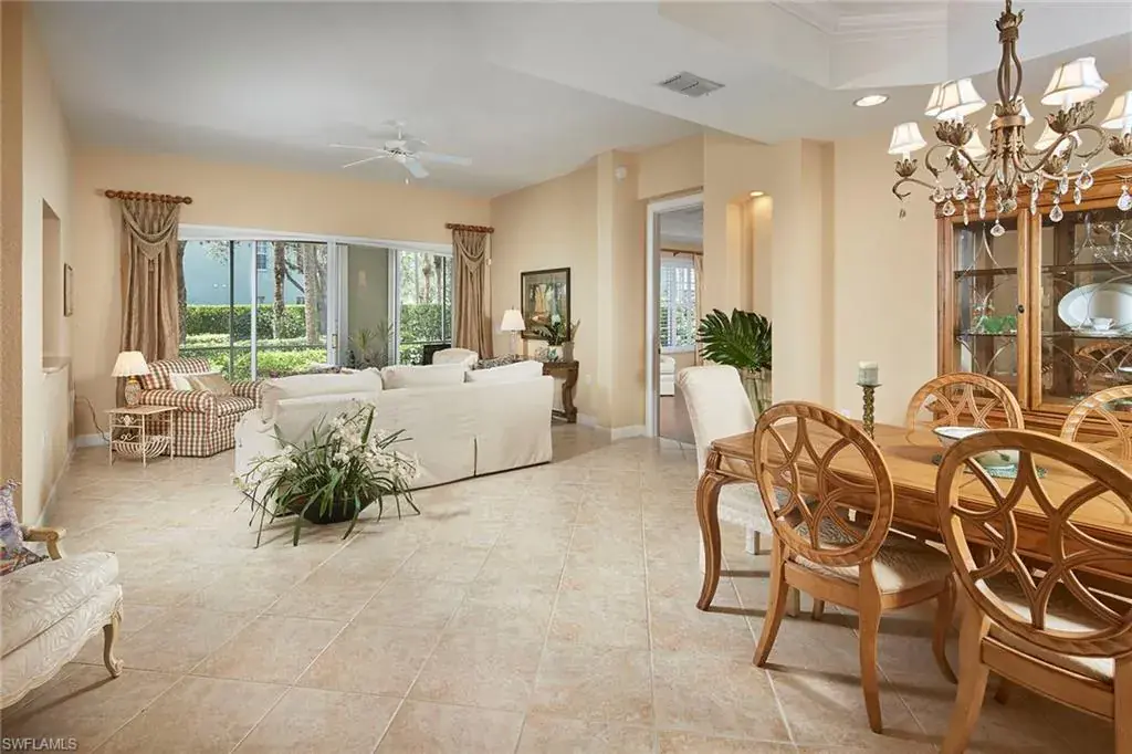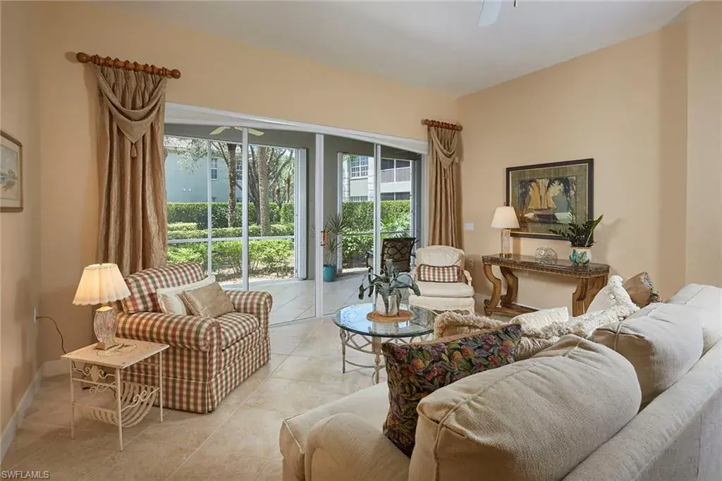Move in and enjoy this immaculate first floor coach home with just two units in the building giving extra privacy and additional windows. This three bedroom or 2 bedroom+den, 2.5-bath Great Room plan offers split bedrooms, formal dining room, spacious kitchen with morning room, and a laundry room with cabinets and sink. Spacious owner’s bedroom suite has a huge walk-in closet, lanai access and a large bath with dual sinks, separate tub and shower. Flooring throughout is either tile or newer beautiful wood, with many 10-foot tray ceilings in main areas including bedrooms. The guest suite has a walk-in closet and private bath. Crown moldings, plantation shutters and ceiling fans. Walk-in entry closet measures 4-by-6 feet and offers great storage. Generous screen lanai with accordion storm shutters has a private garden view. Attached two-car garage and no stairs. On a private cul-de-sac, Osprey Pointe at Pelican Marsh is a pet-friendly community of 96 condominiums in a parklike setting offering a community center with club room, fitness, pool and spa.