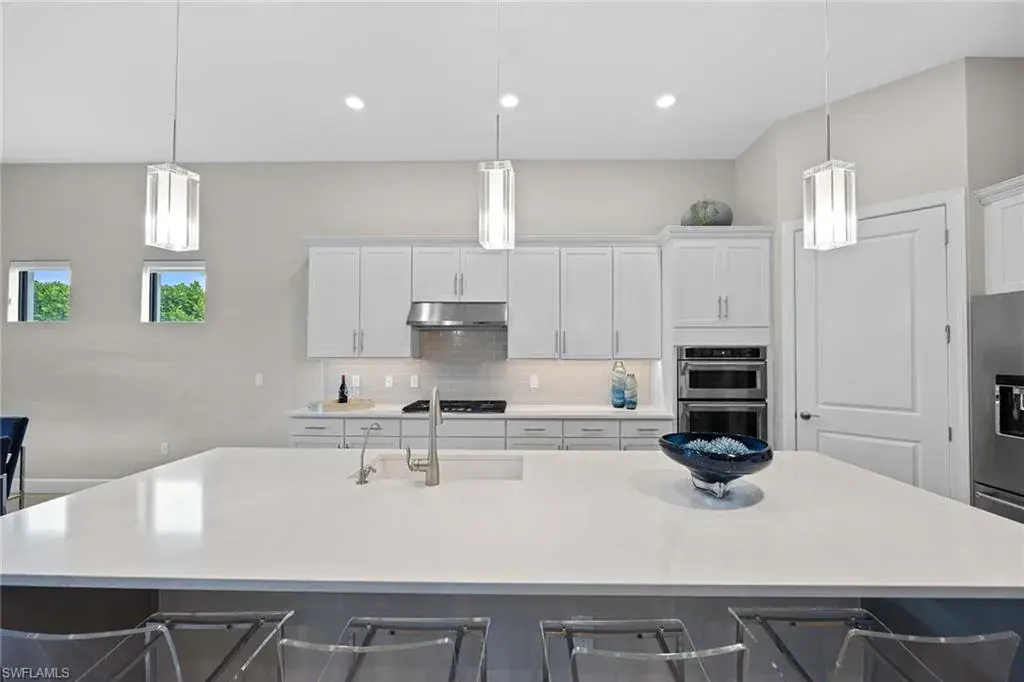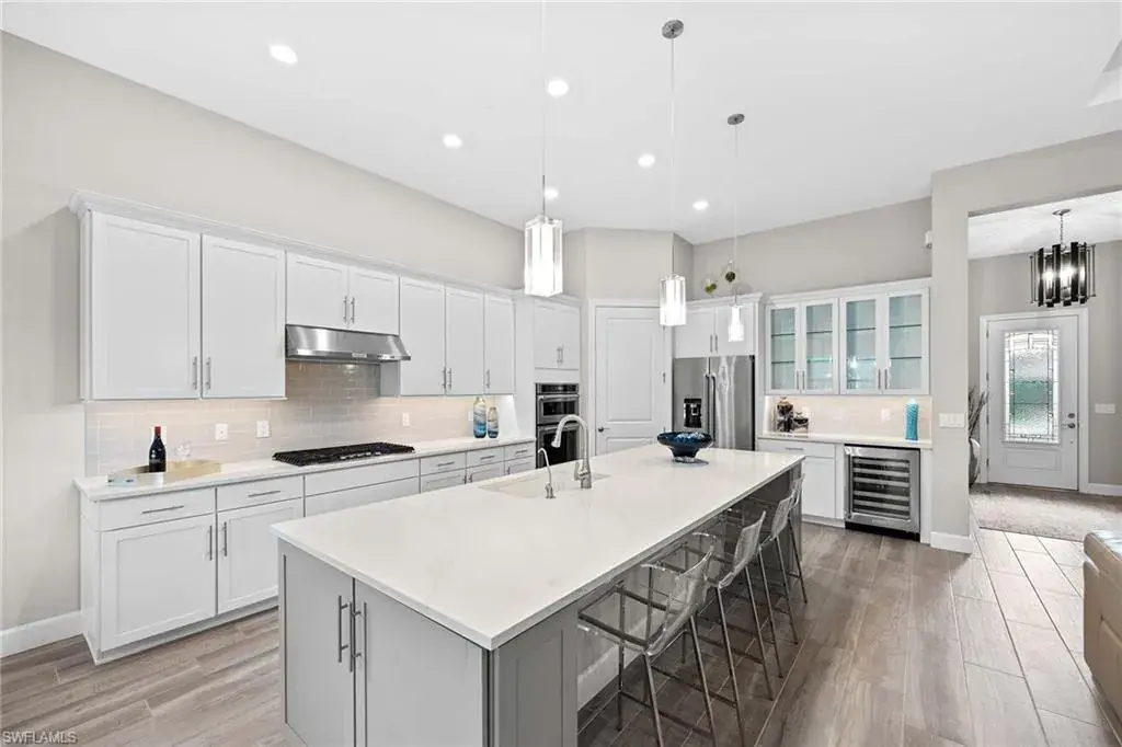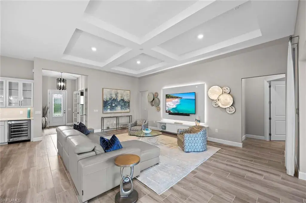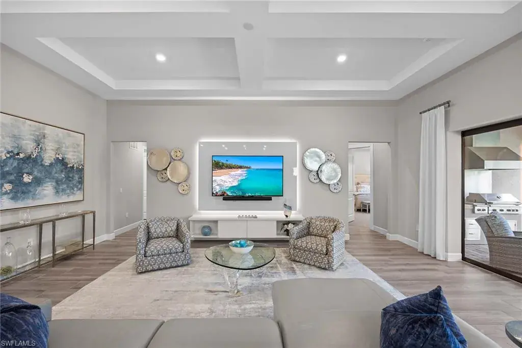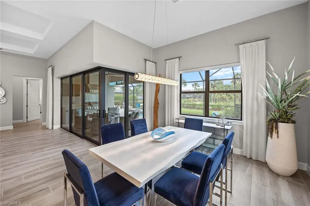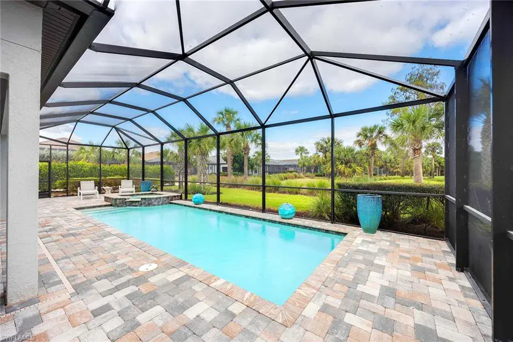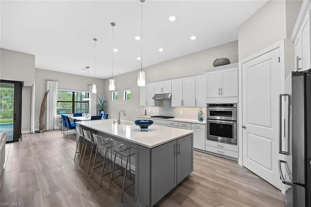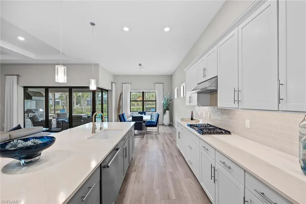 In a gated North Naples community, this meticulously maintained Pinnacle model is offered turnkey furnished and features three bedrooms, three full baths, a private den and a three-car garage. Enhanced by curated designer furnishings and artwork, the residence offers seamless indoor-outdoor living with serene golf course views and resort-style amenities. A spacious great room with a backlit entertainment wall and coffered ceiling opens to the dining area and gourmet kitchen. Designed for function and style, the kitchen features quartz countertops, a tile backsplash, custom cabinetry and premium KitchenAid appliances, including a natural gas cooktop and wine bar upgrade with built-in cooler. Zero-corner sliders extend the open-concept layout onto a covered lanai with an outdoor kitchen with grill, refrigerator and TV, dining space and lounge area with fire table, all overlooking a screened paver patio with a heated pool, spa and fire pit. The primary suite includes a tray ceiling, dual vanities, a soaking tub and a huge walk-in closet with custom built-in cabinetry. A private den with French doors offers flexible use as an office or library. The second bedroom includes a bay window and en-suite bath, while the third bedroom has easy access to the third full bath. Additional features include a well-equipped laundry room with ample cabinetry, epoxy-coated garage flooring, designer lighting and window treatments. In a no-flood zone, this low-maintenance residence does not require flood insurance. The community is in proximity to world-class beaches, upscale shopping and fine dining. This is a rare opportunity to own a fully furnished, move-in ready home with refined finishes, premier amenities and a desired golf course setting in one of Naples fastest-growing areas.