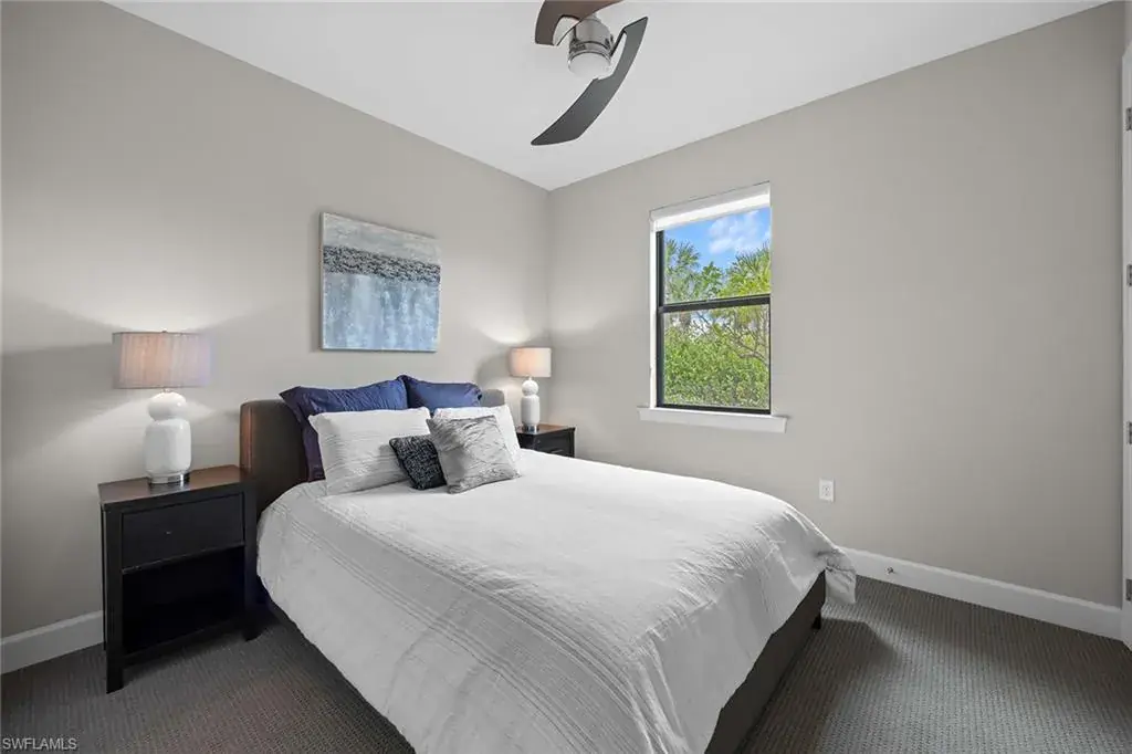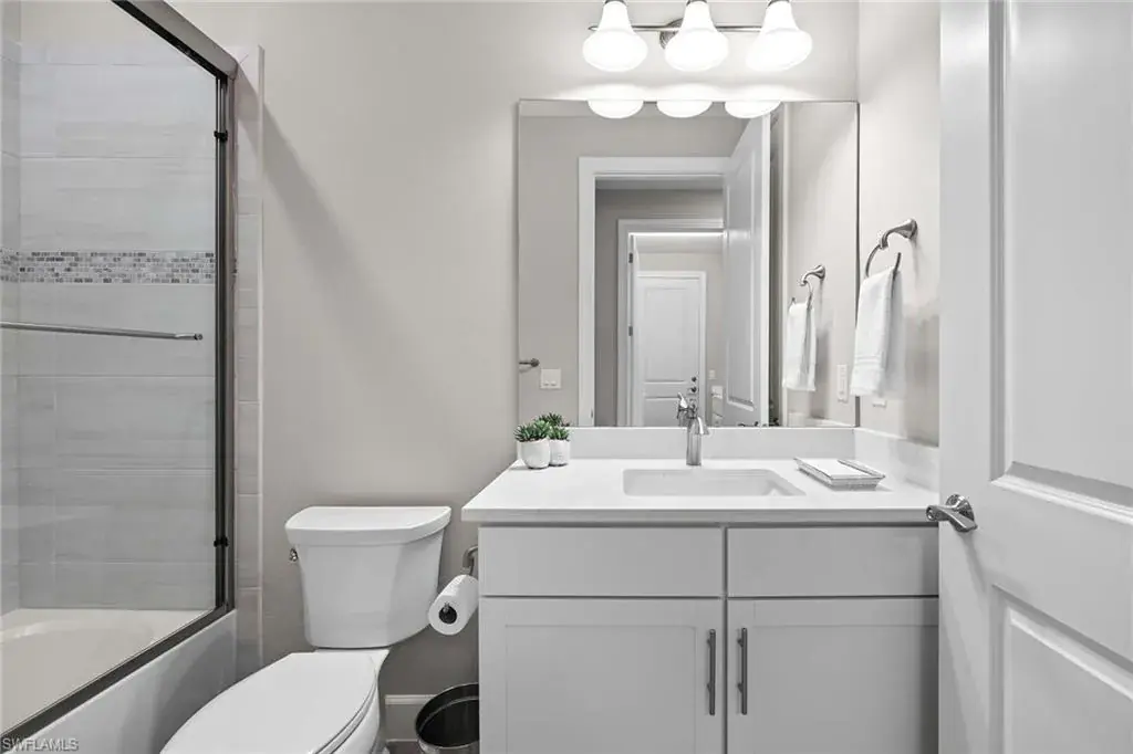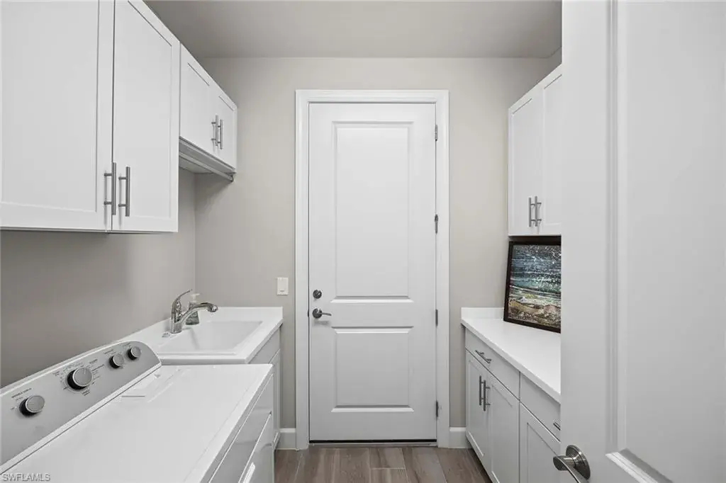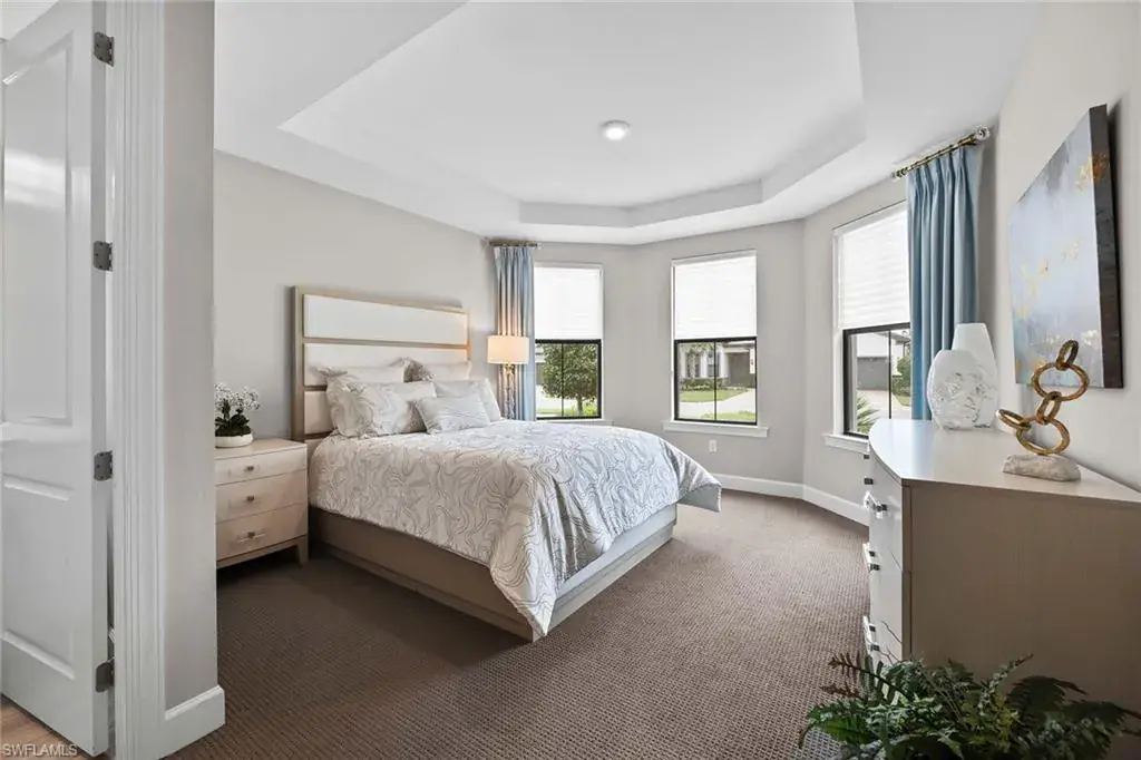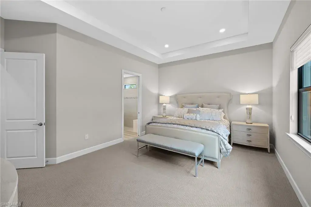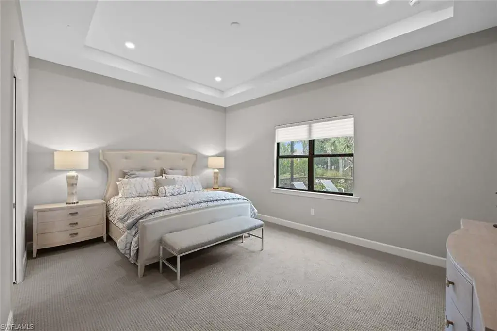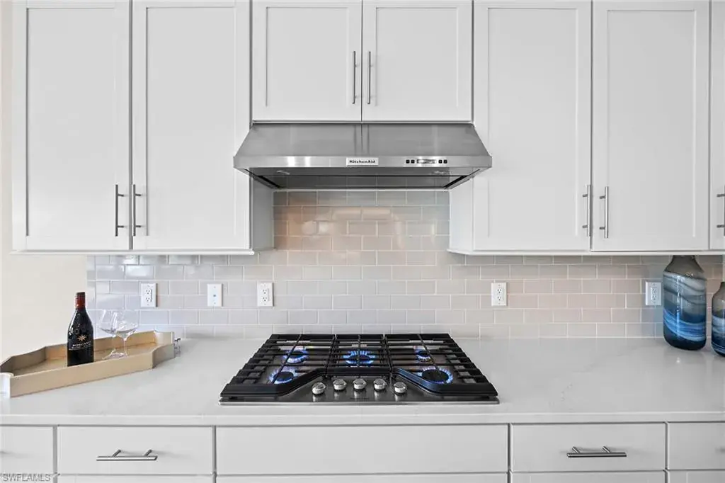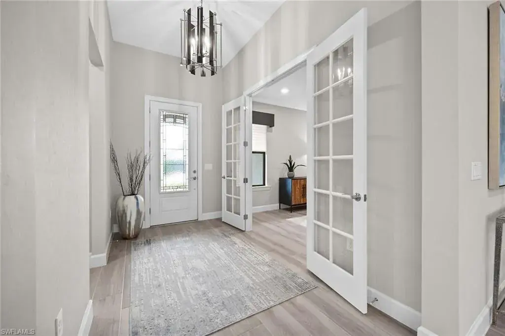 In a gated North Naples community, this meticulously maintained Pinnacle model is offered turnkey furnished and features three bedrooms, three full baths, a private den and a three-car garage. Enhanced by curated designer furnishings and artwork, the residence offers seamless indoor-outdoor living with serene golf course views and resort-style amenities. A spacious great room with a backlit entertainment wall and coffered ceiling opens to the dining area and gourmet kitchen. Designed for function and style, the kitchen features quartz countertops, a tile backsplash, custom cabinetry and premium KitchenAid appliances, including a natural gas cooktop and wine bar upgrade with built-in cooler. Zero-corner sliders extend the open-concept layout onto a covered lanai with an outdoor kitchen with grill, refrigerator and TV, dining space and lounge area with fire table, all overlooking a screened paver patio with a heated pool, spa and fire pit. The primary suite includes a tray ceiling, dual vanities, a soaking tub and a huge walk-in closet with custom built-in cabinetry. A private den with French doors offers flexible use as an office or library. The second bedroom includes a bay window and en-suite bath, while the third bedroom has easy access to the third full bath. Additional features include a well-equipped laundry room with ample cabinetry, epoxy-coated garage flooring, designer lighting and window treatments. In a no-flood zone, this low-maintenance residence does not require flood insurance. The community is in proximity to world-class beaches, upscale shopping and fine dining. This is a rare opportunity to own a fully furnished, move-in ready home with refined finishes, premier amenities and a desired golf course setting in one of Naples fastest-growing areas.