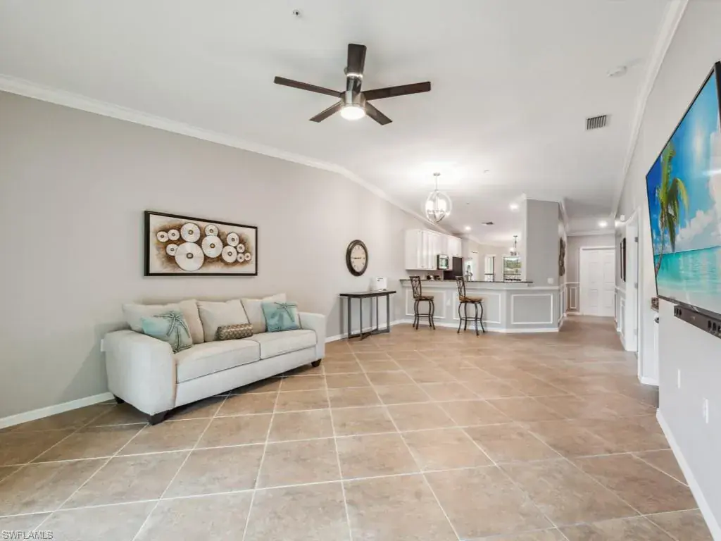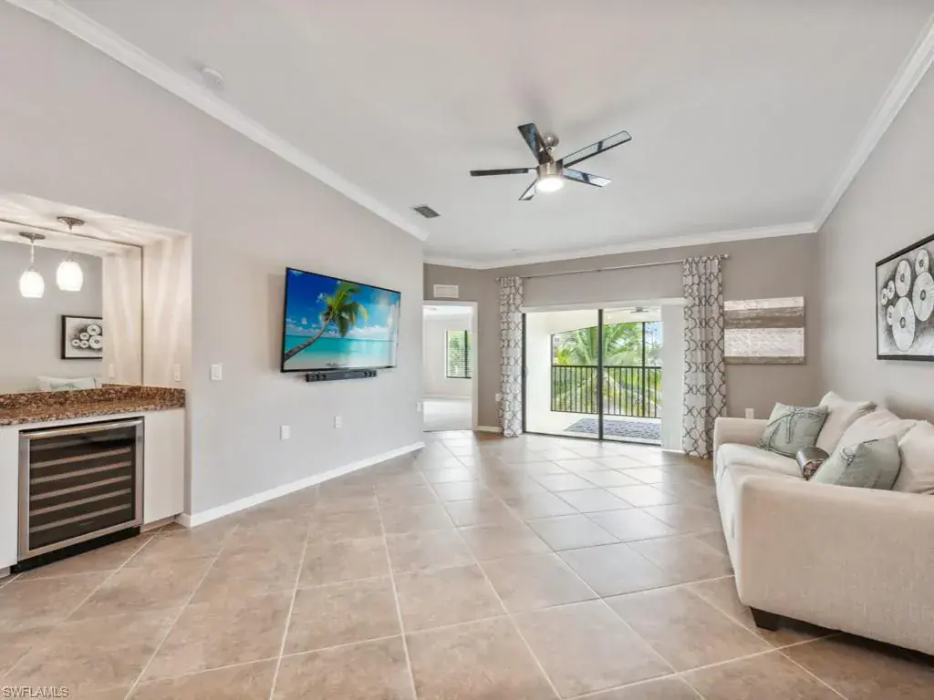 Incredible panoramic lake views are the highlight of this 2 bedroom plus den rarely available second floor end unit with no building next door. The newly painted white kitchen cabinets are a fabulous update and highlight the large, open concept kitchen. This is the largest Veranda floor plan available which features vaulted ceilings and lake views from every window, giving the home a light, bright airy feel. The home is meticulously kept, has been recently painted, has upgraded lighting, crown molding, shadow box wainscoting and a new built in wine refrigerator in the bar area. All furniture/accessories in the unit are included in the purchase. Treviso Bay’s amenities are second to none and include: resort style pool, fitness center, tennis courts, bocce, spa and pool restaurant/bar. This social membership also includes access to the spectacular TPC Golf clubhouse, restaurant, pickleball complex and all the social events Treviso Bay has to offer. Just 5 miles away from Naples beautiful sandy beaches and fabulous 5th Ave shopping and restaurants.