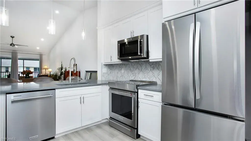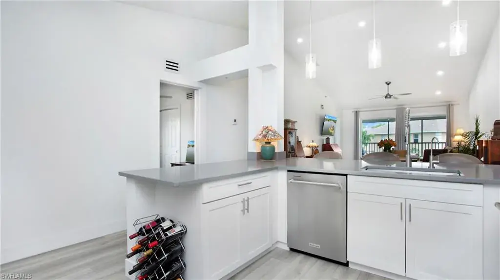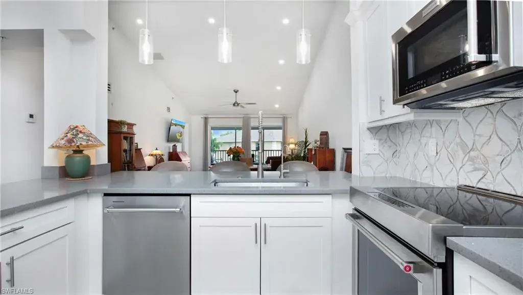 Welcome to this stunning, newly fully renovated top-floor end unit in the Victoria Shores subsection of Victoria Park…nestled in the heart of North Naples. This exquisite 3-bedroom, 2-bathroom condo offers the perfect blend of modern luxury and convenient location, just minutes to the sandy beaches and walking distance to Pelican Marsh Elementary. Step inside to discover an open-concept kitchen that will delight any culinary enthusiast. The kitchen is adorned with sleek quartz countertops, new cabinetry, and a stylish bar area, complemented by top-of-the-line stainless steel KitchenAid / GE appliances with a new induction stovetop and a below sink RO system to provide purified drinking water. The thoughtful design extends to recessed and track lighting, elegant fixtures, and ceiling fans that add both style and functionality. The bathrooms have been beautifully redesigned with contemporary vanities, tiled showers, and quartz countertops, offering a spa-like retreat with new sinks, faucets, lighting, and mirrors. Throughout the condo, you’ll find luxury laminate flooring, with the lanai elegantly finished in tile, providing a seamless indoor-outdoor living experience. Residents of Victoria Shores enjoy access to fantastic amenities including a community pool with a sun deck and tennis courts, all with the convenience of low HOA fees.