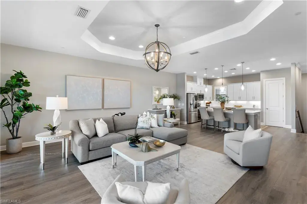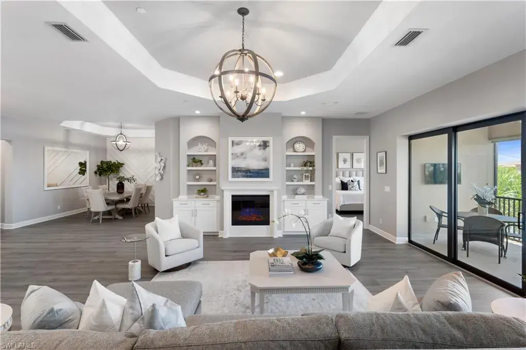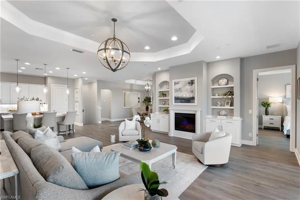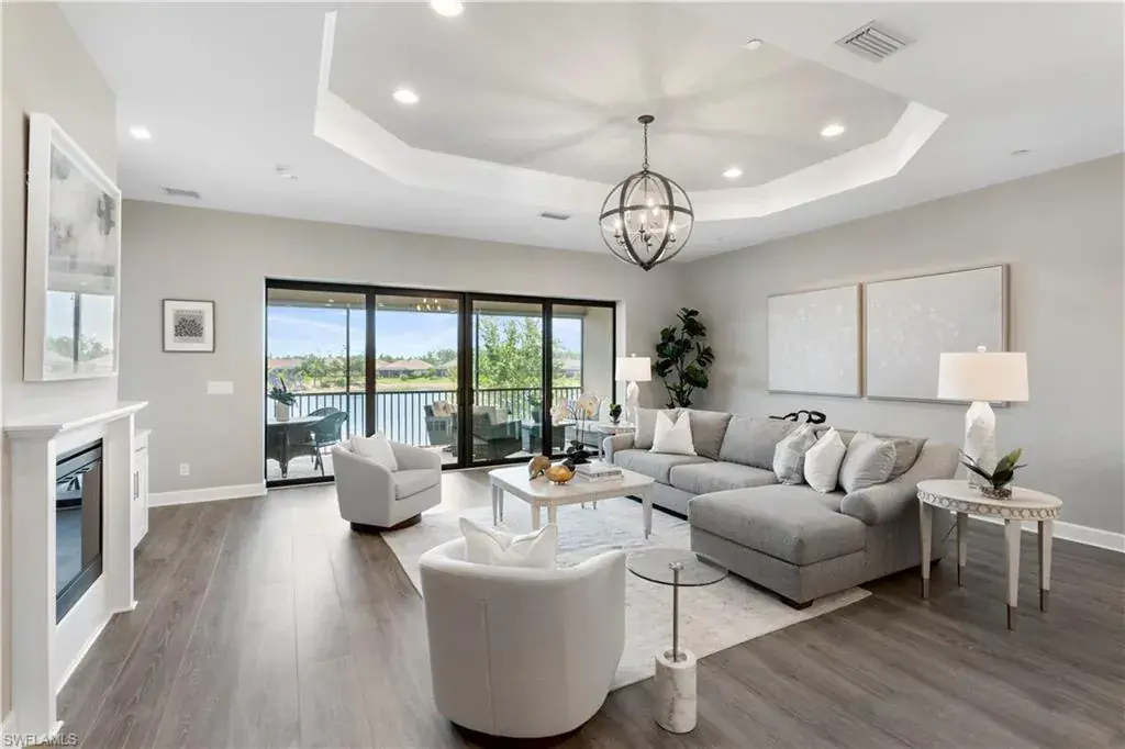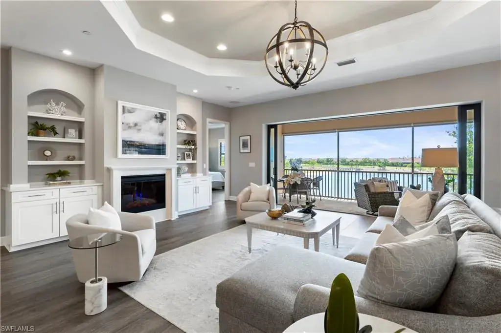 LIVE A VACATION LIFESTYLE IN ESPLANADE! This highly upgraded and immaculate “Bellisimo” 3 bedroom, 2.5 bath, 2343 sq ft coach home lives BIG with a wide open floorplan with generously sized great room, separate dining room, and spacious kitchen featuring Calacutta Laza quartz countertops, an abundance of cabinetry (with pull outs), pantry with custom shelving, under cabinet lighting, and stainless steel appliances including two wine coolers. Never miss a sunset from the west facing 23’x10’ lanai (with noseeums screens) which overlooks the lake, golf course, and bridge. A long list of special features include: HURRICANE IMPACT WINDOW/DOORS; 16’ pocketing sliding glass doors to the lanai; great room feature wall with LED fireplace, cabinetry, and shelving; luxury laminate flooring throughout the common areas and bedrooms (no carpet); white shaker style cabinetry with quartz countertops throughout; plantation shutters on all windows; custom dry bar with wine cooler; master closet, pantry, & storage closet custom shelving; crown molding & custom millwork feature wall; frameless glass shower enclosures; and more! This property is being sold partially furnished! Just one building away from the Montelanico pool! This property comes with a CLUB/SPORTS MEMBERSHIP which offers full access to all of Esplanade G&CC amenities including limited golf opportunities (2 day advanced tee times throughout the year). Esplanade is a true “Lifestyle Community” with something for everyone: resort pool complete with cabanas & poolside “Bahama Bar”; tennis; pickleball; bocce; Koquina Day Spa; fitness center; dog park; 14 miles of trails; 18 hole private golf course; restaurant, bar, wine tasting room, wine lockers, & Starbucks style cafe! Total monthly HOA/Club/Condo dues just $950/month which includes water/sewer, building insurance, building maintenance, and access to all of Esplanade’s resort style living amenities! Add this property and Esplanade Golf & Country Club of Naples to your list today!