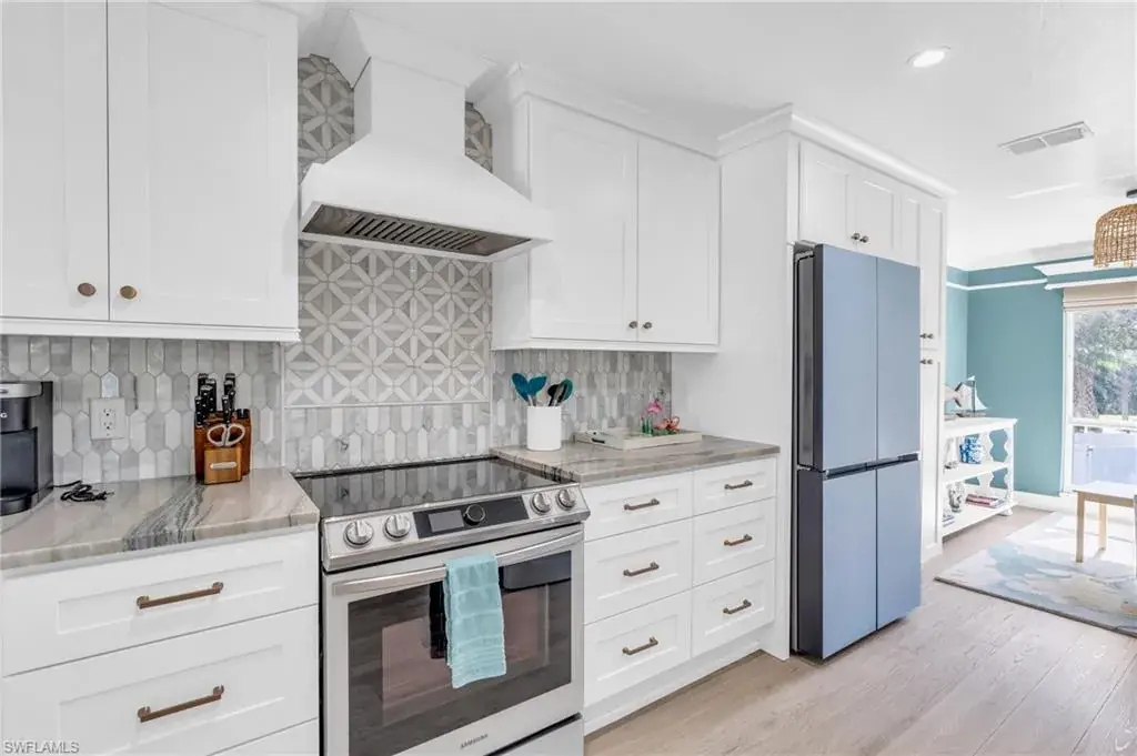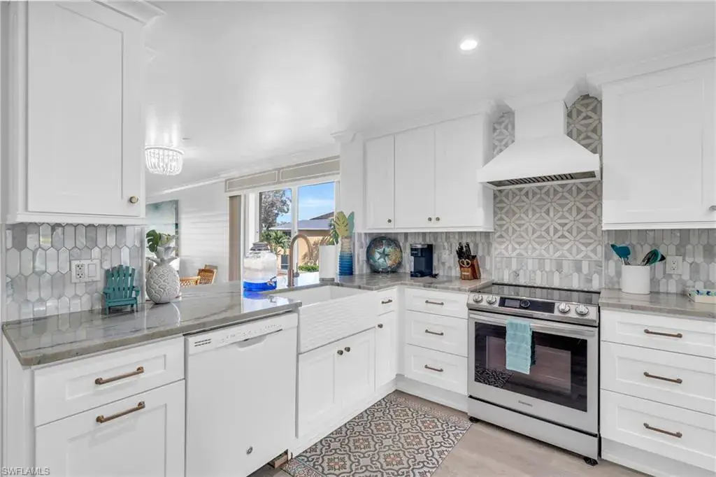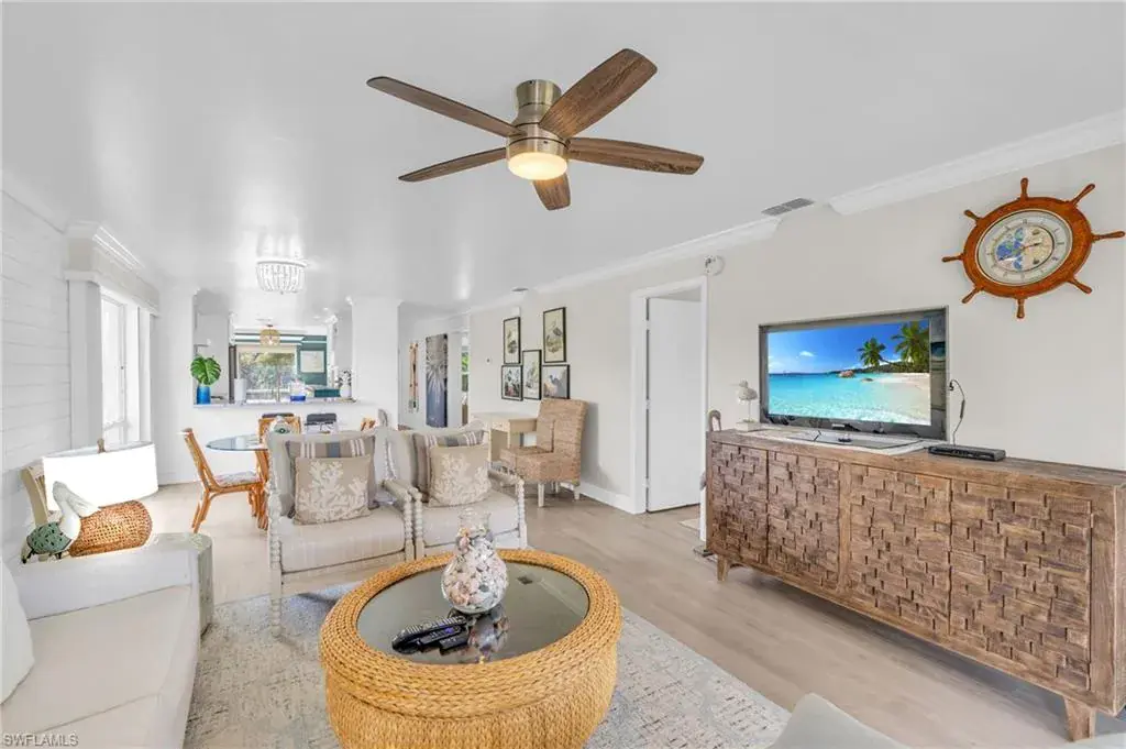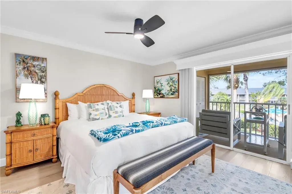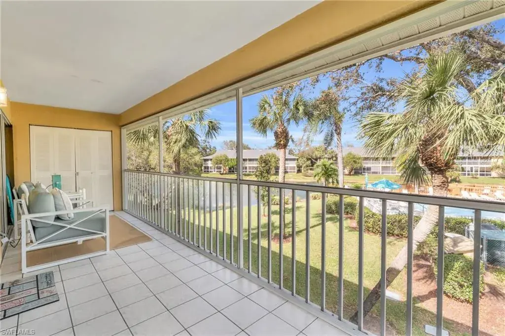 BEAUTIFULLY UPDATED UNIT WITH FOUNTAIN VIEWS! Discover refined living in this beautifully furnished residence, brimming with upgrades and stylish details throughout. The heart of the home features a sleek kitchen with quartz countertops, a panel refrigerator, and all-new appliances, complemented by a farm sink with a decorative front. Luxury vinyl plank flooring flows seamlessly into the open living and dining spaces, creating an inviting area with views of the pool and fountain. The dining room boasts a large window, while the living room offers easy access to the spacious lanai, complete with an outdoor closet. The guest room, adorned with shiplap and a large closet featuring an organizational system, provides an ideal retreat. For privacy and comfort, there’s a dark-out shade and decorative encasement on each window, with custom shiplap and decorative boxes accenting every room. The primary suite includes a private exit to the lanai, a walk-in closet with a storage system, and an updated bath showcasing a tropical-inspired shower with aqua tile, chrome fixtures, and a quartz-topped vanity. Enjoy the convenience of a dedicated laundry area and an owner’s closet, along with recent upgrades, including a re-piped unit, HVAC from 2017, and a 2023 water heater. Residents have access to a poolside grill area, and there’s ample parking with a designated space and guest spots. With an array of luxurious features and modern touches, this property is truly a hidden gem awaiting its next owner. Located in North Naples, Imperial Golf Estates boasts a private 36-hole golf course surrounded by four pristine natural preserves, five sparkling lakes, and six beautifully maintained parks. With close proximity to stunning Naples beaches and nearby state parks, this community offers an ideal location for enjoying the best of Southwest Florida.