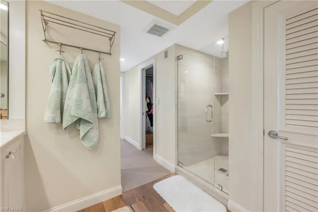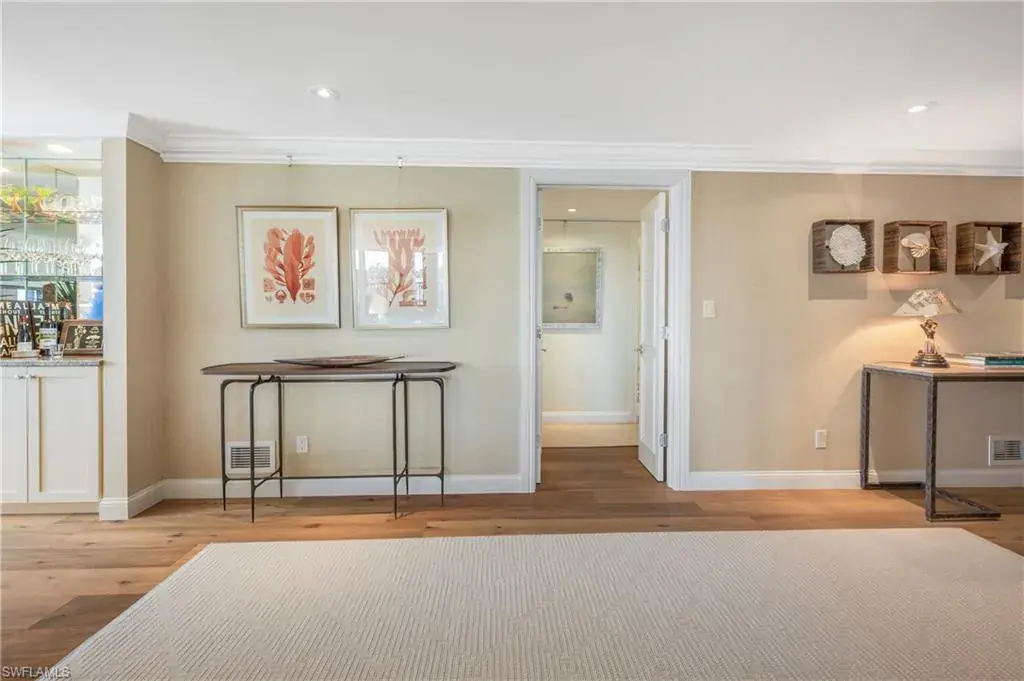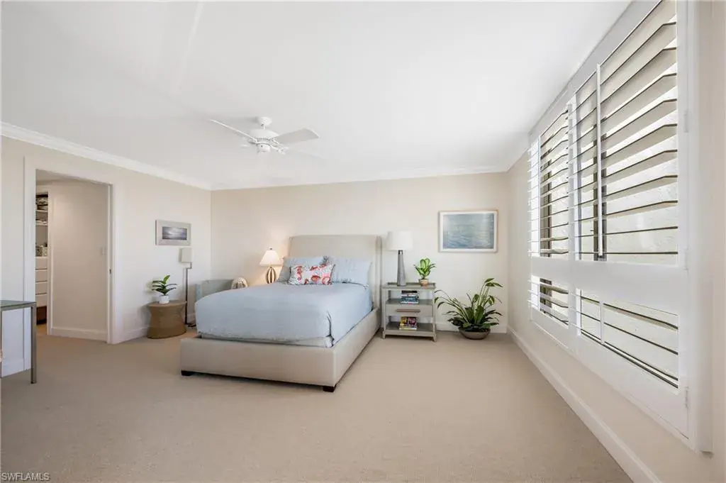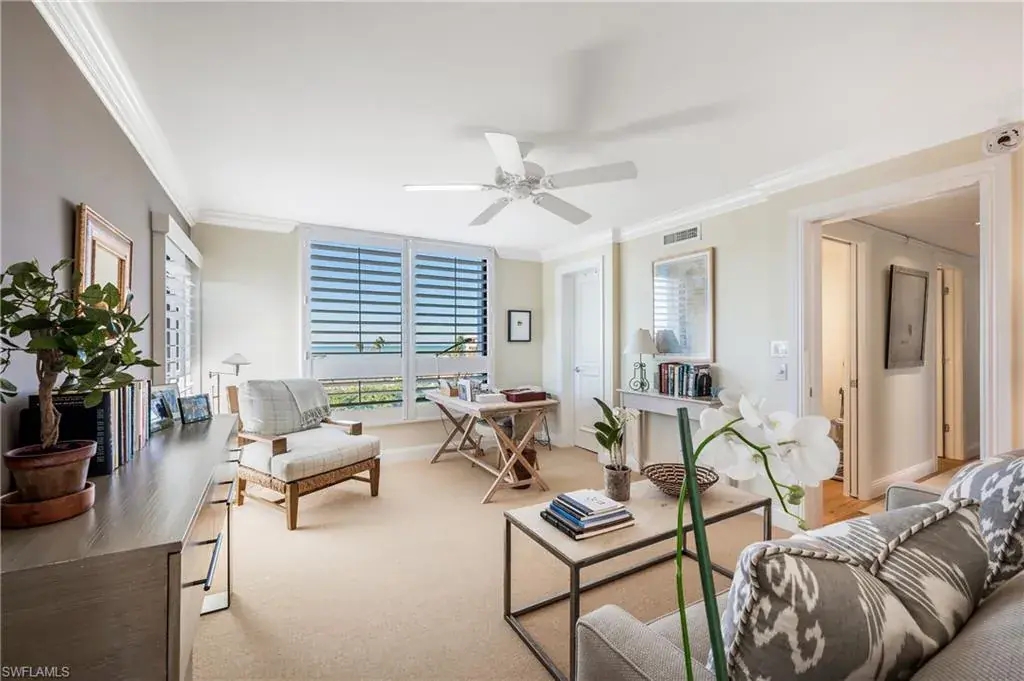 Welcome to the resort lifestyle in the bay and beachfront neighborhood of Admiralty Point. This fifth floor corner home is located on the prime southern side of the building and has panoramic water views of the bay, Doctor’s Pass and the Gulf! See the rising sun and sunsets all from your home while you watch the dolphin and boaters going to and from the Gulf of Mexico. This three bedroom home with an open floor plan, is ideal for entertaining and offers large windows with fantastic natural light. It has been thoughtfully designed with wide plank floors, gourmet kitchen, granite counters, high end appliances, custom cabinets and a cozy banquette by an open balcony. Custom shutters, remote blinds, built-ins, split bedrooms, custom closets all enhance this beautiful home. The primary suite has dual sinks, two walk in custom closets, separate shower and tub. Additional storage and one car garage are attractive features. Admiralty Point sits on 10 acres and has extensive amenities including boat docks for lease, direct beach access, pools (bayside and gulfside), two clubhouses, spa, BBQ, exercise room, Har-Tru tennis courts, shuffleboard, vehicle wash area, and winding paths for all resident’s enjoyment. Located between 5th Avenue and Venetian Village it is close to all the top rated dining and shopping pleasures offered in Naples. A wonderful place to call home!