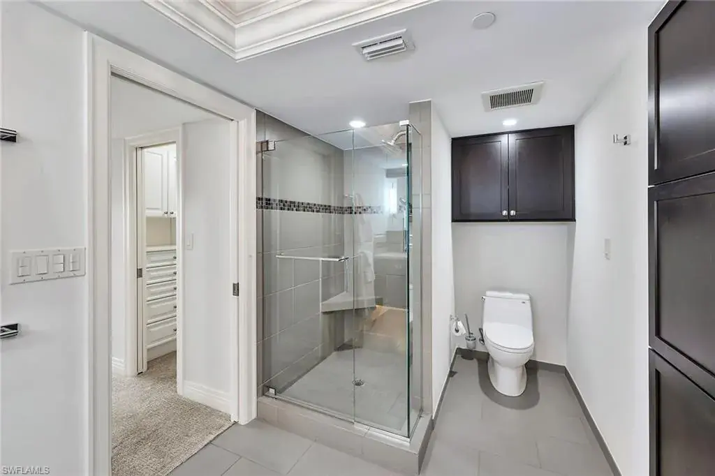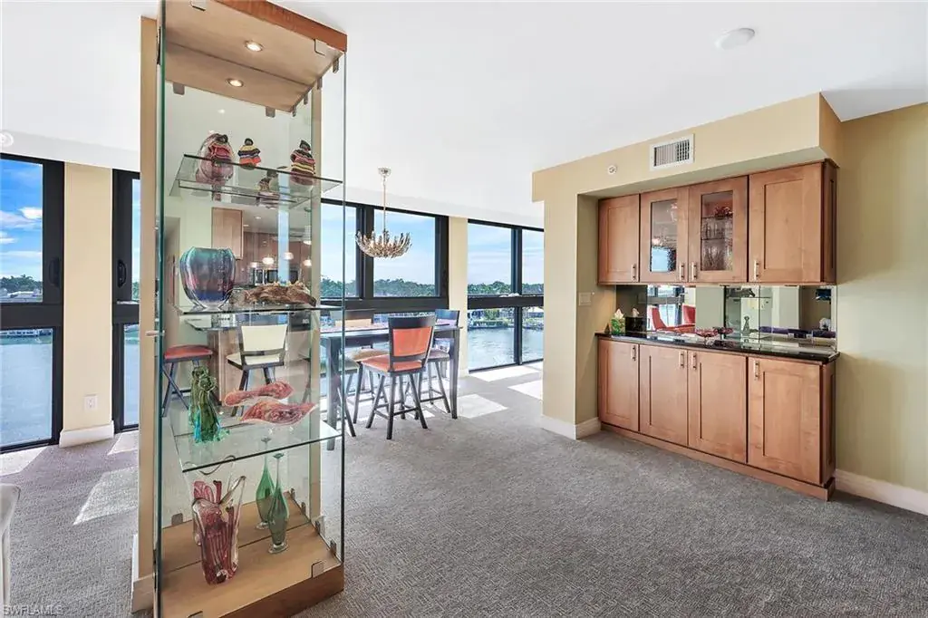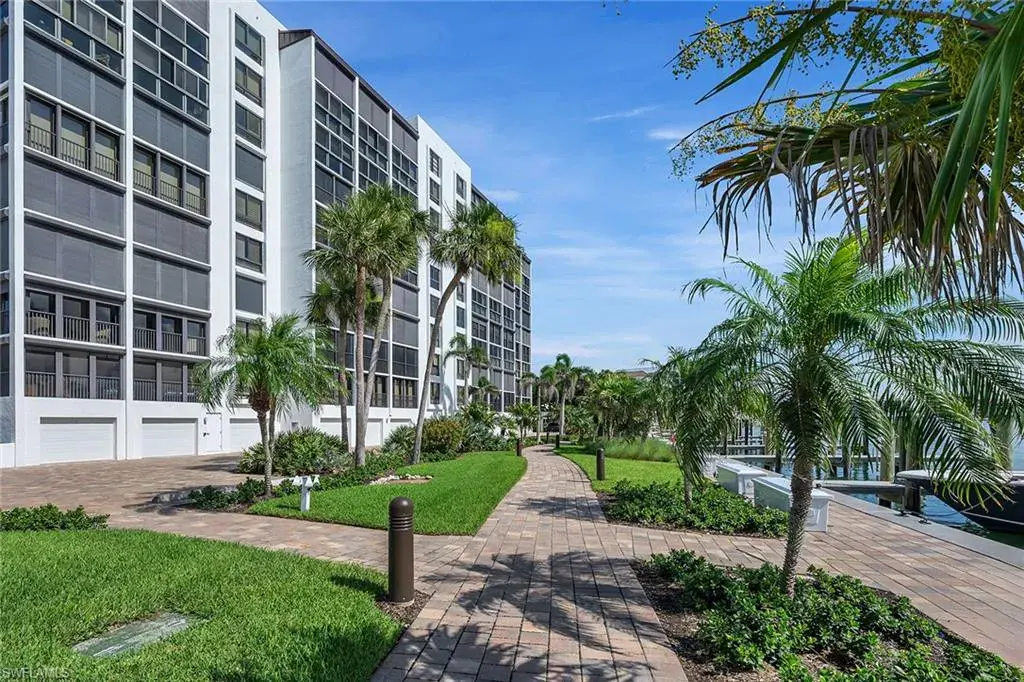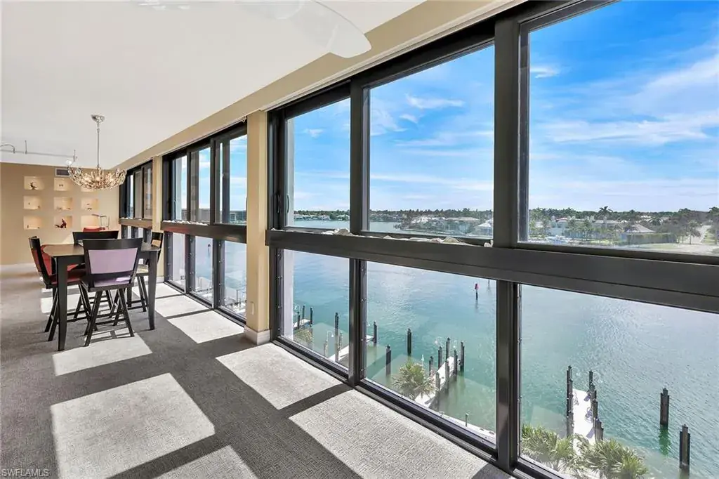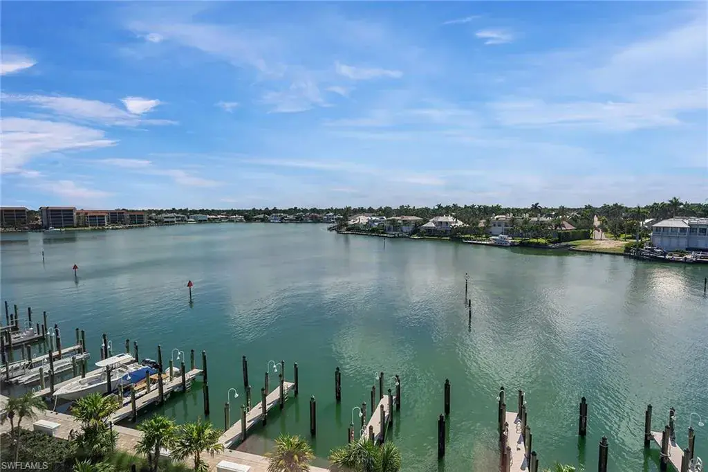 Enjoy sweeping bay views from this fifth-floor residence in the sought-after Admiralty Point II. This highly remodeled spacious two-bedroom, two-bath plus den condominium offers approximately 1,948 square feet of living space with a split-bedroom floor plan, large living and dining area, and a kitchen featuring stainless steel appliances, electric cooktop, and a breakfast bar and beautiful cabinetry. The primary suite includes dual sinks, a separate tub and shower, and two walk-in closets. Additional features include in-residence laundry and a private garage attached to the building. Admiralty Point is a gated, amenity-rich community offering beach access, two community pools, spa/hot tub, fitness center, har-tru clay tennis courts, fishing pier, kayak launch, extra storage, shuffleboard, and dock lease options with electric and water available. Admiralty Point” an exceptional and private 10-acre enclave at tip of Gulf Shore Boulevard with Doctors Pass, Moorings Bay and the Gulf Of America surrounding the property.