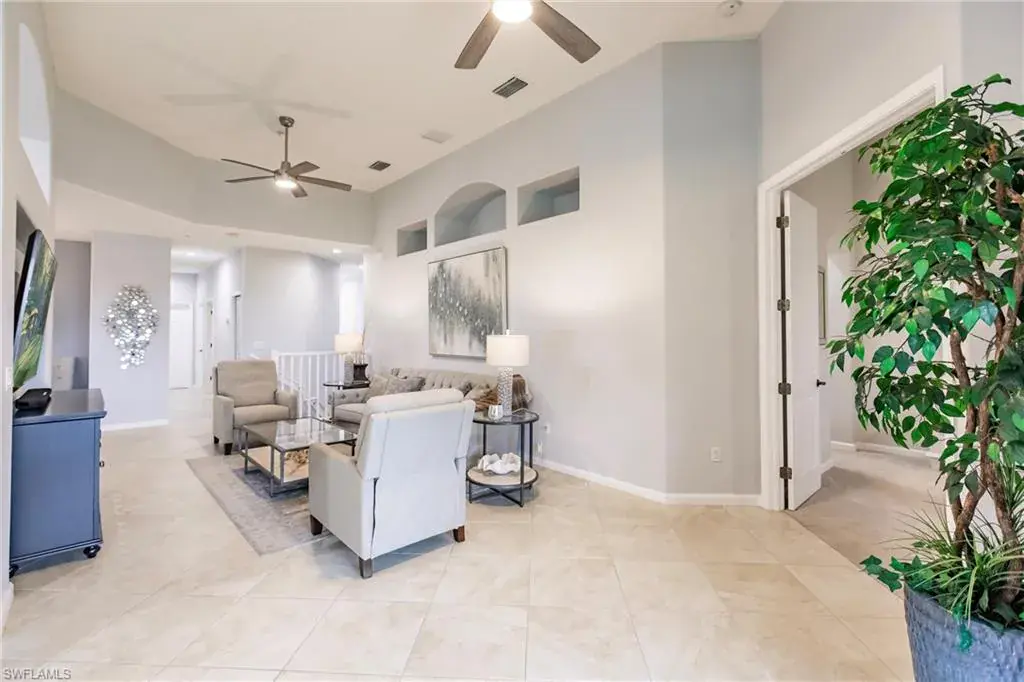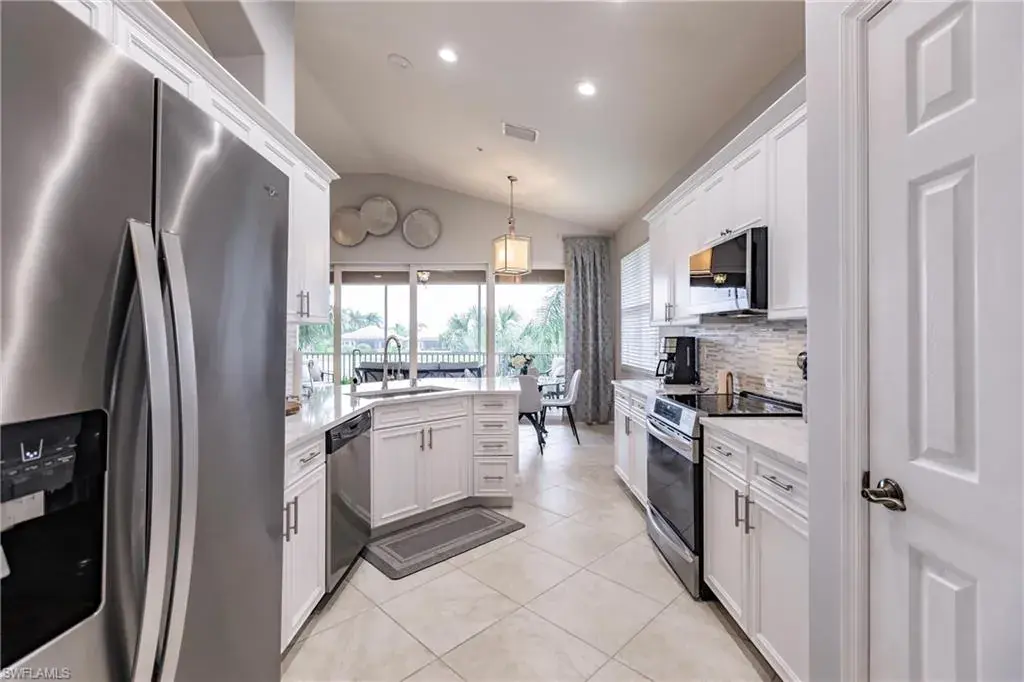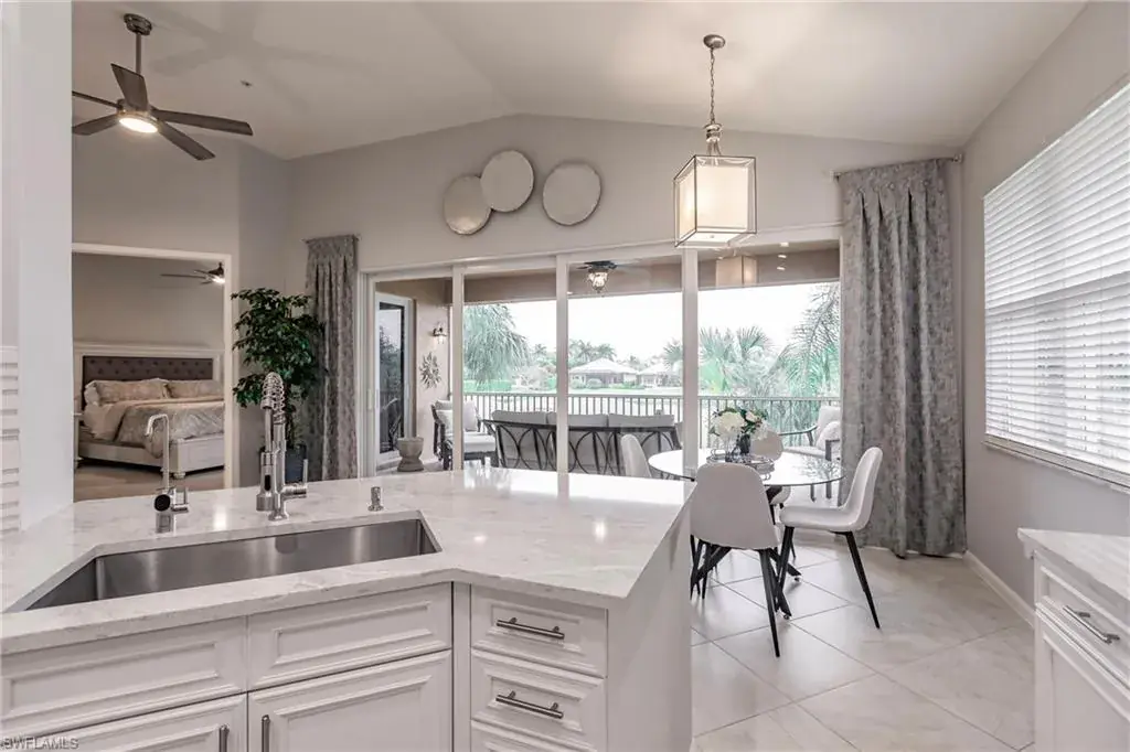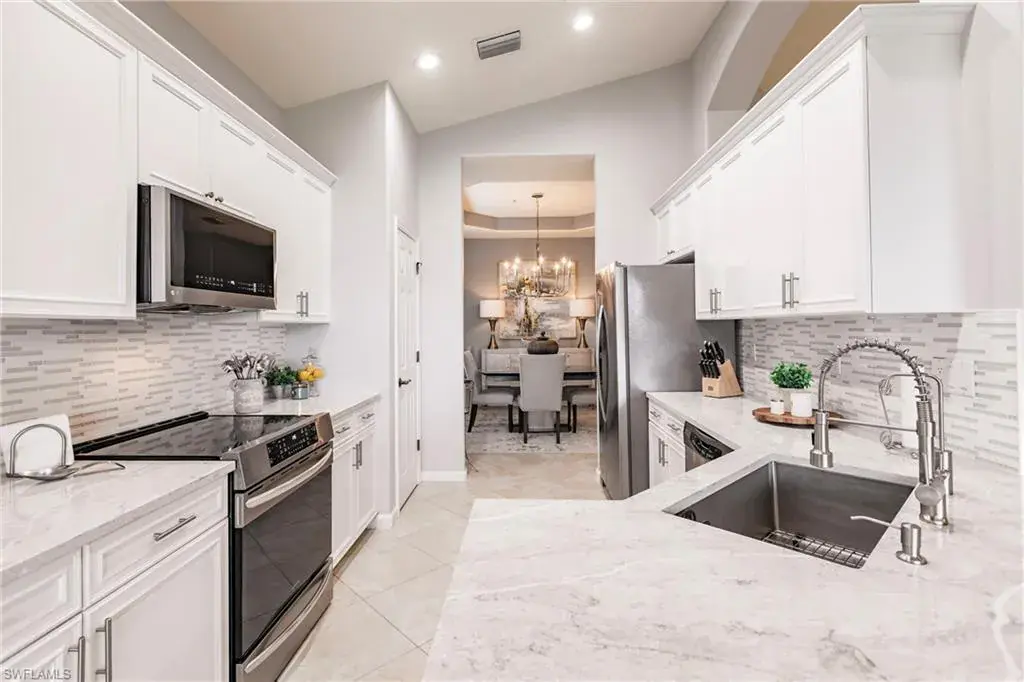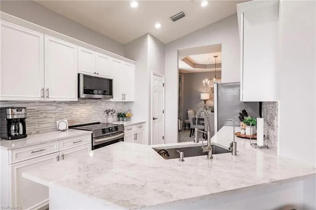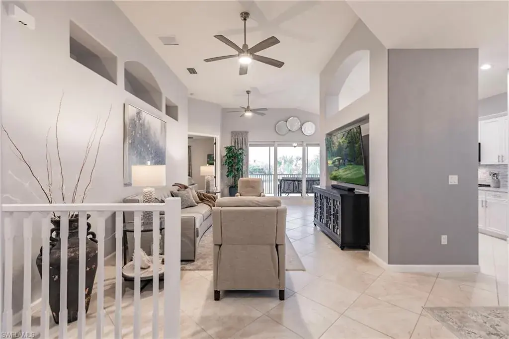 Offering over 2000 sq ft of spacious living & vaulted ceilings w/ 3 bedrooms, 2 bath & attached garage. Boasting of its oversized tile lanai w/ exquisite views overlooking the 9th hole of The Classics golf course plus a pristine view of the fountain & lake. This is the perfect getaway w/ maintenance free living. Located in Alden Woods, the LOWEST association fees in Lely Resort plus they have their own clubhouse, gym & luxury Freeform pool….just steps away from the unit! This home is loaded with upgrades such as a beautiful remodeled kitchen with quartz countertops plus new appliances & offers an induction stove, NEW 2 stage Lennox AC, NEW Rheem platinum model water heater, NEW garage door opener, NEW reverse osmosis tankless water purifying system, all lighting is upgraded to LED technology, NEW ceiling fans, impact windows & doors & much, much, more!