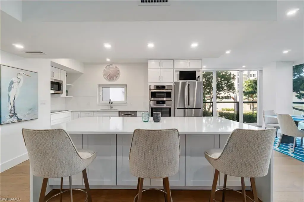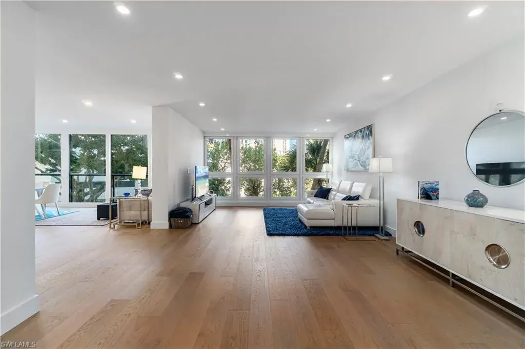 An extraordinary beachside opportunity on Gulf Shore Blvd! This 2,200 sq. ft. furnished residence in the prestigious Allegro of Park Shore offers modern coastal elegance just steps from the sand at only $590 per sq. ft. – one of the best values in Park Shore. The open floor plan features a sleek kitchen with Bosch appliances, quartz countertops, a large waterfall island, and canned lighting throughout. Finishes include wide-plank wood flooring, new drywall, wiring, plumbing, water heater, hurricane-rated sliders and windows, motorized shades, a spacious primary closet, and a large laundry room. Very large storage room located just outside unit.