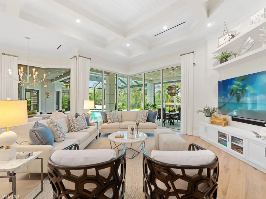 Located in the beautiful golf & country club community of Mediterra in Naples that offers a newly renovated private beach club, this totally updated estate exudes sophistication from the moment you step through the new rich carved hardwood front door into an ambiance of elegance. The heart of the home, a chef’s dream kitchen, features two expansive center islands, new premium cabinetry and appliances, including a SubZero refrigerator, a Wolf gas range, a wine cooler, a microwave drawer and a charming breakfast nook to the side. Flowing seamlessly from the kitchen, the formal living area is accentuated by a stunningly beautiful stone accent wall with a contemporary linear gas fireplace. In the family room the views are a bonus through the zero-corner sliding doors, inviting the outdoors in and leading to a breathtaking veranda with tasteful wood-planked ceiling. The formal dining room is adorned with custom-milled trim work and detailed tray and coffered ceilings, mirroring the home’s meticulous craftsmanship throughout. New designer light fixtures illuminate the exquisite wood and tile flooring that graces the living spaces. The primary suite, a private sanctuary with a sitting area, exclusive lanai access, two custom walk-in closets with built-ins and two en-suite baths that redefine indulgence, offering separate his-and-hers spaces with luxurious walk-in showers, a soaking tub, multiple shower heads, and a bidet. Designed for effortless indoor-outdoor living, the estate boasts impact windows and doors, a whole-home generator, and hurricane shutter screens for ultimate peace of mind. The outdoor oasis features a resort-style pool and spa with upgraded tile, a spacious covered lanai, a stone-accented fireplace with casual seating, and an outdoor kitchen and dining area—all set against a serene lake backdrop with new landscaping, including avocado trees. A three-car, air-conditioned garage, a comprehensive security system with cameras, linear A/C vents, and meticulously updated ceilings further elevate the home’s grandeur. Mediterra is a prestigious luxury golf & country club community featuring Two championship Tom-Fazio golf courses for avid golfers, a private beach club with restaurant & bar, multiple tennis courts, pickle-ball & bocce, fitness center, pristine bike & jogging trails, and luxurious dining at the private country club restaurant. The Mediterra Beach Club offers an escape to a 10,000 sq. ft two-story private oceanfront paradise on the Gulf of Mexico. Featuring a restaurant & bar that serves members via indoor & outdoor dining, this private facility boasts a heated swimming pool, a sundeck, and cabana beach service for chairs, umbrellas & refreshments.
