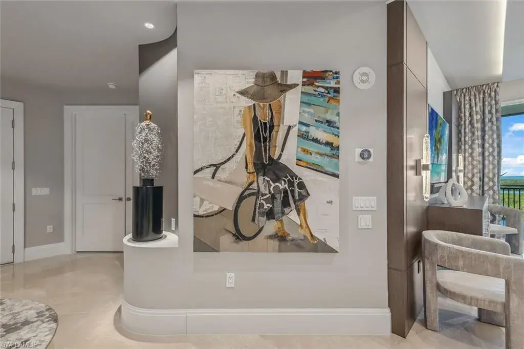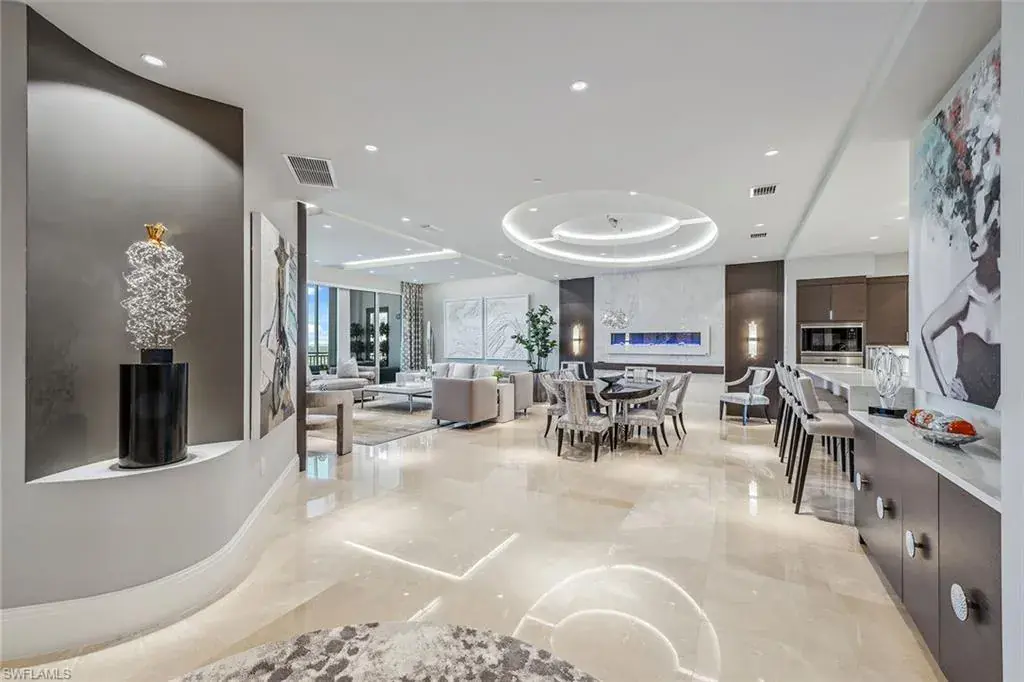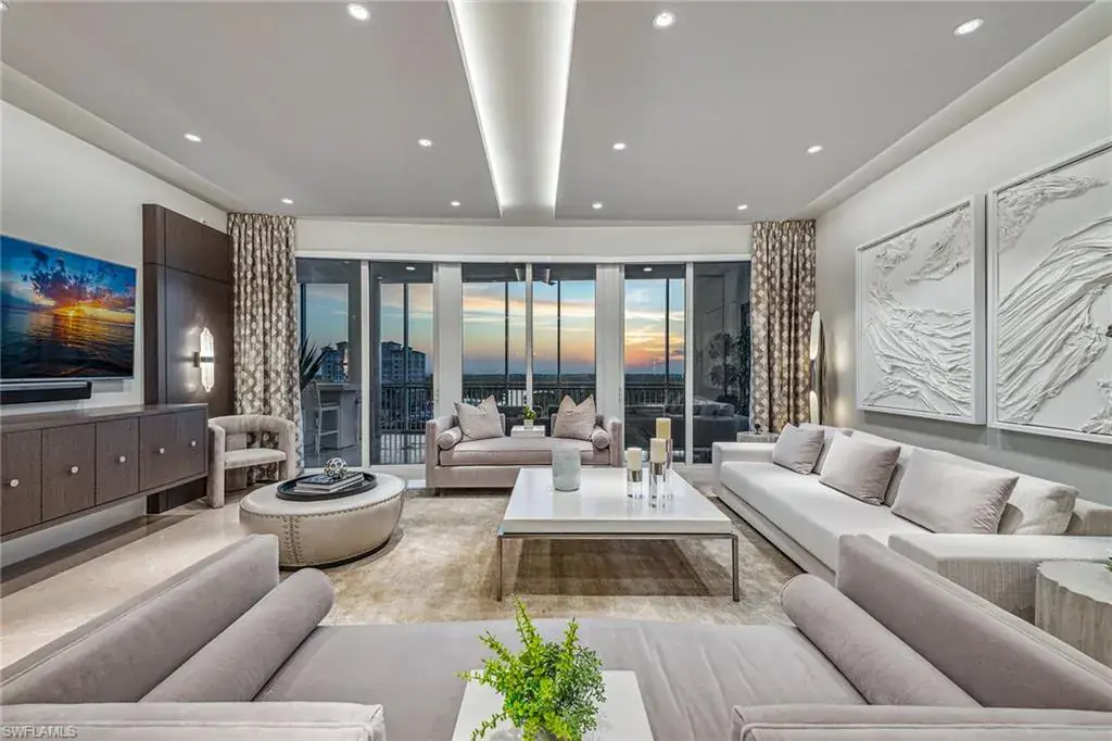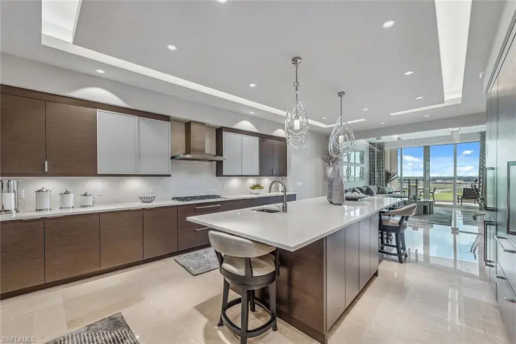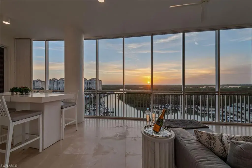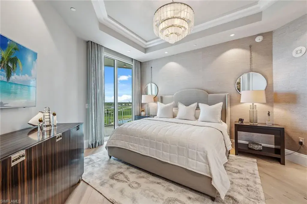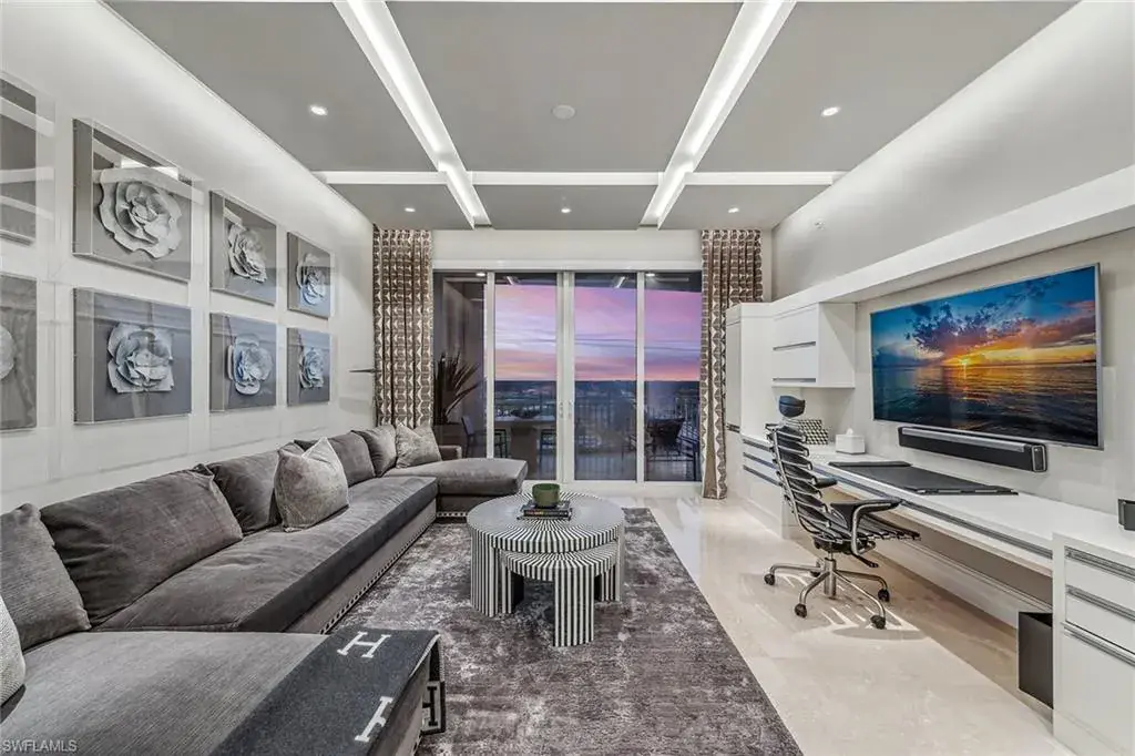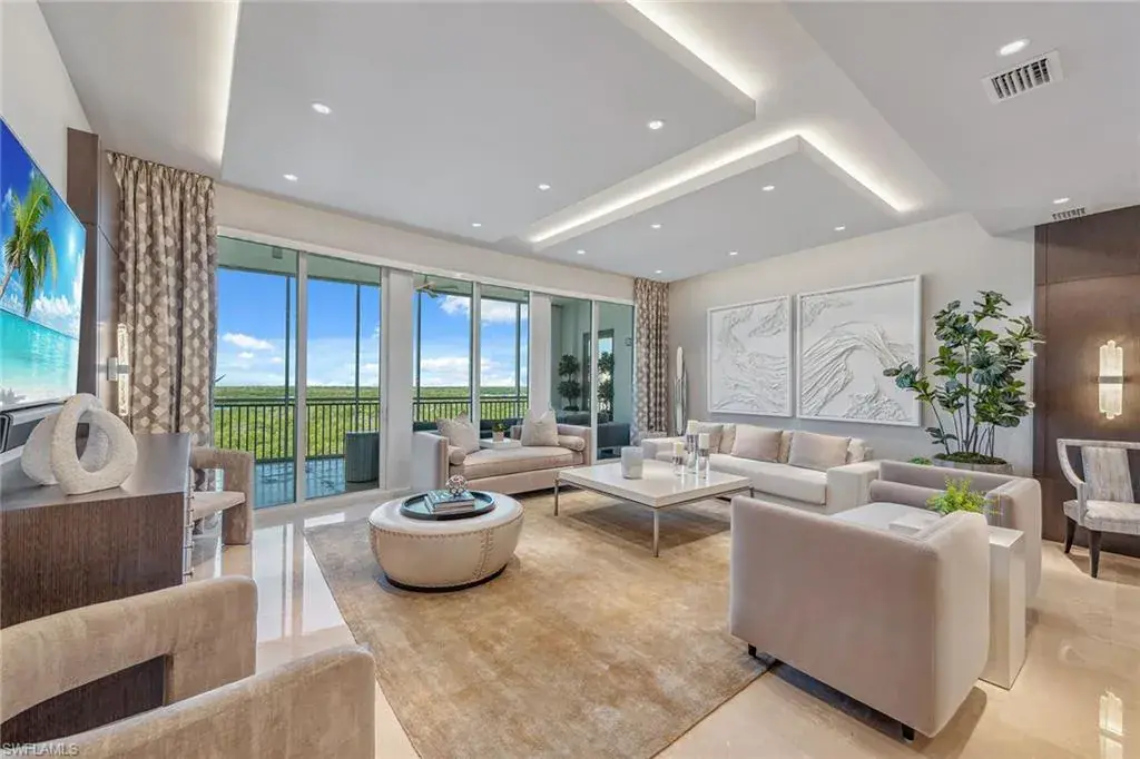 We are excited to introduce you to this exquisite residence in Aqua. This eighth-floor, three-bedroom plus den, 3 ½-half-bath, 3,940 square feet of luxurious living space has breathtaking views of the Gulf to the west and lush green views of the newly constructed Kinsale Golf Course to the east is unique in many ways. This Renee Gaddis meticulously designed residence offers an unparalleled level of luxury and elegance. No expense was spared in bringing in the finest design to afford comfort and sophistication. Enter from your private elevator and be ready to be impressed by the expanse and view of the Gulf and Wiggins Pass. The seamless flow of this residence reflects today’s lifestyle. The designer spacious kitchen and wet bar has beautiful quartz countertops, top of the top-of-the-line appliances and can rightfully be called a chef’s delight. The thoughtfully designed primary suite has spectacular views of the Gulf and includes dual custom-designed closets, a spacious luxurious bath and access to the lanai. You will enjoy the privacy yet natural light of the glass-enclosed office/den offering ample space for relaxation or work. Two spacious guest bedrooms with en suites provide privacy and comfort for your family or friends. The terrace is an outdoor paradise where you can savor breathtaking sunsets, dine alfresco, or simply unwind while listening to the ocean. This home is dripping with style and finesse. Crafted with uncompromising attention to detail, this residence was designed for the most discerning tastes. Aqua is amenity-rich including on-site concierge service, library, two spacious social rooms for casual or elegant entertaining, fitness center, spa treatment rooms, steam and dry saunas, ninth-floor level sky lounge, dog runs, large pool and a private marina. You will not be disappointed!