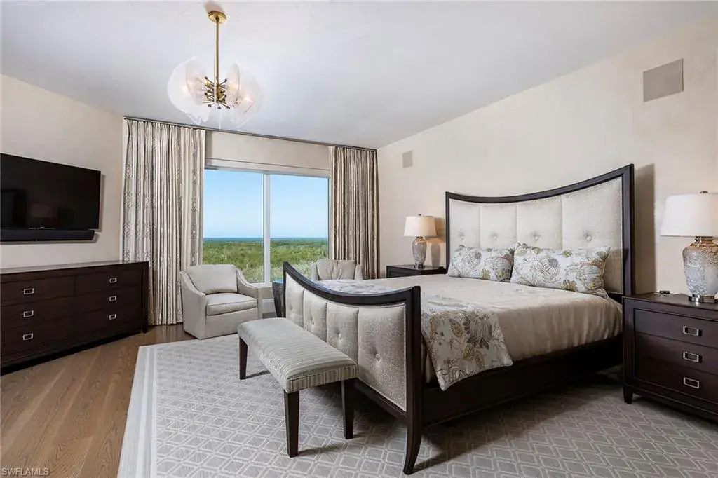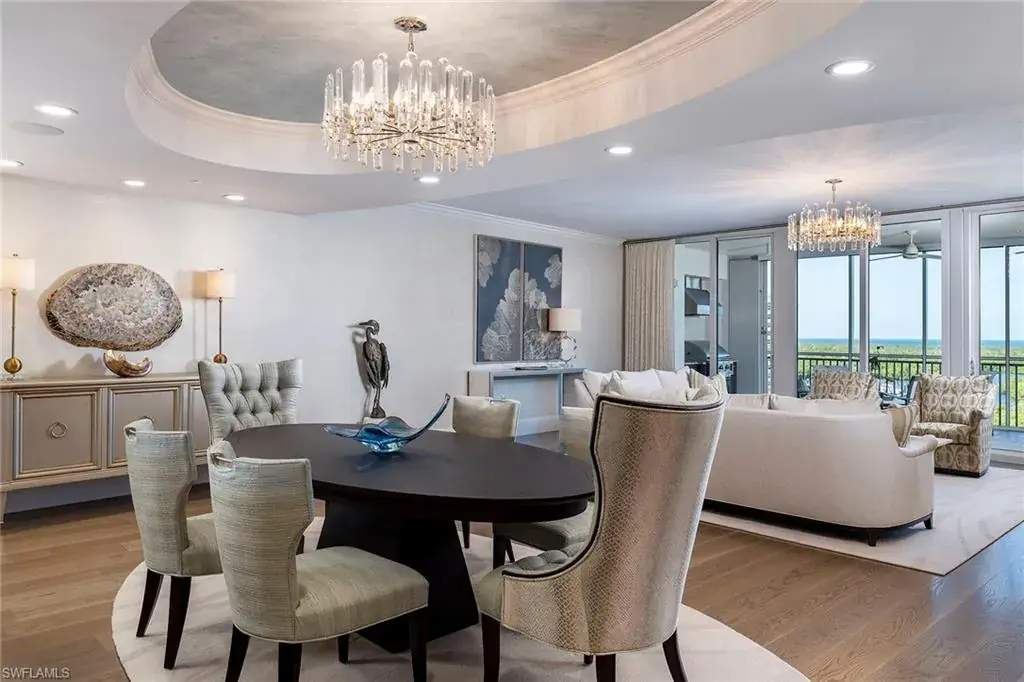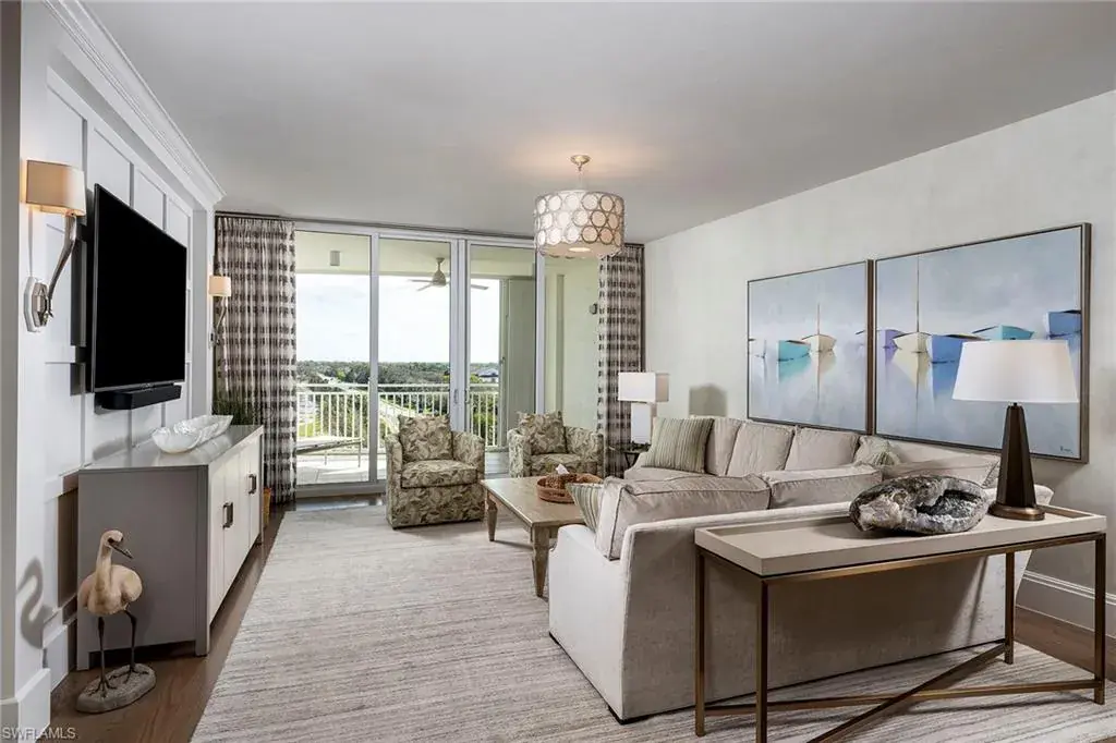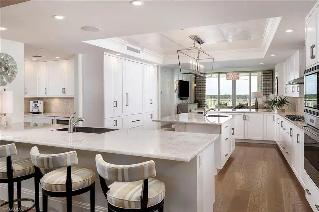 Discover refined living in this immaculately kept luxury condominium. Bathed in beautiful natural light, the home showcases wide-plank wood floors, sophisticated Venetian plaster walls, and 8-foot solid core doors that emphasize quality craftsmanship throughout. The open floor plan is enhanced by 10-foot ceilings with elegant drop detailing to define each space, creating a warm and inviting flow. Entertain in style in the expansive kitchen, with Sub-Zero, Wolf and Miele appliances, a five-burner gas cooktop, two dishwashers, and soft-close drawers and cabinets. With two distinct counter seating areas, meal prep and hosting are effortless. Additional features include a private elevator foyer for an exclusive entrance, Soft-touch Lutron lighting to set the ambiance in every room, a wrap-around front balcony with sweeping views of the golf course and rear screened lanai overlooking the marina, complete with a built-in grill and storm shutters. Enjoy two secured garage spaces and ample additional storage for ultimate convenience. With extraordinary attention to detail and thoughtful design, this condominium is move-in ready and ideal for those seeking luxury, comfort and style in every aspect.