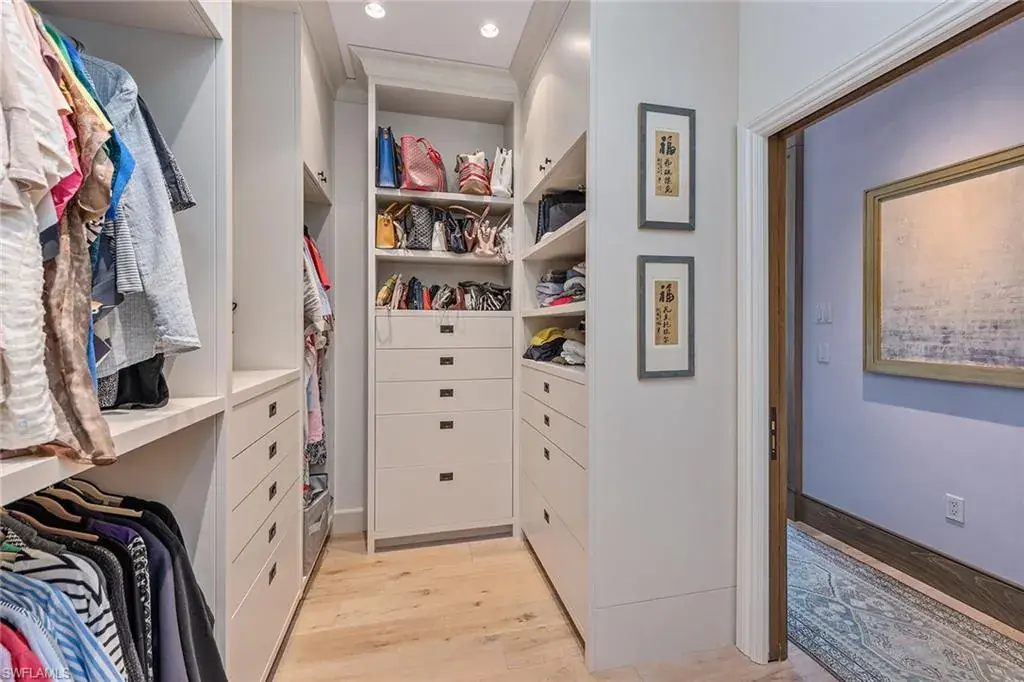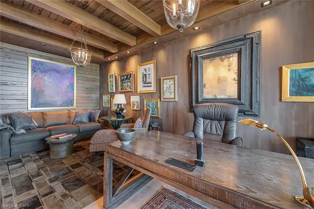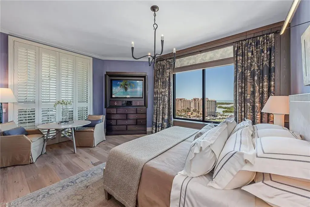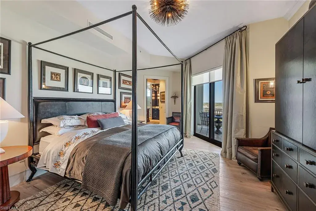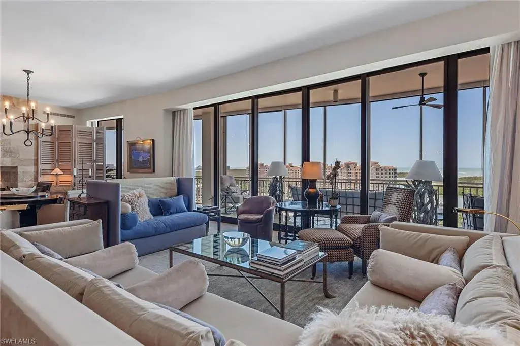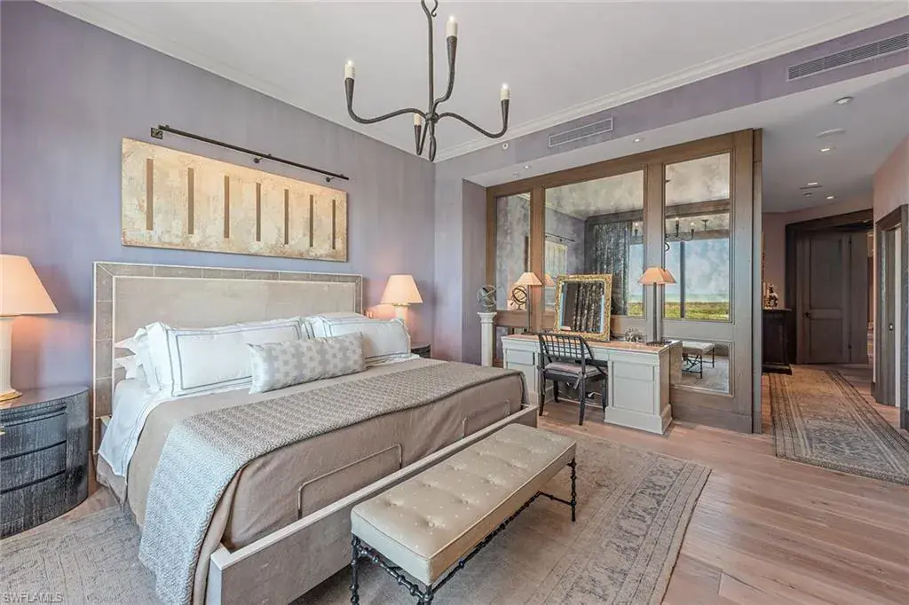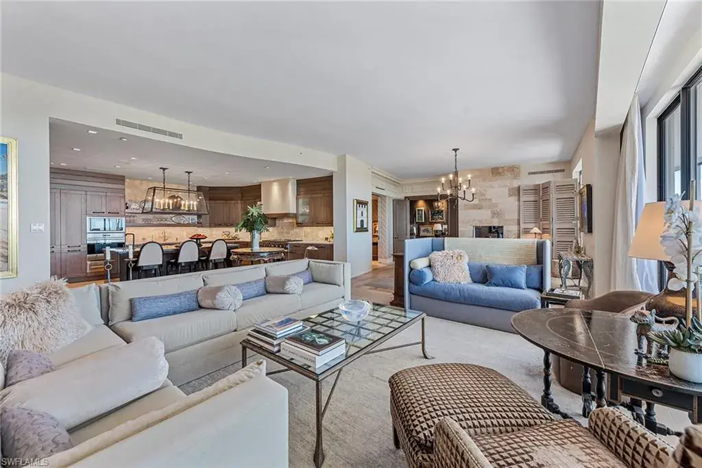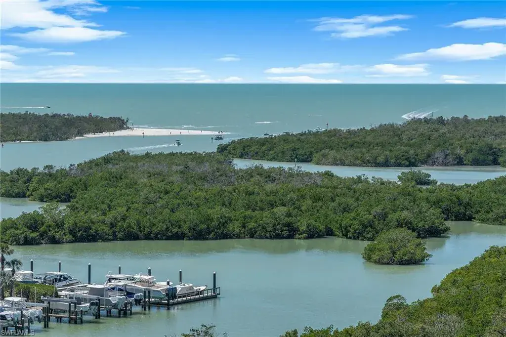 Have you ever imagined living in an estate home in the sky, where panoramic views of the Gulf, Wiggins Pass and the Yacht Harbor surround you? In one of Naples exclusive waterfront enclaves, this extraordinary penthouse at Aqua blends the timeless grandeur of Naples, Italy with modern coastal elegance across 5,400-plus square feet. Expansive east- and west-facing lanais frame vibrant sunsets and serene water views, creating a private sanctuary in the sky. The interiors were masterfully conceived by acclaimed South Carolina designer Eric Keith Brown, blending classical Italian influences, such as Roman architectural nods and barrel-vaulted entablatures, with a refreshing, minimalist backdrop inspired by Florida’s white-sand shores and lush tropical surroundings. From the moment the private elevator opens into the grand foyer, the eye is drawn to sustainable reclaimed oakwood flooring by Paris Ceramics, Pecky Cypress ceilings and wall details, and Ann Sacks marble mosaic flooring. Venetian plaster and mineral-based Australian paints add texture and depth throughout. The living and dining areas open to a covered lanai with travertine flooring and a screen enclosure, blending indoor and outdoor living. Hidden closets, custom drapery, handcrafted bronze lighting and cabinetry by Thomas Riley Artisans Guild complete the home’s refined, bespoke design. The upgraded Lutron QS lighting system enhances the ambiance throughout. The gourmet kitchen centers around a Wolf six-burner gas range, with quartzite countertops, travertine backsplash, floating shelves and wood cabinetry with integrated lighting. Paneled appliances offer a seamless look, while a built-in Miele coffee bar with sink and small appliance counter space adds everyday luxury to a breakfast prep room. The owner’s suite is a tranquil retreat with plantation shutters, wide water views and custom woodwork that echoes classical craftsmanship. A special highlight is the custom Remedium medicine cabinet, Latin for a cure, integrated into the spa-style bath that offers a dual-sink vanity with makeup counter, floor-to-ceiling tiled walk-in shower and soaking tub, complemented by Waterworks hardware, and honed and leathered slab materials. Three guest suites provide privacy and comfort, each with en-suite baths and walk-in closets, two share a private lanai, while a third offers custom cabinetry, a spa bath, and a nearby wet bar and a private lanai. The theater room, finished with handcrafted Italian leather walls and ceilings, provides sound absorption and Fortuny fabric sliding doors, creating a dramatic retreat complete with its wet bar. Additional spaces include an office and a versatile flex room. Aqua at Pelican Isle delivers a resort-style experience with a private marina, fitness center, golf simulator and 24-hour concierge, all just minutes from Naples premier beaches, dining and shopping. This penthouse combines elegance and modern design so schedule your showing.