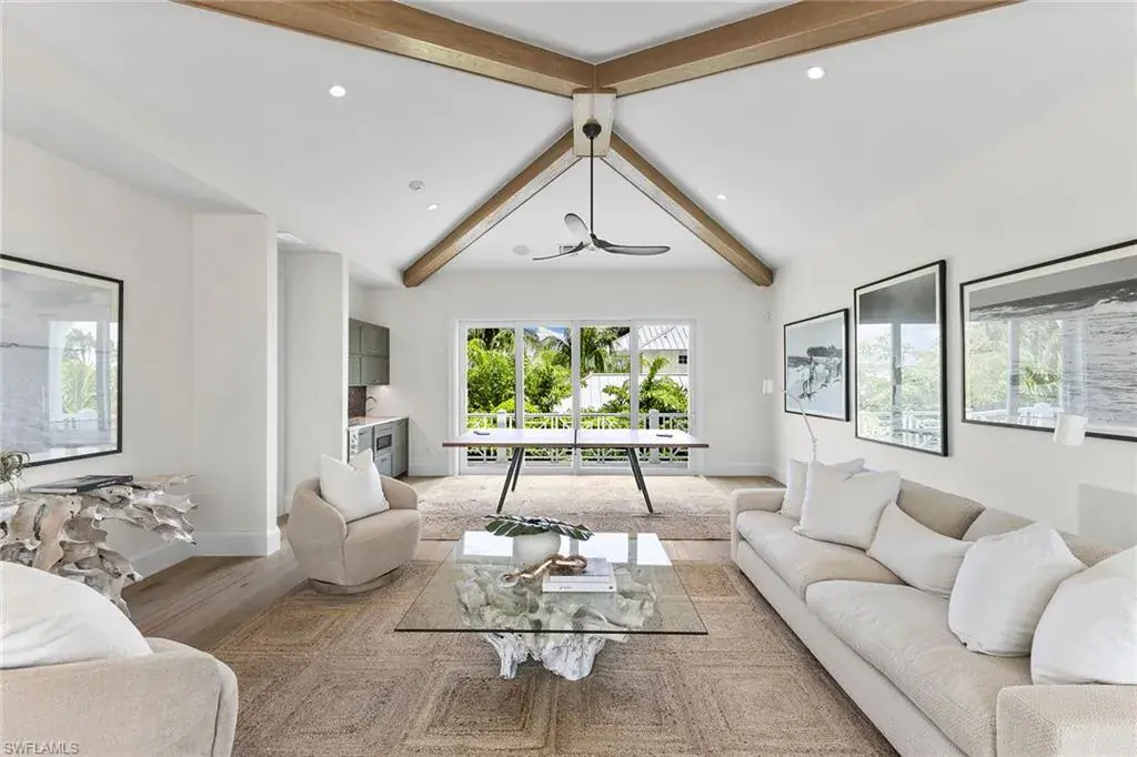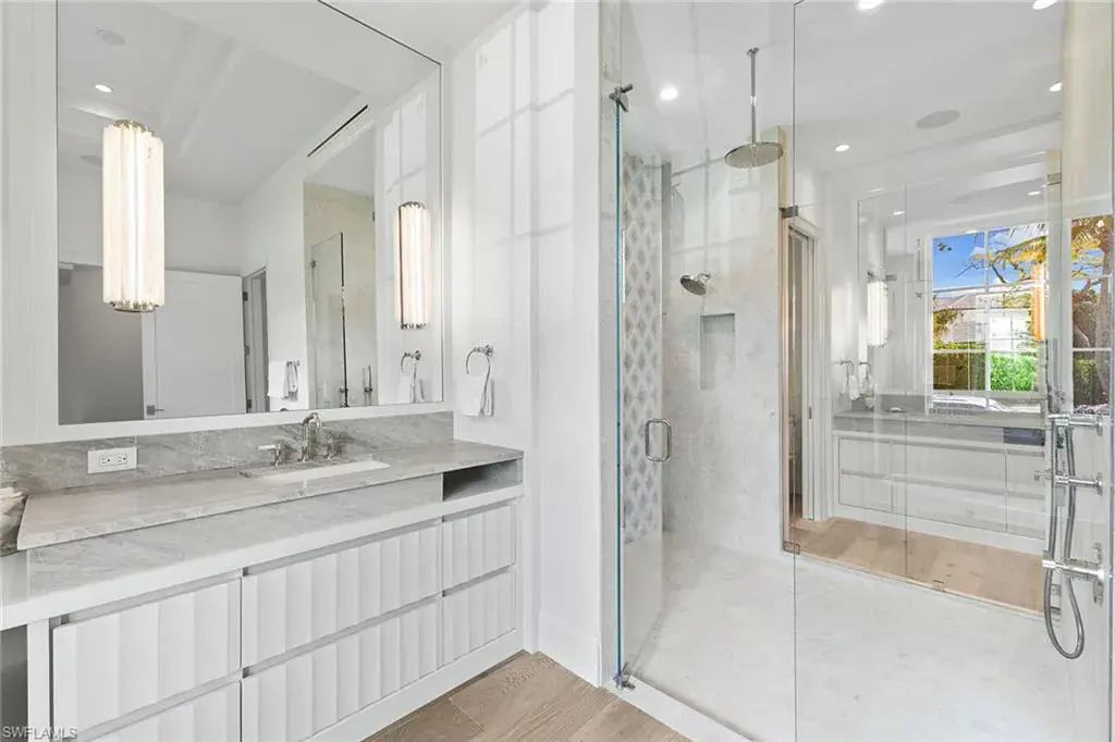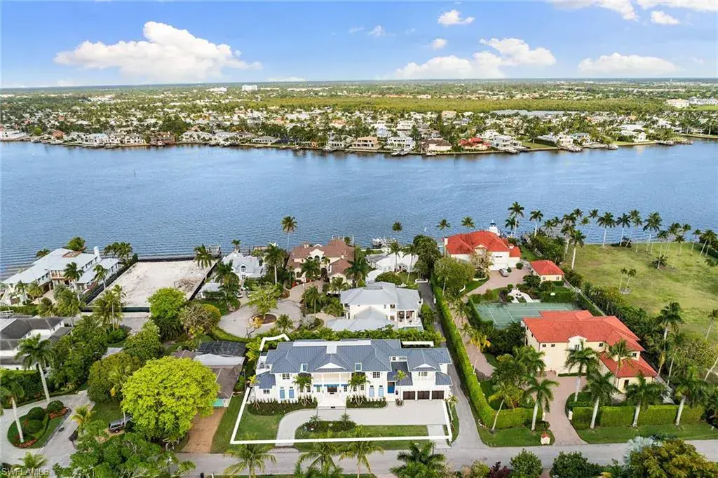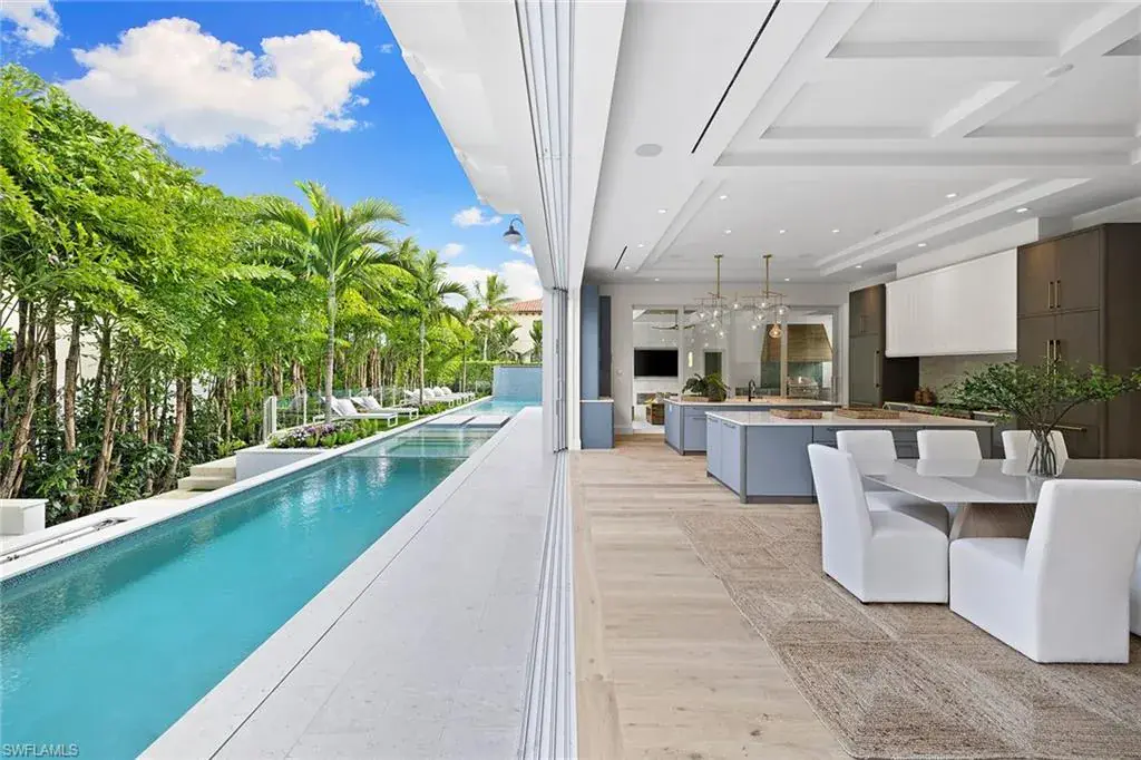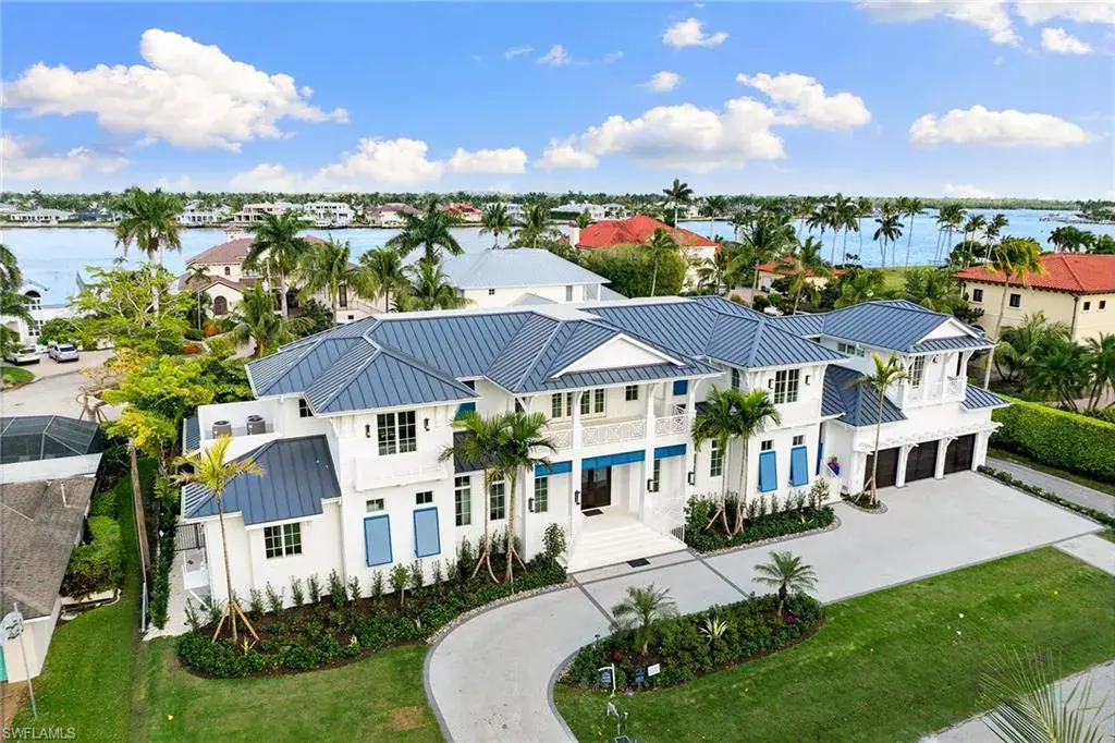 New Aqualane Shores estate situated along one of Naples’ most private streets in the heart of downtown. The six-bedroom, eight-bath, Caribbean-inspired design features two swimming pools, an interior second-floor sleeping porch, oversized balconies, decks and a private cabana suite. Entertaining at home is effortless in the combined great room, dining area and kitchen. Expansive sliding doors open from the kitchen directly to the outdoor living, dining and alfresco kitchen and grill, creating a seamless transition. The primary suite showcases a generous dressing room with wraparound closet. The first floor includes a wine room, elevator, study with private exterior entrance, laundry room, butler’s pantry, powder room and a three-car garage. The great room leads to a lap pool with sun shelf and flush spa, perfect for a morning swim. A second pool with sun shelf and water feature is surrounded by a tropical environment for ultimate privacy. The second floor hosts four en-suite guestrooms with walk-in closets. A detached sixth bedroom is located above the garage with a private entrance and front balcony. Deeded boat dock accommodates a 30-foot boat with direct access to Naples Bay included just steps from the residence. Built by Waterside Builders, designed by MHK.