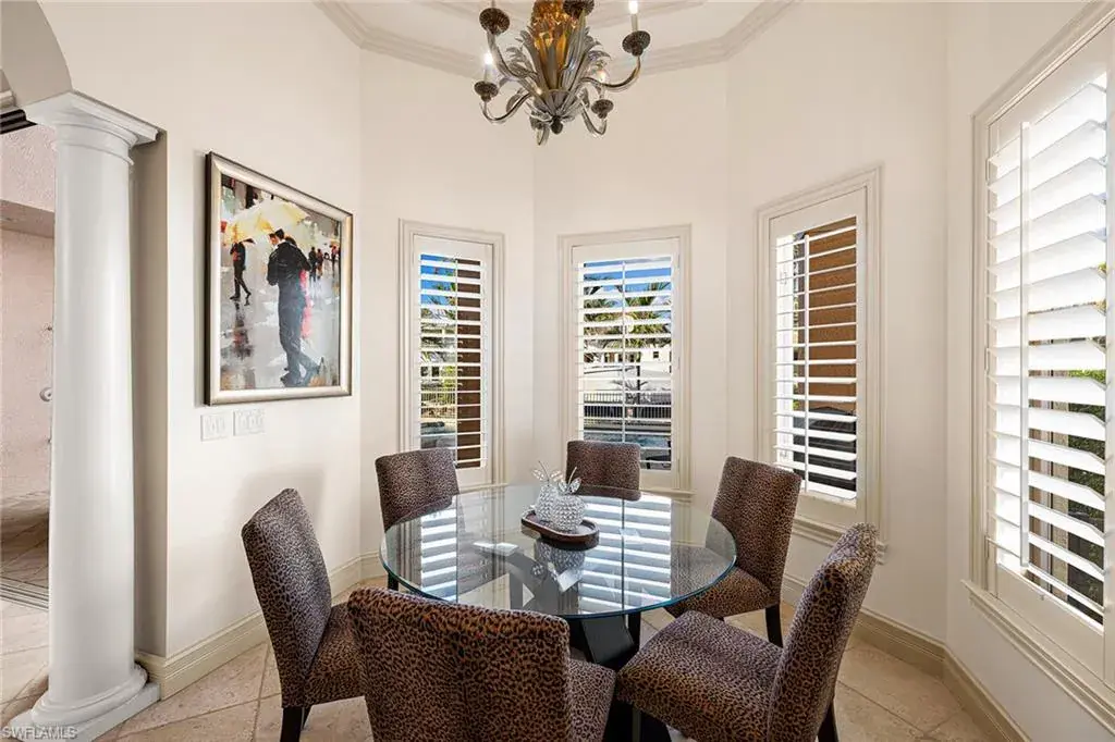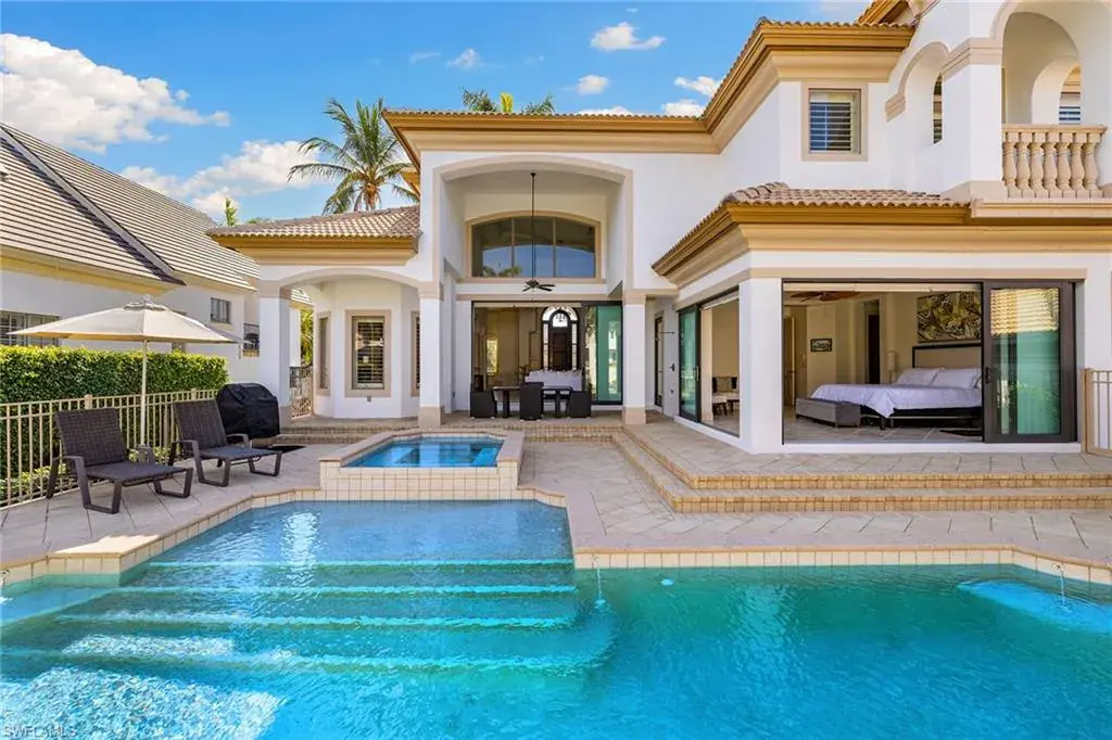 Located just around the corner from Third Street South, this waterfront home offers the perfect blend of convenience and luxury, with dining and shopping mere steps away. A boater’s paradise, it features a deep-water 24,000 lb lift, a coveted 22×29 covered boathouse with an additional 16,000 lb dual lift, and direct Gulf access. Step inside to discover a serene retreat, where a two-story family room flows effortlessly to an expansive pool deck, bordered by low-maintenance synthetic turf. The master suite includes a luxurious master bath with dual vanities, a soaking tub, shower and two walk-in closets with custom built-ins. The gourmet kitchen boasts granite countertops, high-end appliances, and exquisite custom woodwork. Upstairs, find three additional bedrooms and a second-story loft, perfect for versatile living. Additional features include a three-car garage, a Lutron lighting system, including automated shades and thermostat controls. Sea wall cap, sea wall tie backs, new dock and lift all added in 2020. The exterior was painted in 2025 and the interior was painted in 2023. Experience the best of Naples waterfront living, just moments from dining, shopping, and the beach.