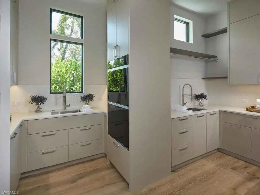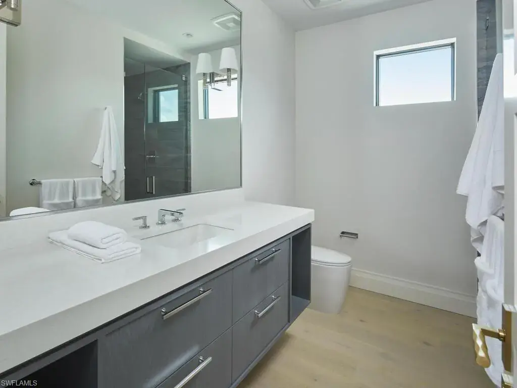 Contemporary windows provide natural light throughout, illuminating a fresh palette of crisp grey hues, clean lines and custom finishes including wide plank French oak flooring. Additional amenities include a completely finished Butler Pantry, elevator, summer kitchen, spa, waterside fire pit with built-in seating, first and second-floor laundry, smart home features and a 3-car garage with lift capacity and generator.