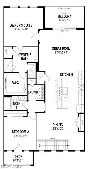 The Seabright floor plan with West Indies elevation is a beautifully designed second-floor coach home offering 1,480 sq. ft. of living space with 2 bedrooms, 2 bathrooms, a 1-car garage, and a screened lanai. Perfect for everyday living or entertaining guests, this bright and airy layout highlights platinum level finishes with White Linen cabinetry, Calacatta Arno quartz countertops with gray veining, and a glass-tile backsplash that ties the kitchen together.