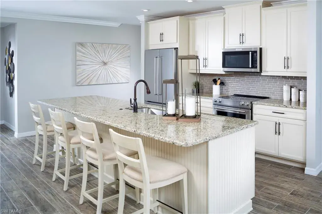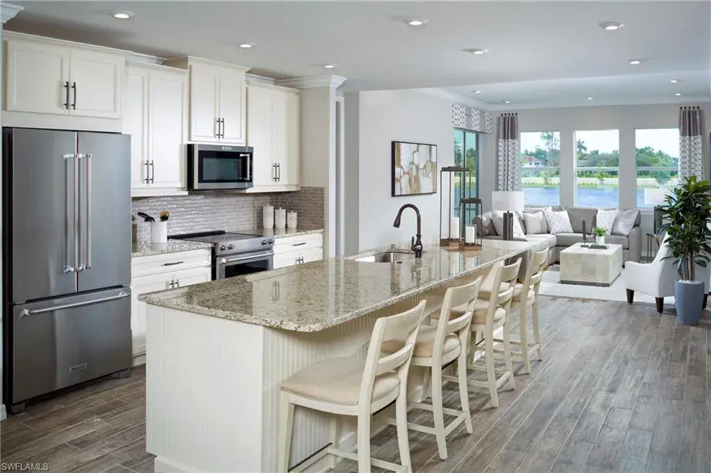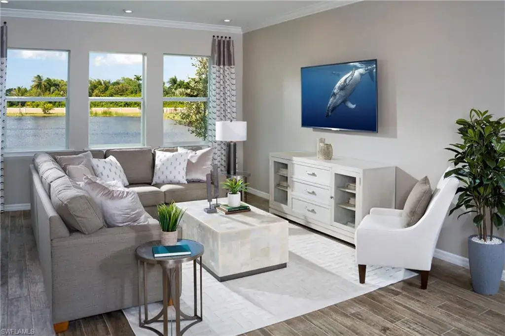 Amazing West Facing waterfront view, walking distance to the amenities this is one you don’t want to miss — The Delmar coach home is a 1st floor center unit (1,341 sq ft under air) home designed to enhance your lifestyle. Featuring Smart Home Technology, 2 bedrooms, 2 baths, and a 1-car garage, upgraded design package, this open and airy floor-plan has a natural flow that lives like a single family home. A beautiful designer kitchen with 42″ Wood Linen Painted Shaker Cabinets, White/with lightly marbled quartz counter top and a glass backsplash to tie it all together. A large island with breakfast bar has room for 5-6 . The kitchen overlooks the airy Great Room that is highlighted by expansive sliding glass doors that lead to the covered, screened lanai. The owner’s suite is spacious and adjacent to the private owner’s bath with a walk-in closet, glass enclosed shower and a raised height vanity with dual sinks. The guest bedroom is adjacent to the 2nd full bath and away from the primary bedroom providing privacy to both. Direct access to the home is provided through the covered porch or through the garage. This is a smart home featuring a voice doorbell, ClareOne touchscreen keypad and Ecobee smart thermostat that will work with Alexa. Shopping centers, restaurants, recreational facilities, beaches, and schools. Pricing, dimensions and features can change at any time without notice or obligation. Photos, renderings and plans are for illustrative purposes only, and should never be relied upon and may vary from the actual home. The photos are from a furnished model home and not the home offered for sale. within minutes to Downtown Naples, Restaurants, Beaches, Art District, I-75, Shopping and entertainment.