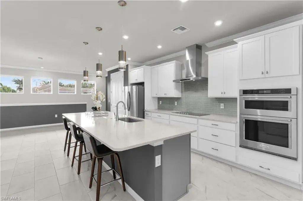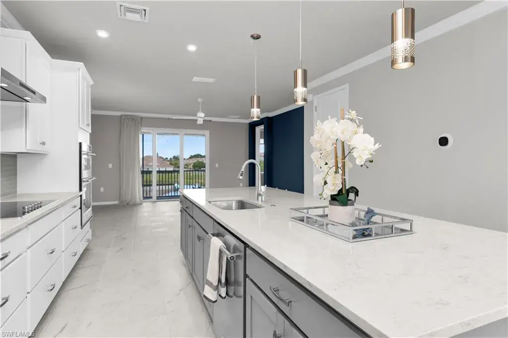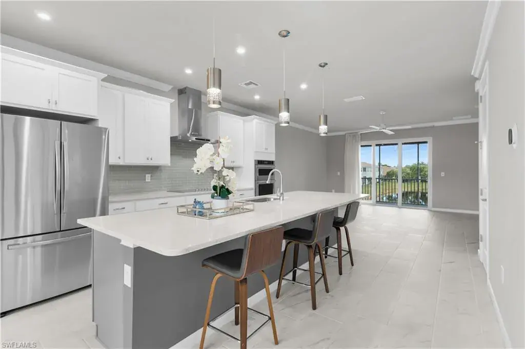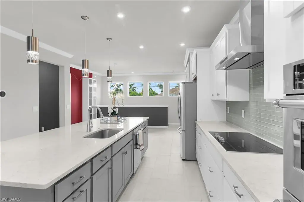 The modern kitchen is a true centerpiece, offering an oversized center island, quartz countertops, stainless steel appliances and sleek cabinetry ideal for both cooking and entertaining.