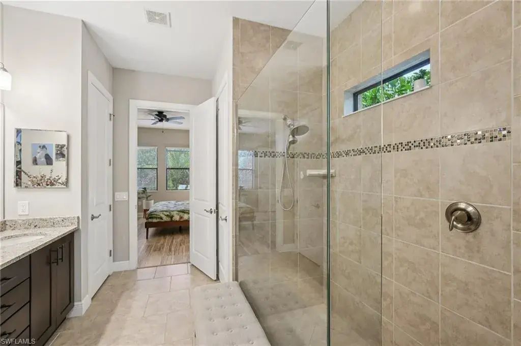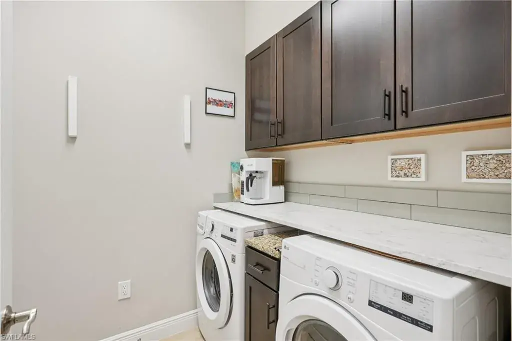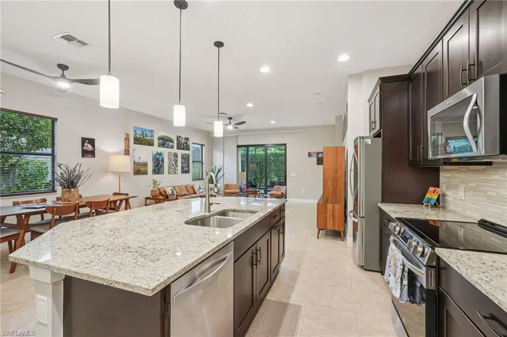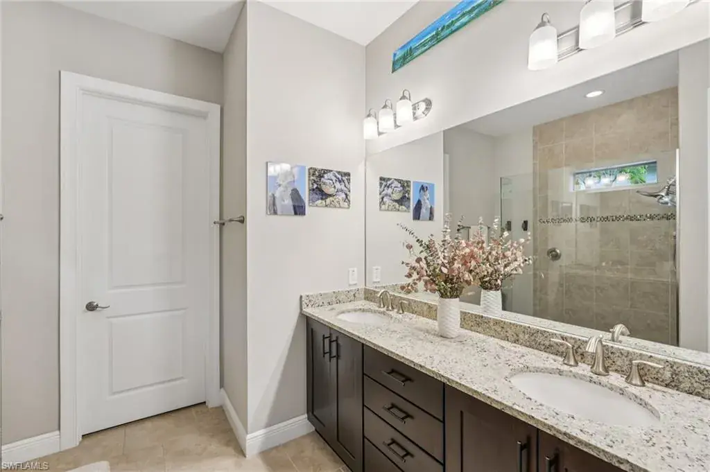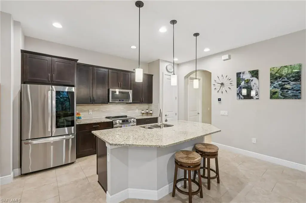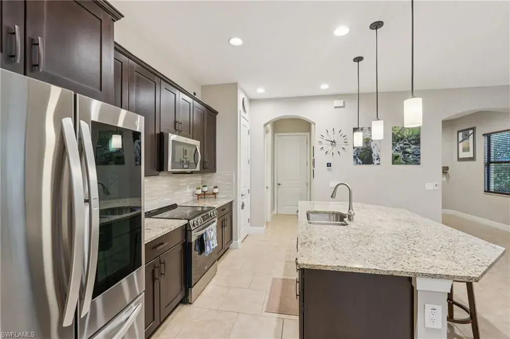 The open kitchen offers 36″ espresso cabinets with pull-outs, granite countertops, stainless steel appliances that include Samsung refrigerator with clear door, and a large island. The spacious primary suite includes dual vanities, a walk-in shower, and private water closet. Enjoy effortless indoor-outdoor living on the oversized 36’ screened lanai surrounded by lush tropical landscaping with room for a future pool and pre-plumbed outdoor kitchen.