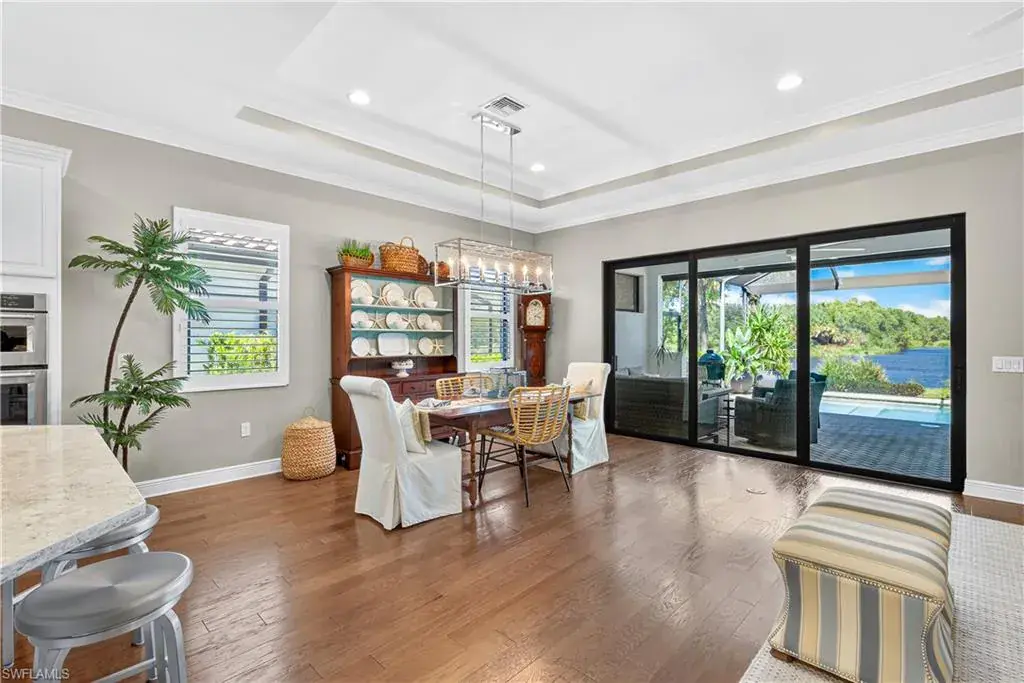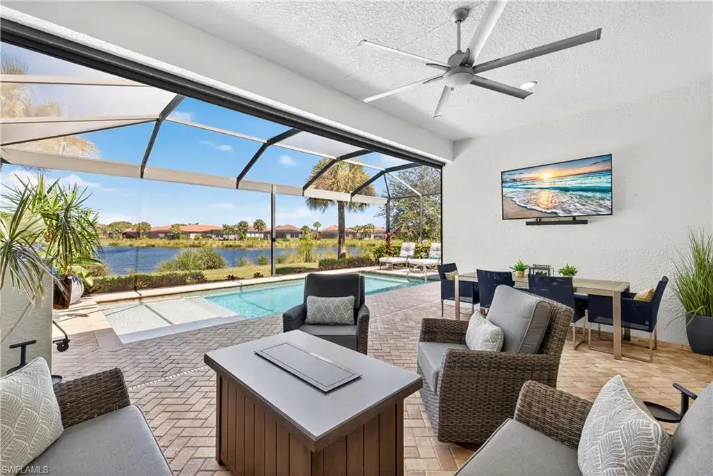 Step outside to your private tropical sanctuary. A solar and electric heated pool with a lounging shelf takes center stage, surrounded by a panoramic screen enclosure and an elegant brick-paver deck overlooking the lake and preserve. Every day here is pure magic — with breathtaking water views and the gentle sounds of nature as your backdrop. For peace of mind, a Storm Smart electric shutter provides both convenience and protection.