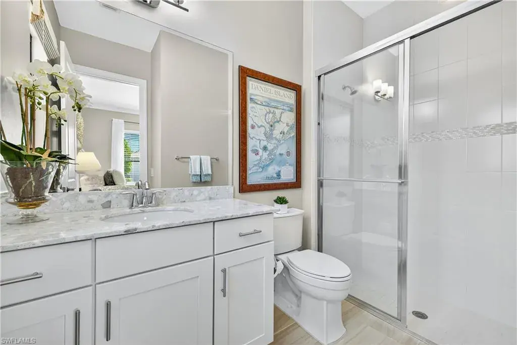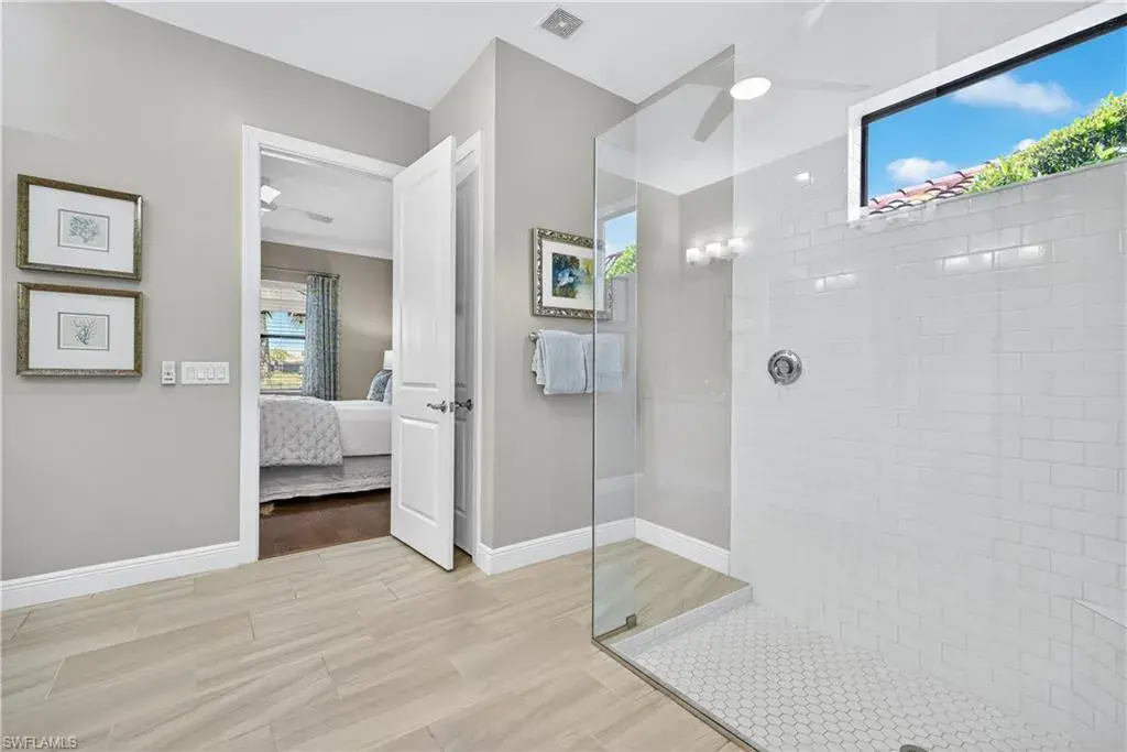 Every detail reflects quality and intention — from the plantation shutters to the hardwood and ceramic flooring to the en-suites accompanying each bedroom. The primary suite embodies understated elegance, featuring a spa-like bath with a frameless glass walk-in shower, dual quartz vanity, and a custom walk-in closet with wood shelving — where each morning begins with breathtaking long lake and preserve views.