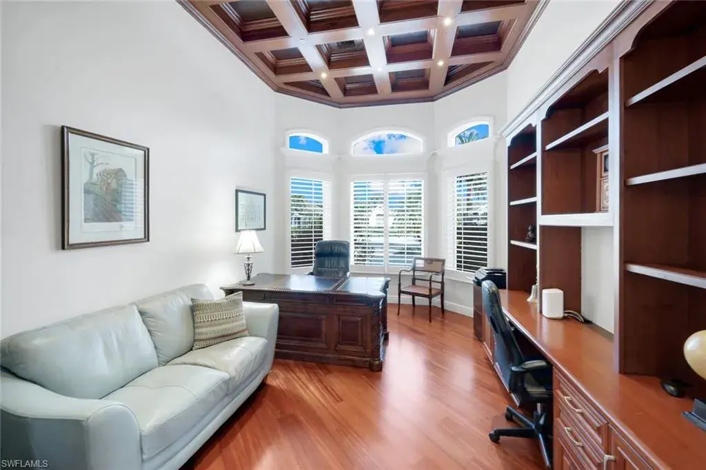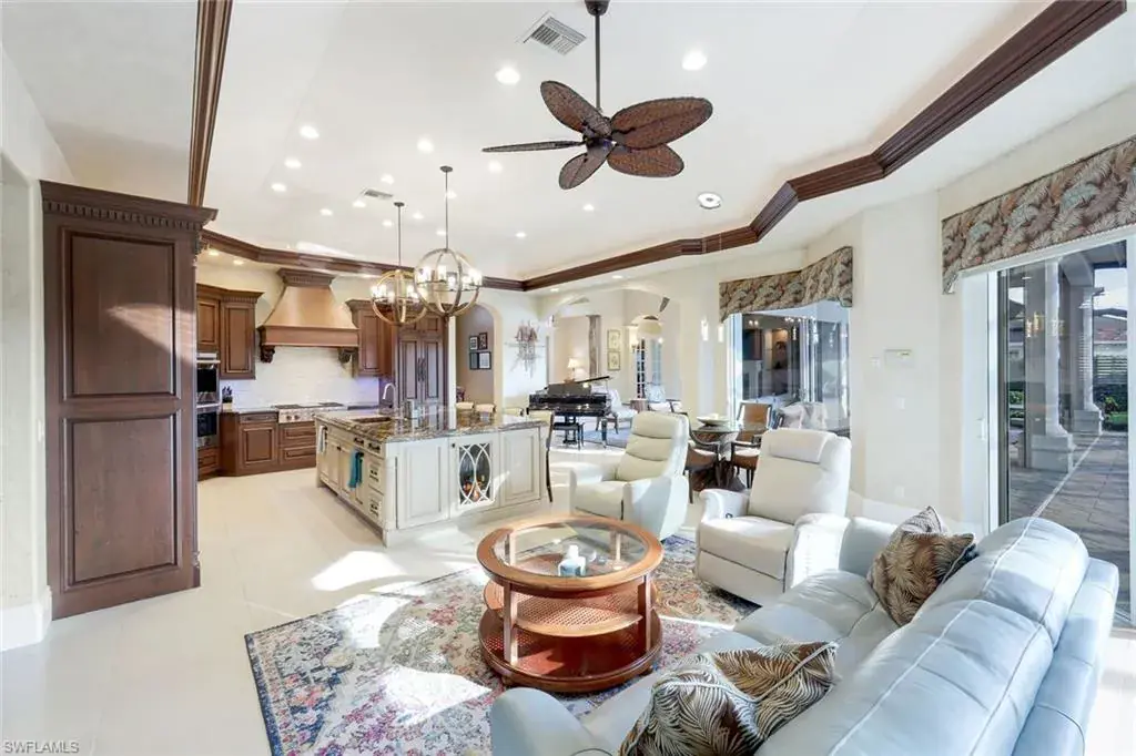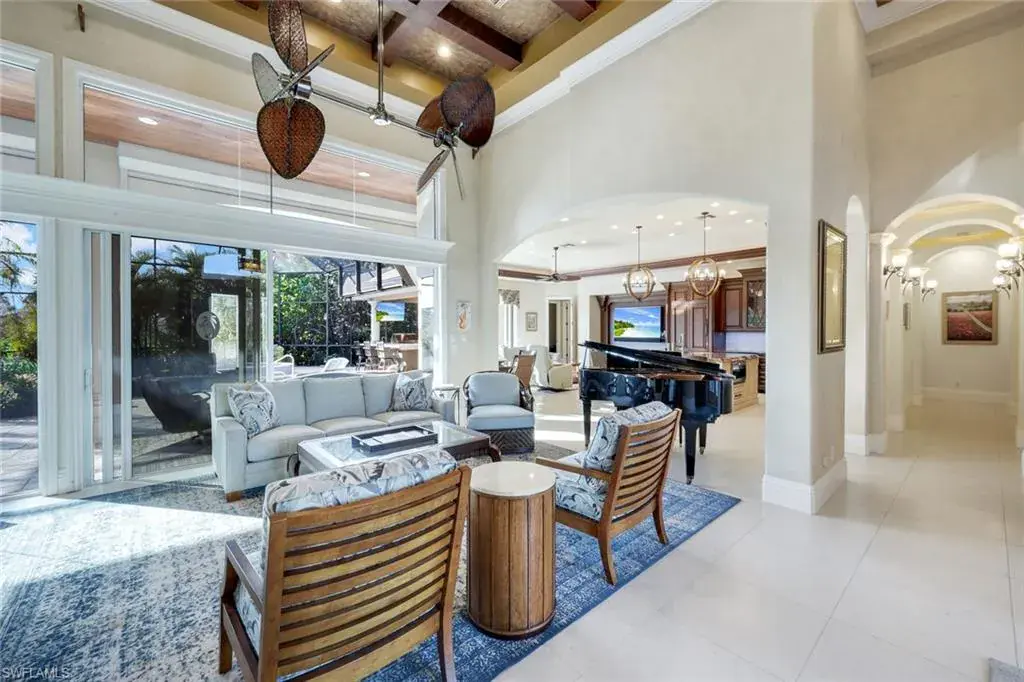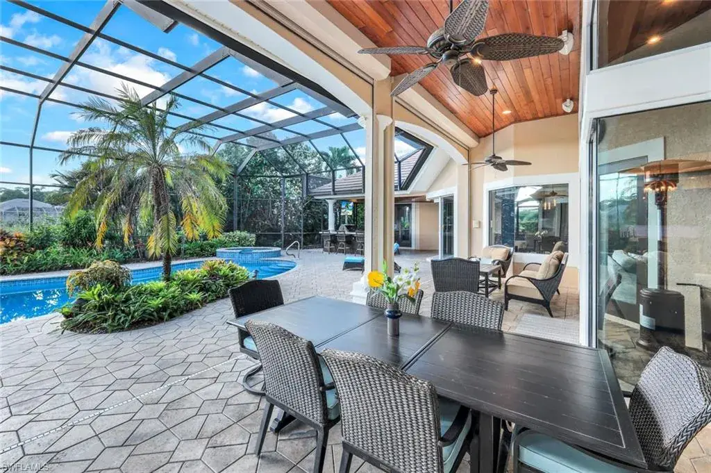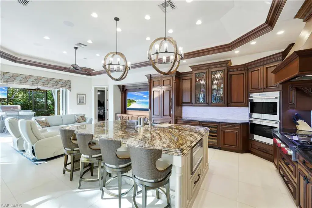 Experience Resort-style living in this gorgeous 5-bedroom plus den home perfectly situated on the golf course. The spacious open floor plan welcomes you with high ceilings, abundant light, and elegant finishes throughout. Five generously sized bedrooms, 3 are ensuites offer ample space for family and guests, while the versatile den is ideal for a home office, media room or extra guest accommodations. The roof was replaced in 2023 along with the gutters and the exterior of the home was painted in 2023. A whole house generator was installed in 2023. Step outside to your private outdoor entertaining oasis complete with a large, covered lanai and outdoor bar with refrigerated drawers and built in grill. Enjoy relaxing evenings hosting friends and family with a dedicated dining area, and plenty of room for grilling and outdoor activities. The seamless indoor -outdoor flow makes every gathering memorable, whether you are watching the sunset over the golf course or enjoying a quiet morning coffee. The 3-car garage with epoxy flooring and built in cabinets is an added plus. Audubon is one of Naples premier communities featuring an 18-hole Troon Managed golf course, Courtside café including indoor/outdoor dining, state-of-the-art fitness facility, community lap pool, bocce courts, tennis courts, Pickleball and a boardwalk down to the water. Currently there is a very short waitlist for golf membership, and social waiting golf members enjoy golf privileges immediately. Audubon Country Club is conveniently located to Vanderbilt Beach and Barefoot Beach.