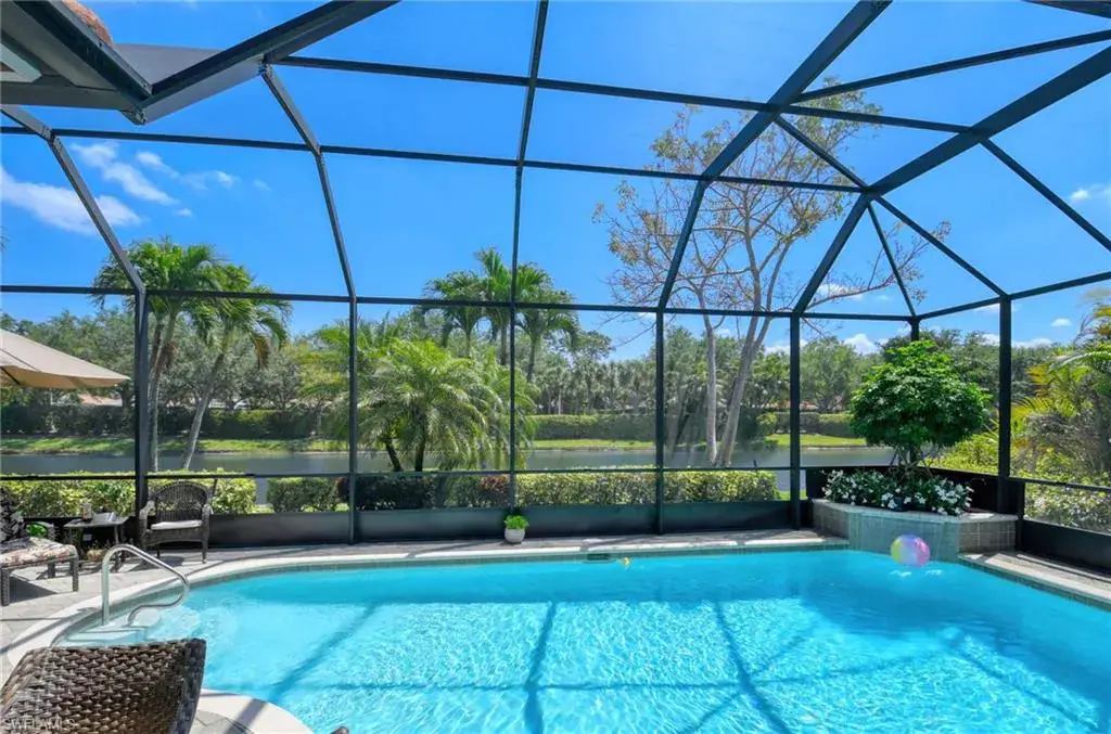 Exquisite waterfront 3BR + study, 3 full bath pool home. Upgrades throughout, including SS appliances, central vac system, wine bar w/fridge, custom coffered ceilings and crown molding, outdoor pool shower and more. Zero corner pocketing sliding doors in great room open the view to pool area and lake views in two directions. Primary suite with Jacuzzi tub, separate his & her closets, walk-in shower, separate water closet, and French doors to pool area. Elegant wood floors in living room, master BR and study. Kitchen, family room and living room overlook lanai and lake beyond. Formal dining room. Expansive outdoor pool and entertainment area with BBQ grill & under-counter fridge offer a lush tropical setting and add to the remarkable ambiance of this enchanting home. Many recent improvements including new roof, garage door, pool heater & pump, and pool resurfaced.