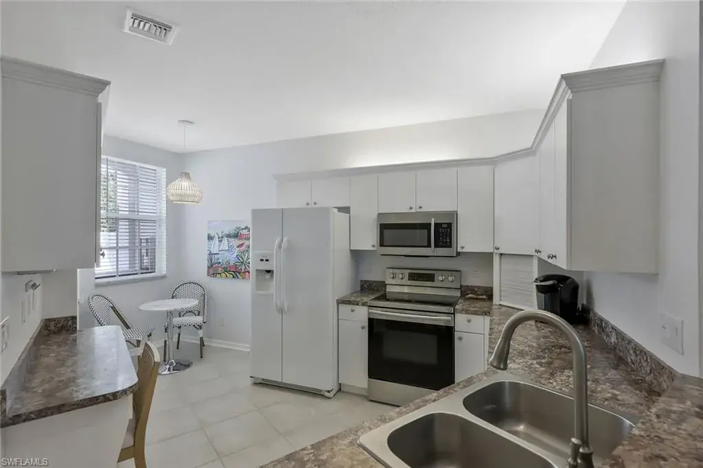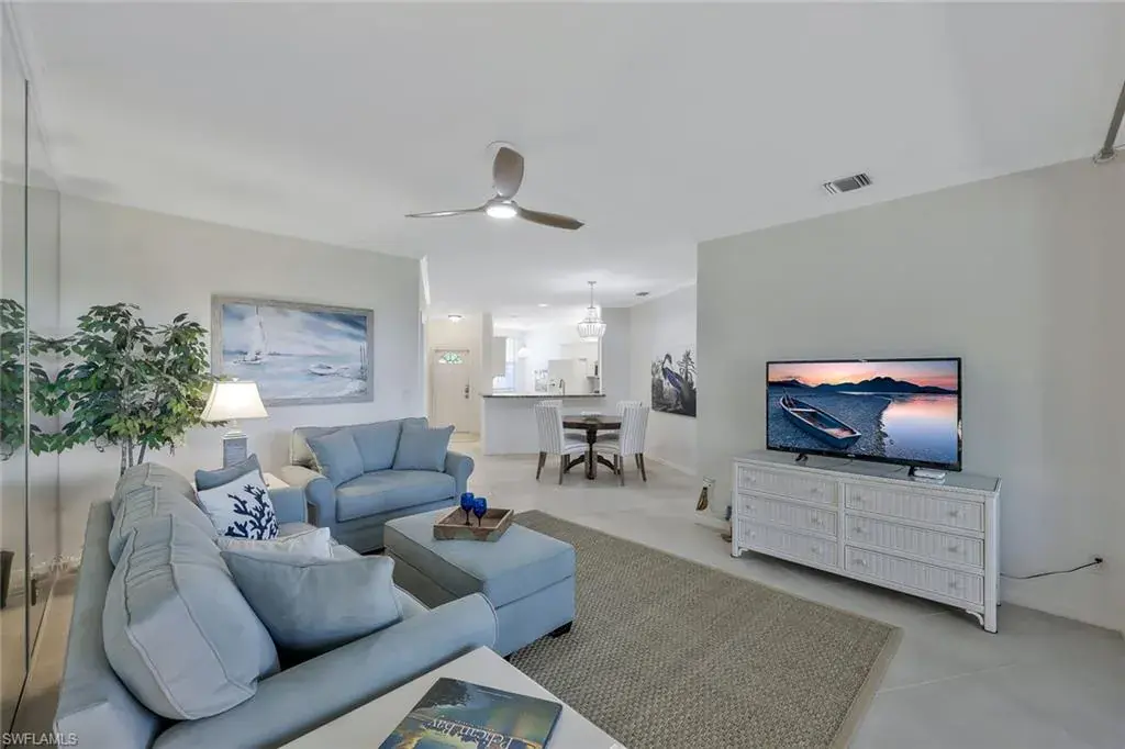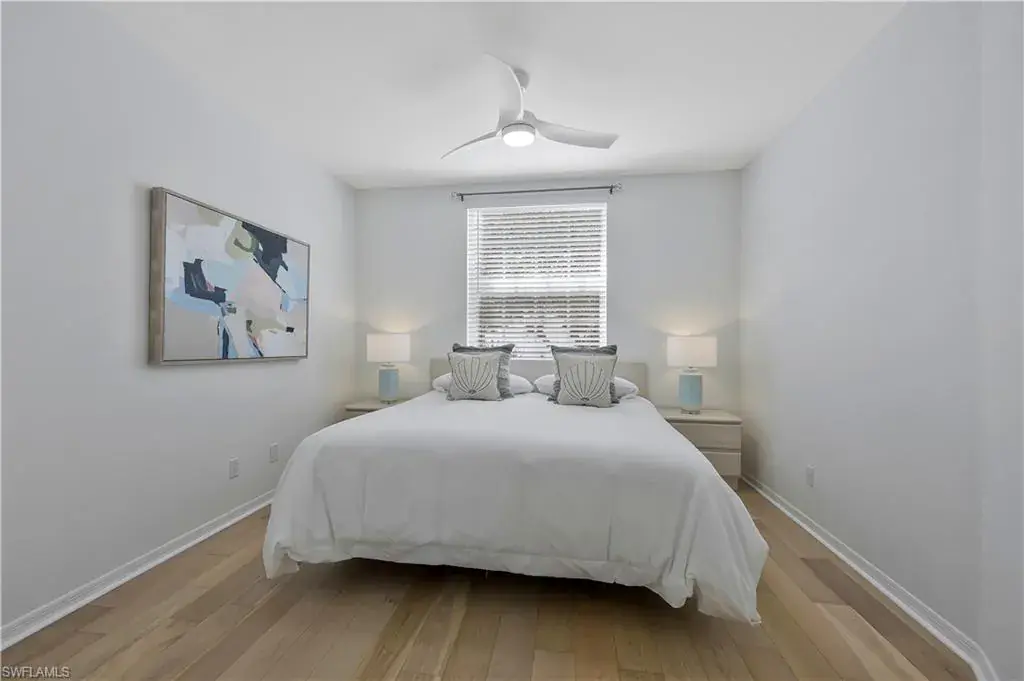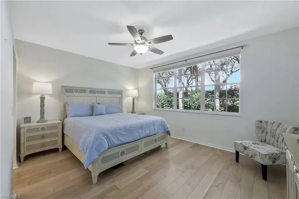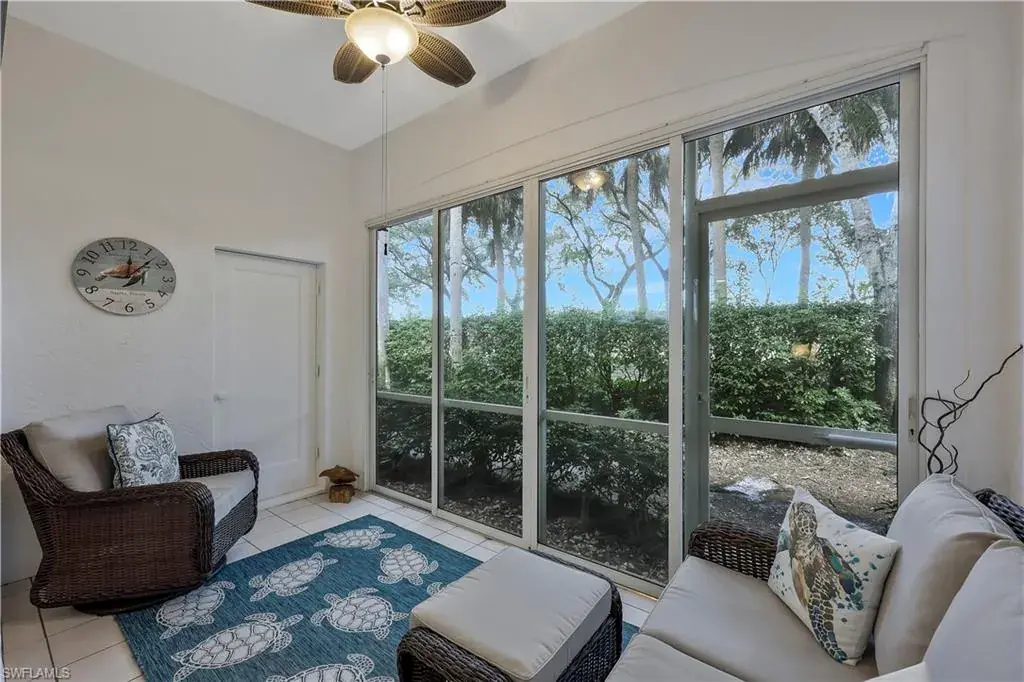 This charming first floor residence with two private outdoor living spaces is a must see! The light and bright Guinevere floor plan boasts split bedrooms for maximum privacy, high ceilings, an eat in kitchen, utility/laundry room with sink, neutral tile and hardwood throughout, and two assigned parking spaces. The spacious master bedroom features oversized windows, access to the lanai, two closets (one walk in), double sinks, and a walk in shower with dual shower heads. Enjoy the lanai in all seasons, as it has been glassed in with storm resistant sliders that open for the soft breezes in the winter and close up for additional air conditioned space in the warmer months. Walk to pickleball, the fully equipped fitness center, and tennis courts. Pelican Bay is one of Naples’ most prestigious and sought after, amenity-rich communities. Walk the Pelican Bay nature path amidst protected mangroves, taking in the natural wildlife, or use the provided golf cart trams to escort you to either of the two private beach clubs. Both clubs offer beach attendant services, loungers, umbrellas, cabanas, sailboats, kayaks, paddle boards, and formal and open-air restaurants with a robust live entertainment schedule. Fitness enthusiasts can also enjoy canoeing through the mangrove preserves, an indoor and outdoor full-service gym with cardio and new strength training equipment, a variety of group fitness classes including beachfront options and yoga, a lakeside wellness studio, and two tennis centers with 18 Har-Tru courts, pro shops, plus the new state of the art racquets facility for pickleball and tennis. If you enjoy book clubs, games, art classes, speaker series, and other social events, the activities director has something for everyone. Start living your best Naples life today!