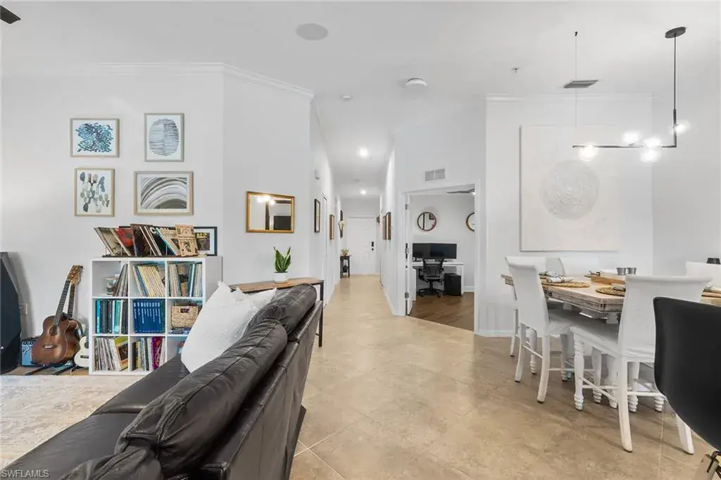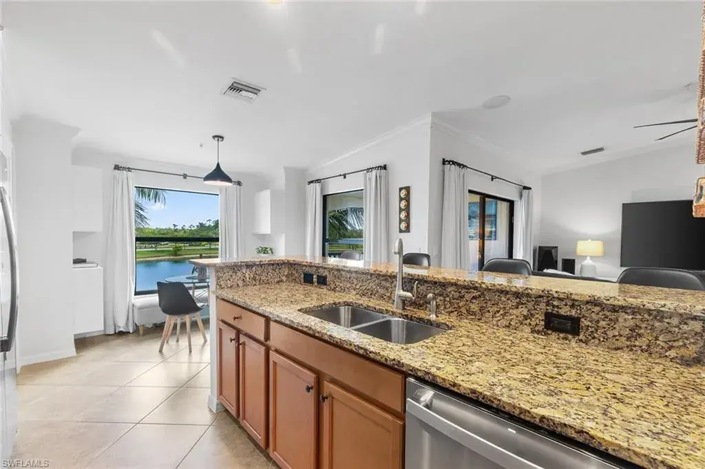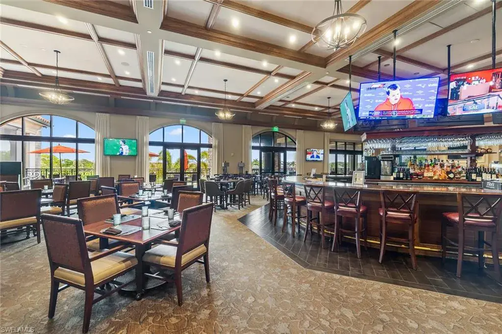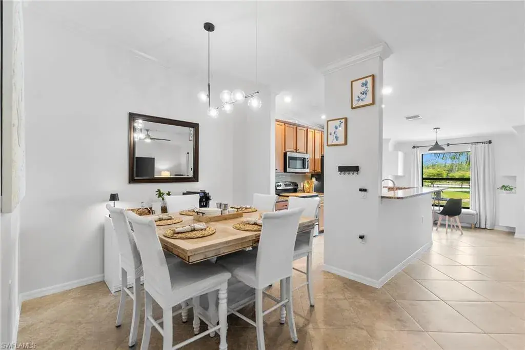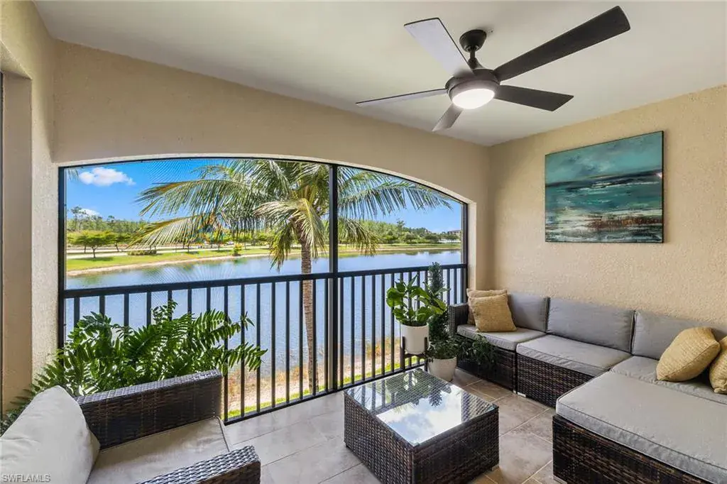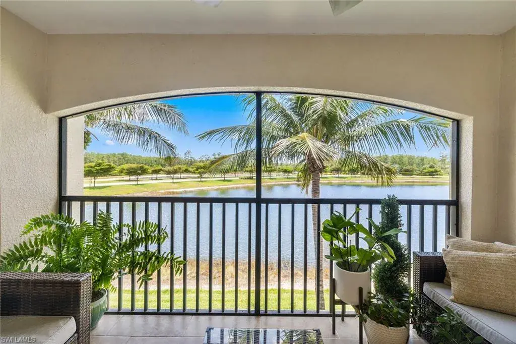 This social membership two-bedroom plus den, two bath features the Diangelo floor plan and includes an incredible and rarely available southern exposure view in the heart of Treviso Bay. Enter the top-floor residence through the spacious front screened Veranda to find extra-high ceilings and a unique blend of elegance and functionality. The wide-open floor plan of this popular model is ideal for entertaining and family living. The open concept flows from kitchen/breakfast nook to dining room and living room, creating one extra-large space. Accentuated by soaring ceilings and wide-line crown molding, it’s ideal for hosting parties, movie nights and culinary adventures. Updated LED lighting fixtures and ceiling fans add a touch of contemporary style. For tech lovers, this condominium has been wired post-construction to support four rooms of in-ceiling speaker pairs and 15+ Cat6 data, security and wireless access point location drops, including the repainted and epoxy-coated detached garage. The den is a versatile space, featuring a queen-sized built-in Murphy bed with spacious storage for office supplies and linens and added crown molding, making it ideal for guests and a home office setup. Plus, enjoy the comfort of tastefully done wood-toned flooring in both bedrooms and the den. The kitchen features modern stainless steel GE appliances with a new dishwasher and tiled backsplash. The southern exposure fills the main living area with natural light all day long and the 24-by-12-inch tiled and super-screened back lanai provides a tranquil outdoor retreat where one can gaze at a pristine preserve, open skies and multiple lake water views. Don’t miss your chance to own this exceptional condominium offering luxury, comfort and modern convenience in one of the sought-after Naples communities. Conveniently situated, a brief stroll leads to eight pickleball courts one way, and Villa Rilassare the other direction, which offers a host of elite amenities including a resort-style pool featuring cascading waterfalls, eight Har-Tru tennis courts with league play and pro instruction, poolside bar and dining options fully renovated March 2025, rejuvenating spa facilities, as well as tennis and bocce ball courts, elaborate fitness and aerobics facilities, saunas and steam rooms. World-class dining is enjoyed on the 18-hole TPC championship golf course grounds at the opulent clubhouse with an array of social activities on the calendar. Golf is available to social members of Treviso Bay from May to October. Ideally just five miles from vibrant downtown area of Olde Naples and in proximity to pristine beaches of Naples and Marco Island, this residence epitomizes sophisticated coastal living at its finest.