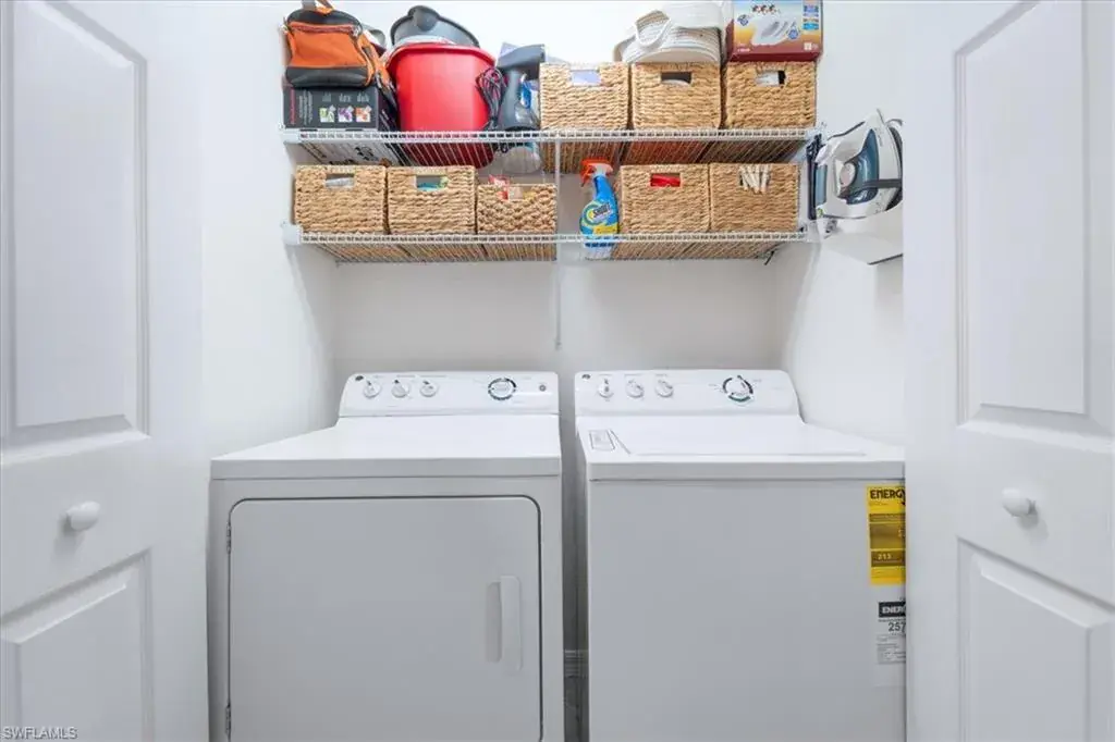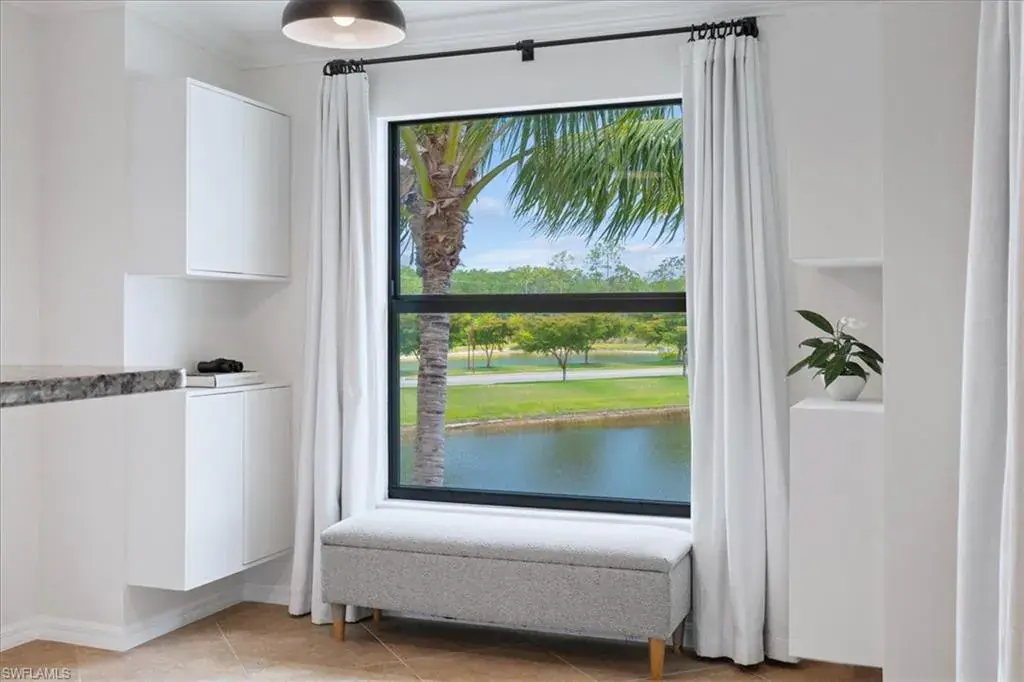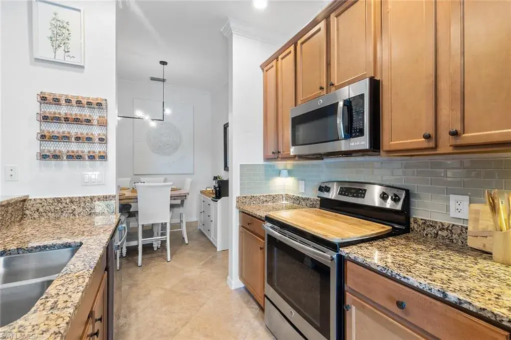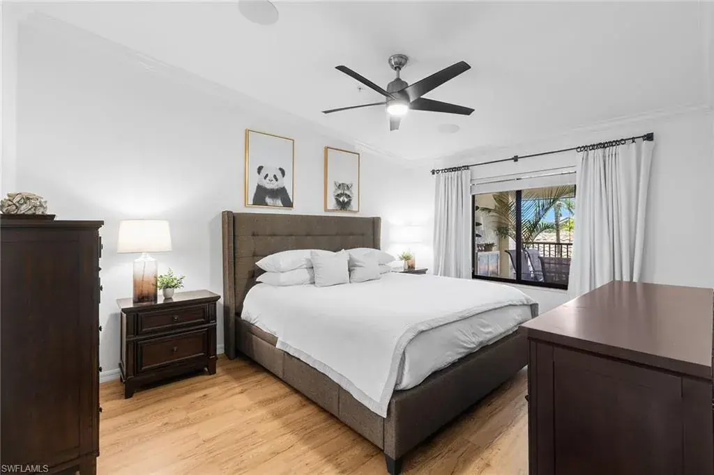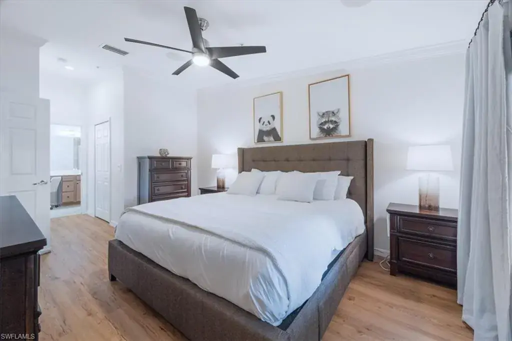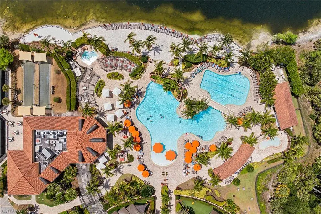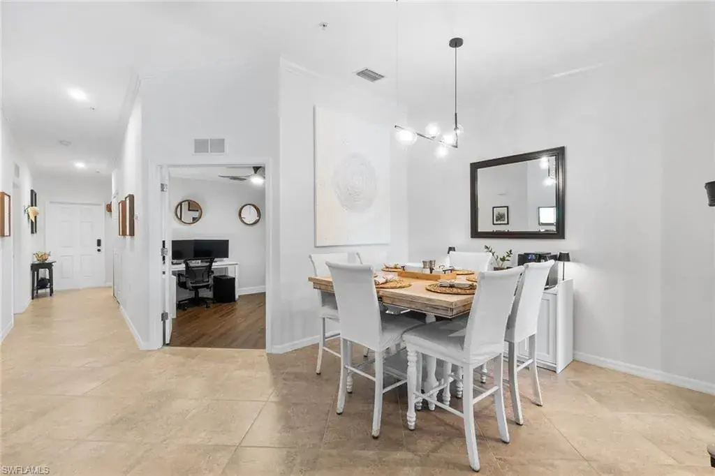 This social membership two-bedroom plus den, two bath features the Diangelo floor plan and includes an incredible and rarely available southern exposure view in the heart of Treviso Bay. Enter the top-floor residence through the spacious front screened Veranda to find extra-high ceilings and a unique blend of elegance and functionality. The wide-open floor plan of this popular model is ideal for entertaining and family living. The open concept flows from kitchen/breakfast nook to dining room and living room, creating one extra-large space. Accentuated by soaring ceilings and wide-line crown molding, it’s ideal for hosting parties, movie nights and culinary adventures. Updated LED lighting fixtures and ceiling fans add a touch of contemporary style. For tech lovers, this condominium has been wired post-construction to support four rooms of in-ceiling speaker pairs and 15+ Cat6 data, security and wireless access point location drops, including the repainted and epoxy-coated detached garage. The den is a versatile space, featuring a queen-sized built-in Murphy bed with spacious storage for office supplies and linens and added crown molding, making it ideal for guests and a home office setup. Plus, enjoy the comfort of tastefully done wood-toned flooring in both bedrooms and the den. The kitchen features modern stainless steel GE appliances with a new dishwasher and tiled backsplash. The southern exposure fills the main living area with natural light all day long and the 24-by-12-inch tiled and super-screened back lanai provides a tranquil outdoor retreat where one can gaze at a pristine preserve, open skies and multiple lake water views. Don’t miss your chance to own this exceptional condominium offering luxury, comfort and modern convenience in one of the sought-after Naples communities. Conveniently situated, a brief stroll leads to eight pickleball courts one way, and Villa Rilassare the other direction, which offers a host of elite amenities including a resort-style pool featuring cascading waterfalls, eight Har-Tru tennis courts with league play and pro instruction, poolside bar and dining options fully renovated March 2025, rejuvenating spa facilities, as well as tennis and bocce ball courts, elaborate fitness and aerobics facilities, saunas and steam rooms. World-class dining is enjoyed on the 18-hole TPC championship golf course grounds at the opulent clubhouse with an array of social activities on the calendar. Golf is available to social members of Treviso Bay from May to October. Ideally just five miles from vibrant downtown area of Olde Naples and in proximity to pristine beaches of Naples and Marco Island, this residence epitomizes sophisticated coastal living at its finest.
