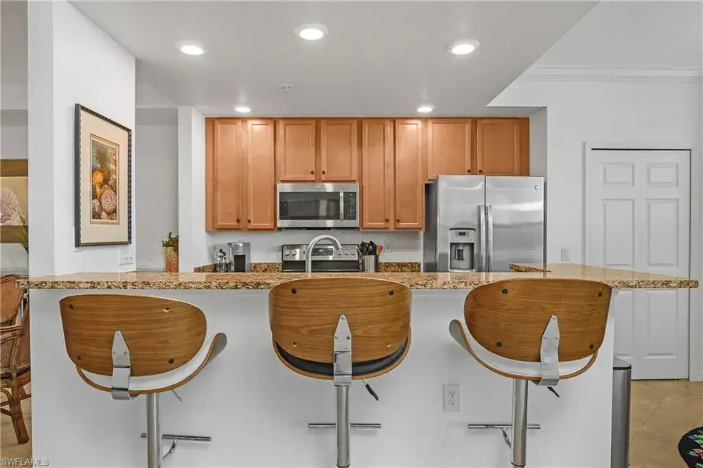 Welcome to your new home, a beautifully maintained first-floor veranda in the resort-style community of Treviso Bay. This 2-bedroom + den, 2-bath home with a 1-car detached garage is being offered turnkey and move-in ready, making it the perfect opportunity to enjoy the Naples lifestyle from day one. Freshly painted in light, inviting tones, the home features an open layout that flows seamlessly between living, dining, and kitchen spaces. Enjoy a tranquil lake view from your rear screened lanai, creating an ideal space for morning coffee or evening relaxation. A second screened lanai is located at the front of the home for added outdoor living. The den includes a stylish murphy bed, adding versatility for guests or a home office setup. Ideally located on a quiet cul-de-sac and just down the block from one of Treviso Bay’s satellite pools with a built-in grilling station, this home combines peaceful living with convenient access to resort-style amenities.