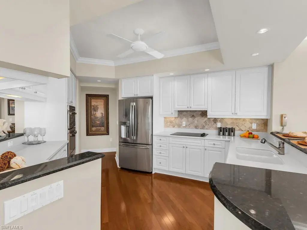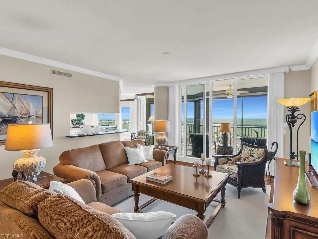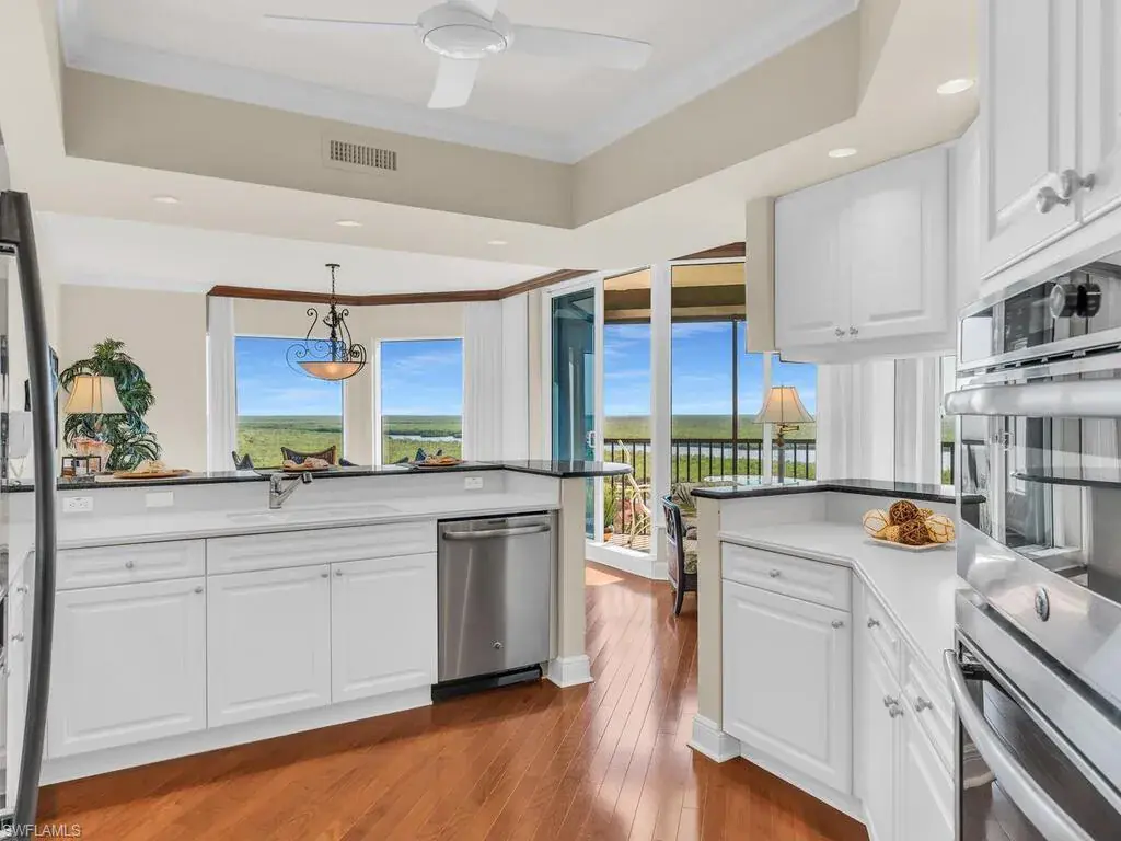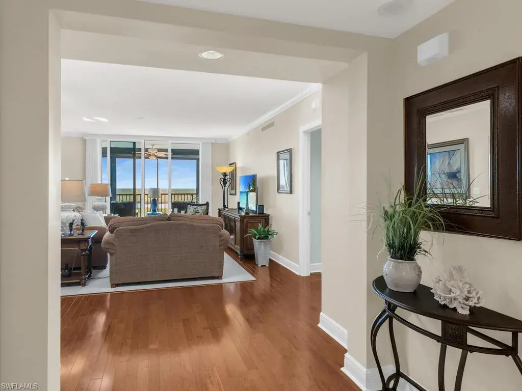 Discover luxury living in this elegant 2-bedroom plus den condo in Aversana at Hammock Bay. This light-filled home features thoughtful updates, including a 2022 AC, 2020 water heater, and newer washer and dryer. The open layout is enhanced by classic wood flooring, crown molding, and abundant natural light. The kitchen boasts bright cabinets, stainless steel appliances, and a convenient breakfast bar. French doors lead to a versatile office or den, while the spacious owner’s suite offers lanai access, a walk-in closet, and a spa-inspired en-suite bath with dual vanities, a soaking tub, and a glass-enclosed shower. The guest bedroom provides its own en-suite bath. Electric hurricane shutters and impact-resistant windows ensure peace of mind and comfort. Aversana residents enjoy access to a remodeled grand lobby, a fitness center with a sauna, a private theater, guest suites, and a stunning outdoor pool area with a hot tub and gathering room. Ideally located just minutes from Marco Island and Naples, this home blends timeless elegance with the ultimate in luxury and convenience. Your perfect lifestyle awaits!