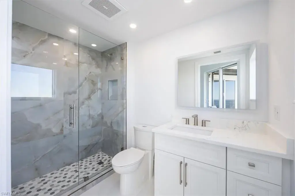The thoughtfully designed split floor plan includes TWO ADDITIONAL GUEST SUITES, each with designer bathroom, lighted mirror, glass-enclosed shower, built-in closet, and open terrace access, ideal for enjoying the vibrant sunsets over the Gulf.