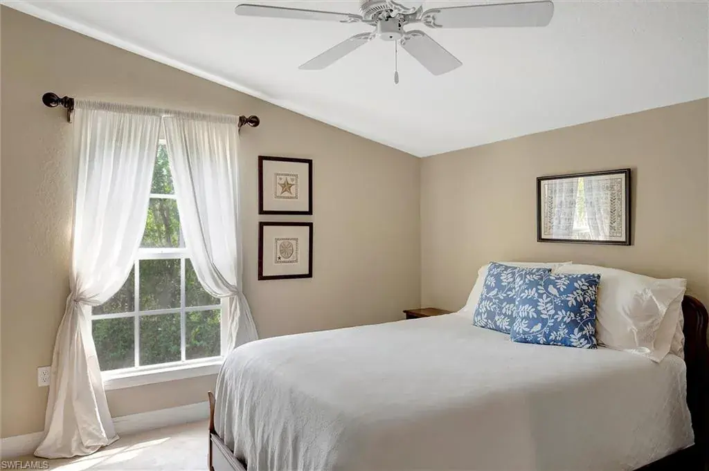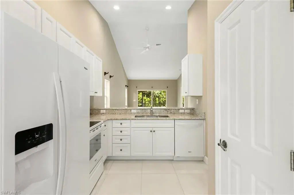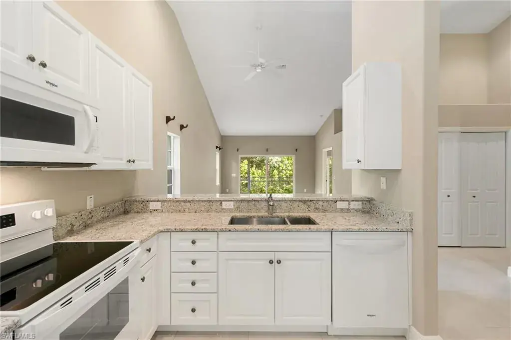 Beautiful end unit townhome, lives like a villa. Meticulously maintained, one owner with the best location in the neighborhood. Green views and and total privacy all around. This is a small quiet complex with easy 5-7-minute access to downtown and also I-75 via Livingston. This lovely end unit townhome features 13ft. vaulted ceilings and has been recently updated including new 24 inch tile, fresh paint, and new appliances. New hot water heater 2024, dual stage energy efficient AC 2022, dual element stove brand new, refrigerator 2022, dishwasher 2017, washer/dryer 2024. Kitchen remodel includes new wood cabinets with soft close doors, undermount sink, granite counter tops, and pantry with built in spice rack. The separate dining room could easily be converted to an office. Ample closet space with a coat closet, storage closet and attic storage. All updates were fully permitted. Excellent use of space with primary suite on the main level along with half bath, and second full suite upstairs. Primary bath includes double vanity, large walk in shower and ample closet space. The single car garage has brand new anti-slip epoxy surface and extra storage in back. All impact windows and doors including garage door. New roof 2023. Nice comfortable pool area surrounded by palms. Generous pet policy. This is a home you can move in or rent without any work to be done. Great investment property, these units are always easy to rent. Reasonable monthly fees.
