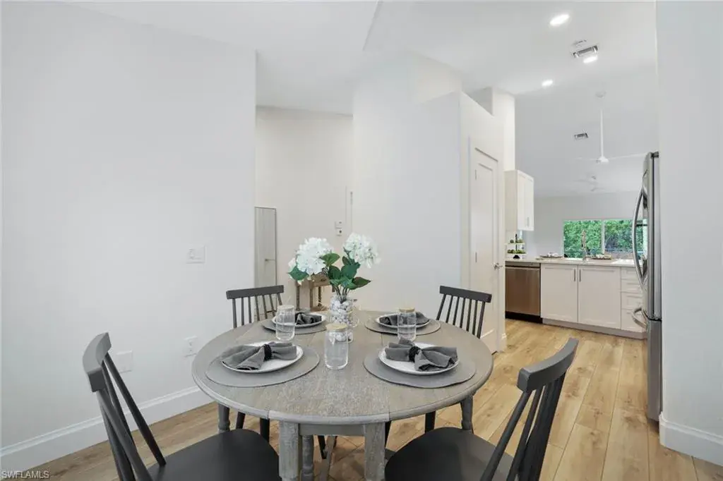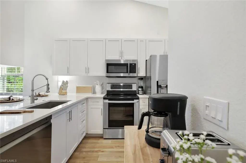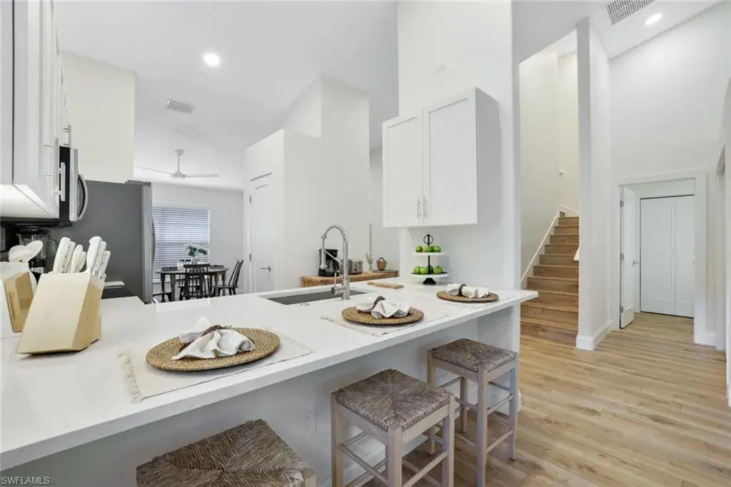 PRICE IMPROVEMENT! Don’t miss this ABSOLUTELY FABULOUS HOME! Fall in love with this completely renovated, furnished, turnkey, split-level townhouse–full of open space and natural light in midtown Naples. Boasting 2 spacious bedrooms, 2.5 bathrooms, a brand-new custom kitchen, versatile den space, a spacious convenient pantry, as well as lofty cathedral ceilings and contemporary light wood-style laminate flooring throughout the entire home. The open floor plan flows elegantly and seamlessly from the dining area into the kitchen and through to the living room along with the spacious ceilings and wood-style flooring. Both the primary bedroom, which is located on the ground floor, as well as the guest bedroom, which is located on the second floor, include the same waterproof wood-style flooring throughout. All 3 bathrooms have been finished with beautiful custom vanities and cabinetry, new toilets, and new fixtures. The primary bathroom includes a lofty ceiling and a large walk-in shower. The second floor ensuite guest bathroom includes a combination deep soak tub and shower. The townhouse lanai overlooks a cozy private preserve.