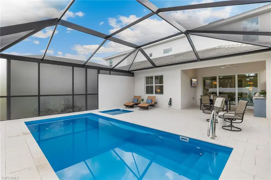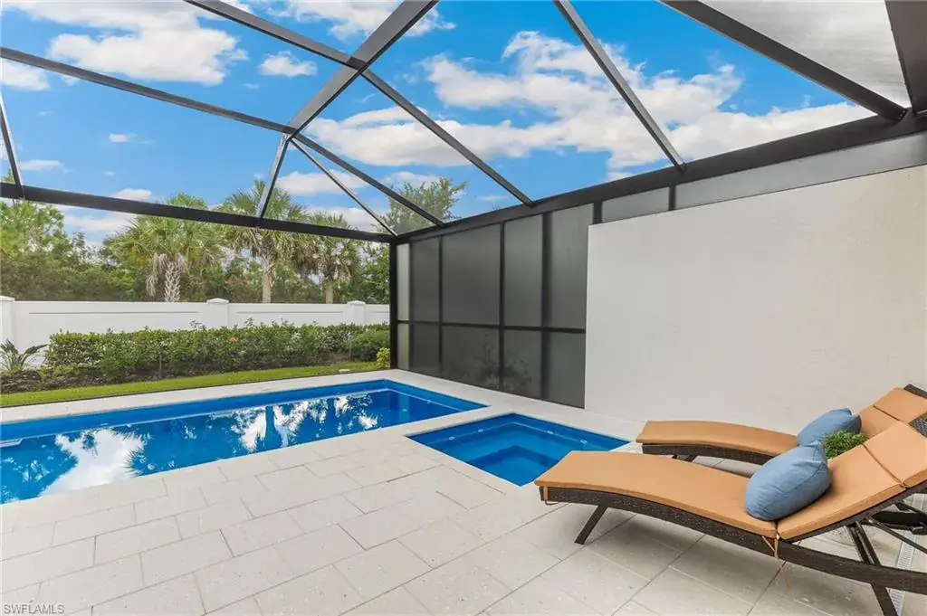 Step outside to your private outdoor oasis, where a large panoramic screened lanai features multiple seating areas, a fully equipped outdoor kitchen, and a beautiful pool and spa framed by a privacy wall. Whether you’re relaxing by the pool, dining al fresco, or simply enjoying the tranquil setting, this outdoor space is truly special.