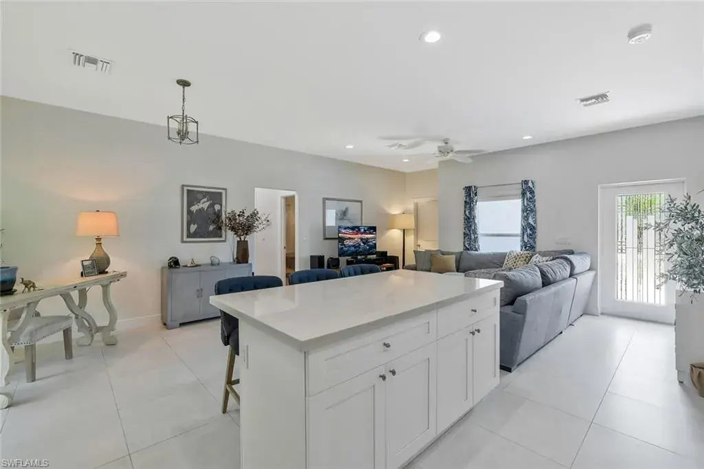 Built in 2019, this coastal-contemporary home blends modern design with Florida lifestyle living. The open-concept floor plan features durable 20×20 porcelain tile throughout (no carpet), soaring ceilings, and a chef’s kitchen with quartz countertops, stainless steel appliances, white shaker cabinets, soft-close drawers, arabesque tile backsplash, large pantry, and a breakfast island designed for entertaining.