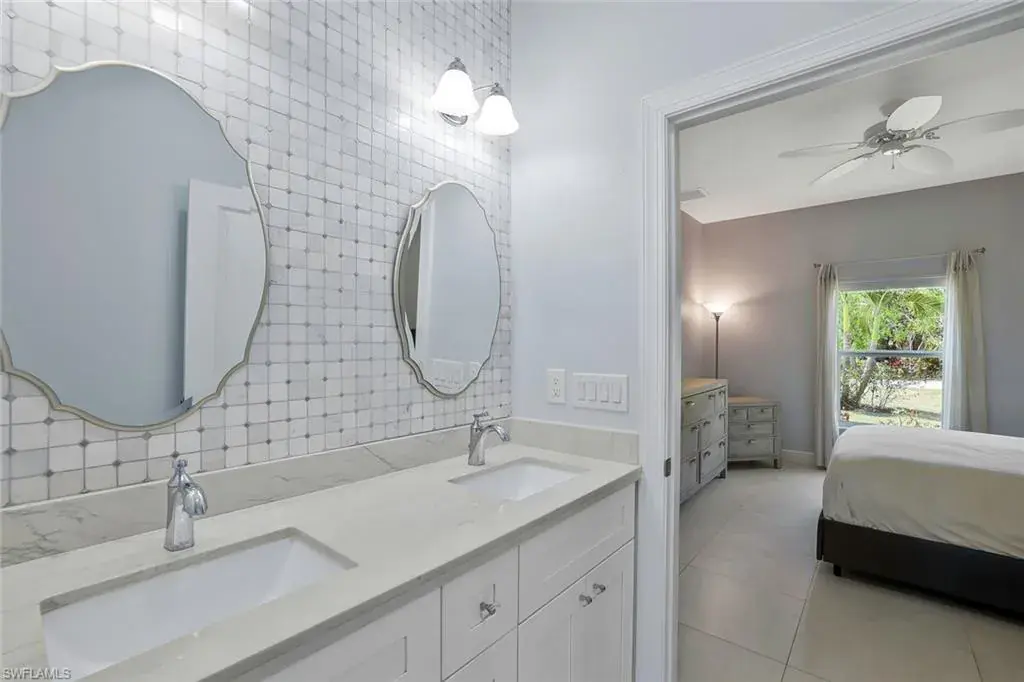 The spacious primary suite includes a spa-inspired bathroom with dual quartz vanities, a walk-in shower with floor-to-ceiling Carrara porcelain tile, and designer flooring. Two additional guest bedrooms share a stylish full bath with gray hexagon tile and tub/shower combo.