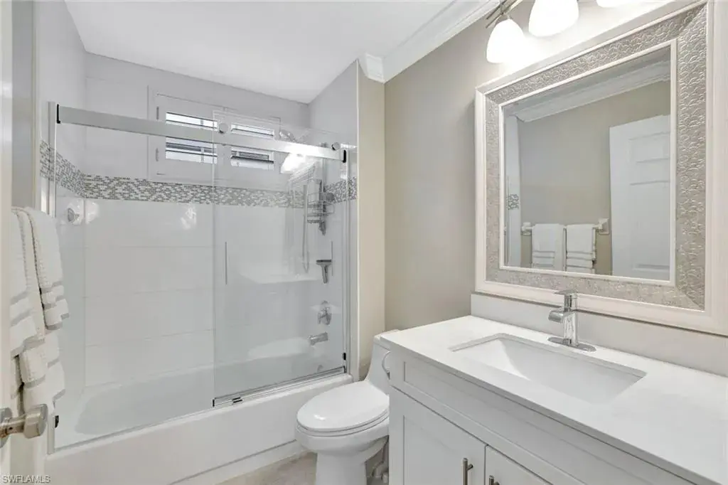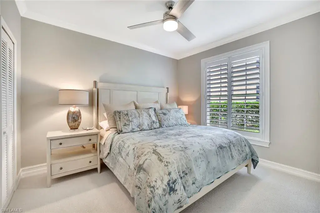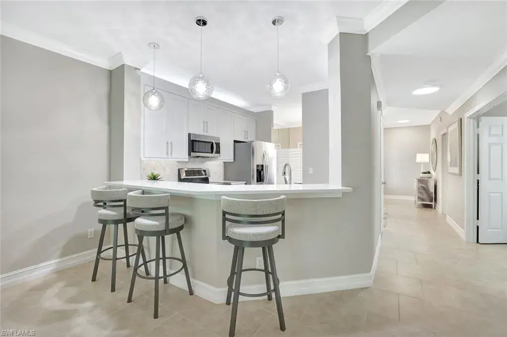 Beautifully renovated, this main-floor, three-bedroom condo enjoys bright western exposure overlooking the meticulously maintained grounds. The kitchen has been fully remodeled with fresh white cabinetry, sleek quartz countertops, and stainless-steel appliances. Both the primary and guest baths have been stylishly updated with new cabinetry, quartz counters, and tile finishes. Custom built-ins with glass shelving frame the flat-screen, adding a designer touch throughout the home. Recent updates also include mechanicals and new impact windows for peace of mind. Positioned on the south side of the building, the residence benefits from both southern and western exposure, filling the home with natural light. The former screened lanai has been upgraded with glass panels, seamlessly extending the under-air living space while still allowing the option to open up and enjoy refreshing Gulf breezes—the best of both indoor and outdoor living. Additional highlights include plantation shutters, a motorized rear lanai shade, updated laundry with new cabinetry, a large private storage closet perfect for bikes and beach gear, and a private one-car garage. This home has never been rented and is not subject to seasonal lease commitments. The Barrington Club offers its own private pool, spa, and community center just steps away. As a Pelican Bay resident, you’ll also have access to an impressive array of amenities: a state-of-the-art fitness center and spa, scenic walking and biking paths, tennis and pickleball facilities, miles of pristine sand beach, and two private beachfront restaurants with convenient north and south tram service. Ideally located in North Naples, Pelican Bay places you minutes from Waterside Shops, Mercato, Artis-Naples, and a wealth of dining and shopping destinations. Situated on one of the highest points in Pelican Bay, making it a rare and valuable find in one of Naples’ most prestigious communities.
