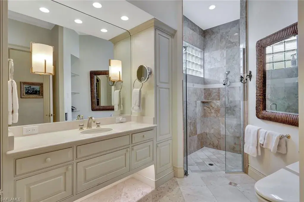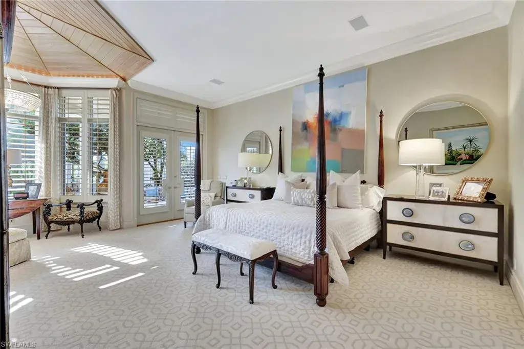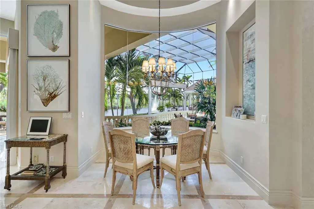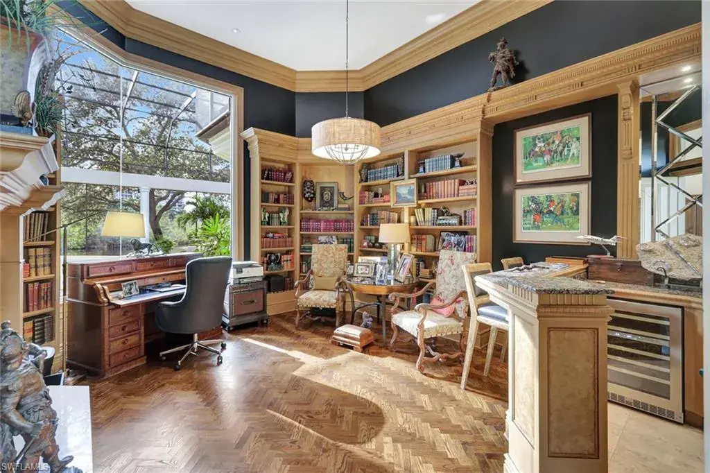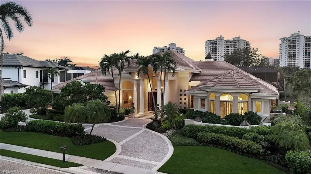 Naples’ ultimate community in beachfront luxury, privacy and exclusivity rests behind the impressive, manned gates of Bay Colony! This home of Timeless Beauty, stands tall on a COVETED LOT, and overlooks the Estuary waters in Bay Colony Shores! It combines sophisticated elegance with practical living, and can adapt to any design aesthetic. Drawn by Stofft Cooney Architects as a unique ONE FLOOR home, it serves as an intimate space for two or expands to welcome both overnight guests or large gatherings for entertaining. The sundrenched Living Room is centered around a rare Keystone Fireplace and two-story windows that showcase the estuary scenes. A soft-toned charming Kitchen features Taj Mahal Quartzite and is open to the Family Room and Breakfast Room where two glass walls of disappearing corner sliders unite Interiors with the Outdoor Activities and spectacular views of nature! The Lanai, under a towering roof high screen epitomizes an outdoor garden room under the stars! An elevated deck offers dining and seating with 3 hidden heaters for cool nights around the sofas and TV. The lower deck features a heart-warming fountain beside a large swimmable renovated pool and a charming outdoor kitchen gazebo with pool bath. Slip away to the Ultimate English Library highlighting a gas fireplace, bar and magnificent bookshelves. The generous Primary Bedroom wing demands attention with a seating area to close out the night, 2 custom closets, 2 full bathrooms and a private lanai with lounge chairs! 4 additional bedrooms, all en suite, are separated for privacy with a large Guest Media/Bunk/Hobby room used for separate guest gatherings. Of course there is a convenient Laundry with second refrigerator and an 8 x 12 air conditioned Storage Room. New Roof in 2019 and New AC System Installed. Elevations are in the 2024 coveted X500 Flood Zone! Bay Colony is the crown jewel of Naples offering a private Beach Club with Concierge Beach and Pool Service, Indoor Casual and Fine Dining, a top of the line Tennis Club on site plus all of Pelican Bay’s spectacular amenities including Pickleball, Workout and Community Center! Close by is Naples’ most sophisticated shopping at Waterside Shops, the best of live music and theater at Artis Naples, and the very vibrant town center at Mercato! The VIDEO LINK above is a must see to understand the wonderful flow of this floor plan!