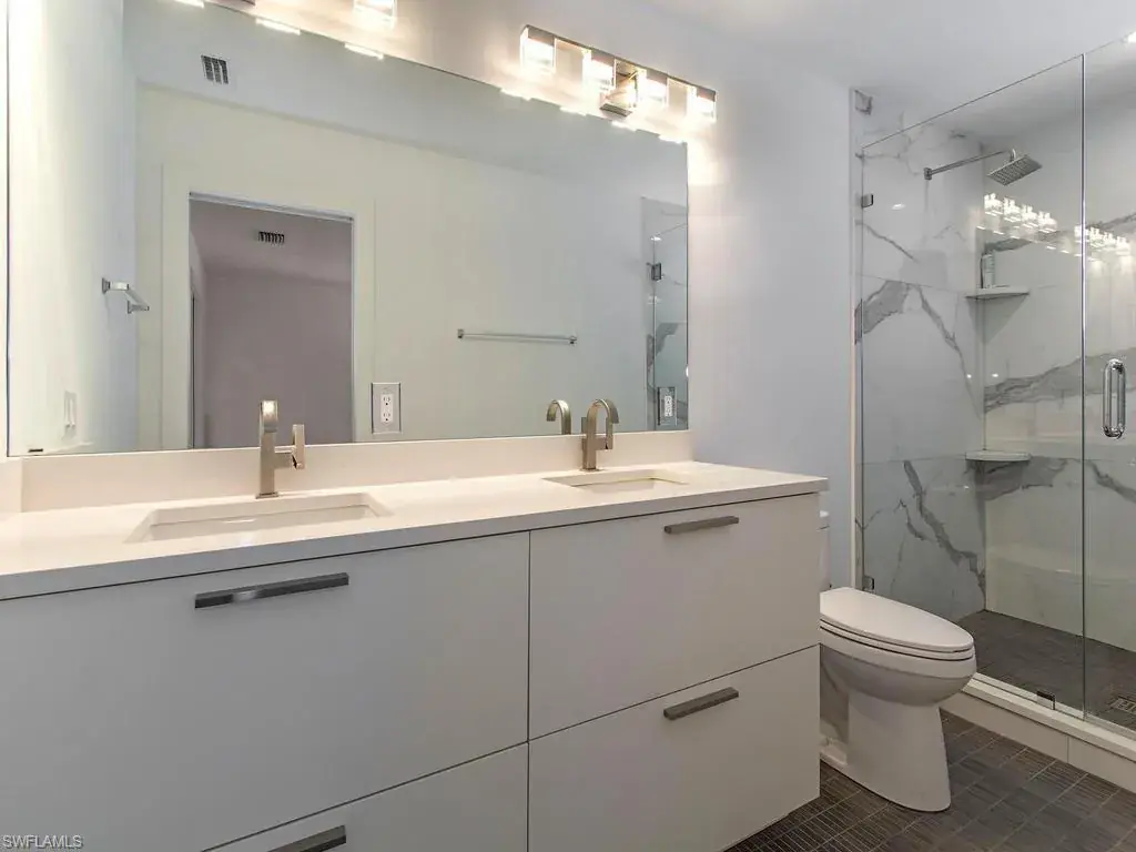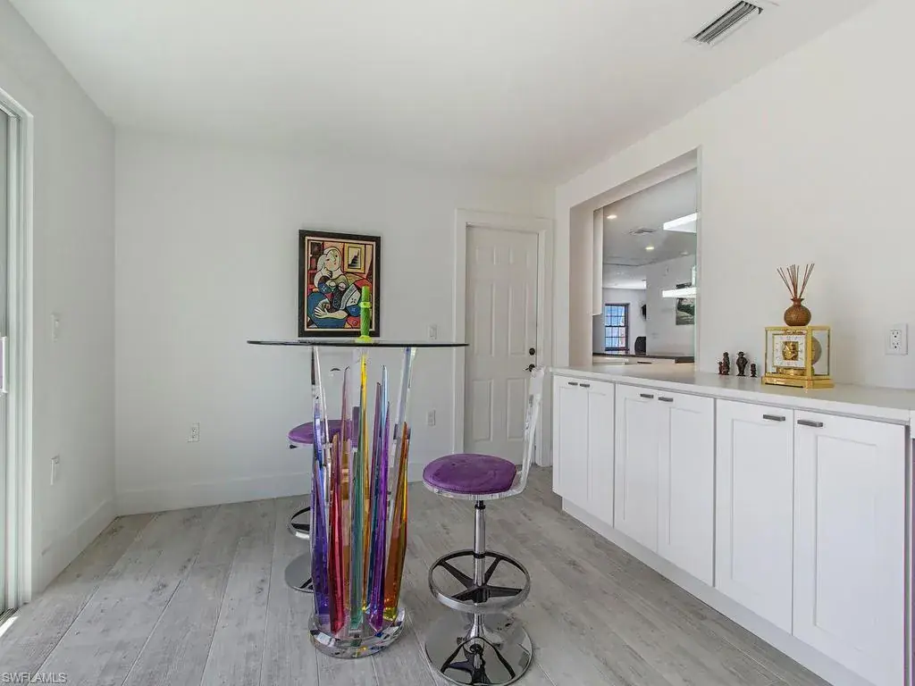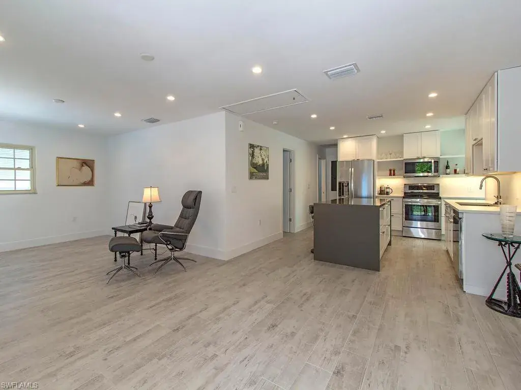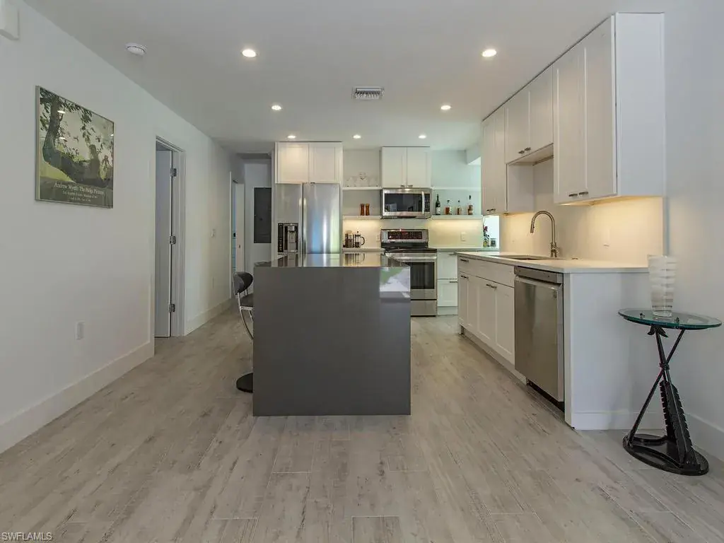 ROYAL HARBOR / Bay Park neighborhood – FANTASTIC LOCATION – within 2 miles to Fifth Avenue South, Tin City and the beach. ISLAND KITCHEN, OPEN LIVING PLAN. FANTASTIC Opportunity for primary residence or designer rental. NO HOA FEES. Bay Park neighborhood next to Private drive entry on Church Avenue to a fenced and gated yard. COMPLETE REMODEL. Grey, wide, plank-style tile flooring throughout, new panel doors throughout with brushed nickel hardware. An open floor plan design with a kitchen island waterfall quartz countertop, white shaker style cabinets, matching quartz counters and stainless appliance. The separate dining room has a built-in sideboard with white cabinets and quartz counter extending the theme from the kitchen. Featuring kitchen cabinets and drawers that soft close, under cabinet lighting, open shelves and additional cove lighting. Stainless appliances in kitchen. Primary bedroom en-suite with dual sinks, quartz counters and seamless glass shower enclosure. Second bath with shower with unique pebble floor and with a seamless glass shower door. Three bedrooms, two full baths with separate dining room. Ideal Location.