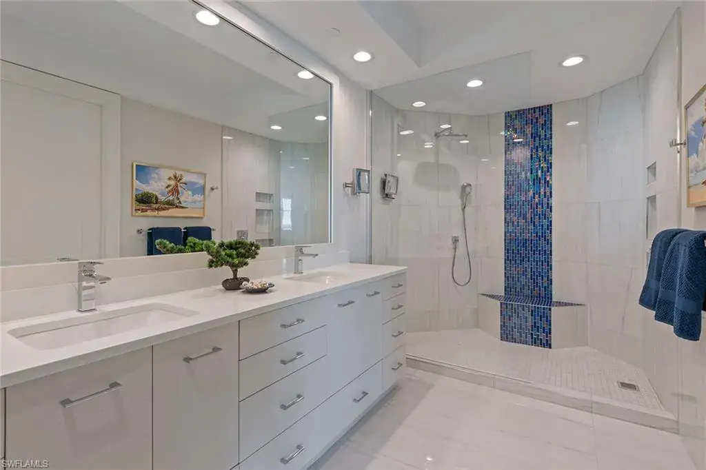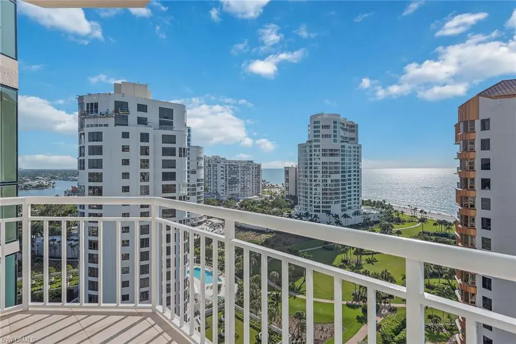 Light and refined, this 15th-floor penthouse residence in Bay Shore Place at Park Shore offers panoramic west-facing views of the beach, Gulf and endless horizon from every room. Designed to emphasize its coastal setting, this unit features ten-foot ceilings, floor-to-ceiling windows, and sliding glass doors that open to three private balconies, each showcasing a dramatic beachfront vista. The two-bedroom, two-bath layout is thoughtfully configured for privacy and comfort. The updated kitchen includes custom cabinetry, quartz countertops, a glass tile backsplash, premium appliances, and a breakfast nook perched above the shoreline. The expansive living and dining areas are finished in a neutral palette, creating a serene and elegant atmosphere. The primary suite enjoys direct beach views from its own balcony and includes a spacious walk-in closet and a beautifully appointed en-suite bath with premium finishes. The guest bedroom, situated separately, offers its own private beach-view balcony and access to a tastefully finished adjacent bath. Additional features include a dedicated in-residence laundry room and ample storage. Bay Shore Place residents enjoy a host of premium amenities, including a private pool, well-appointed fitness center, club room, two guest suites, and direct beach access. The building is moments from the shops and fine dining of Venetian Village and within proximity to Park Shore Marina, where available boat slips and rentals allow for seamless access to the Gulf.