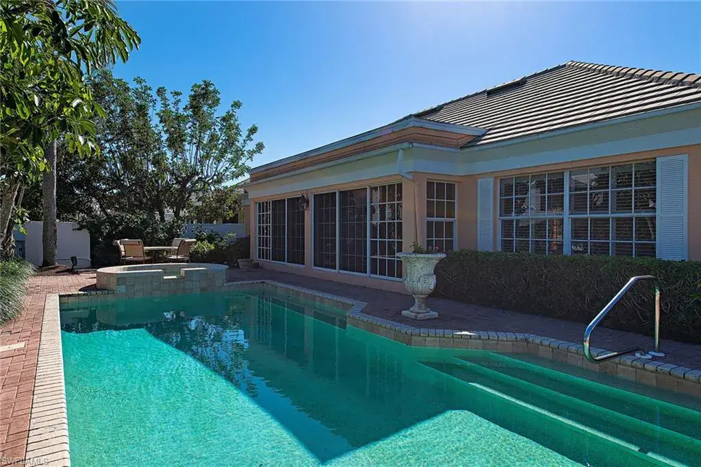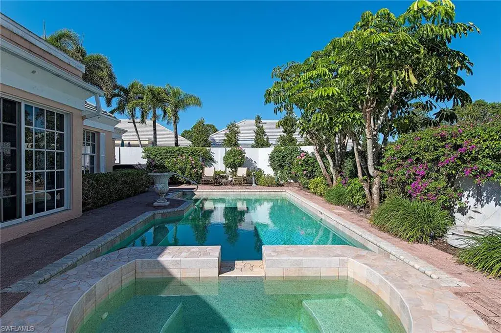 The charm of Beauville at its best! You will feel like you are in Bermuda in this beautiful setting. This one-story villa is 3 bedrooms plus den and features 2,554 square feet under air on a double lot. Very private setting with a privacy wall enclosing the pool and spa. Light and airy with an open floor plan. The kitchen was recently updated with quartz countertops and stainless appliances. Roof, 2010. AC 2017. HWH 2021. Furnished. Enjoy all that Pelican Bay has to offer almost 3 miles of private beach, 2 beach restaurants (not open at the moment due to Hurricane Ian), a state-of-the-art fitness center and wellness studio, two tennis centers, kayaking, canoeing, bike paths and berm. Close to Mercato and not far from Old Naples with its many restaurants.
