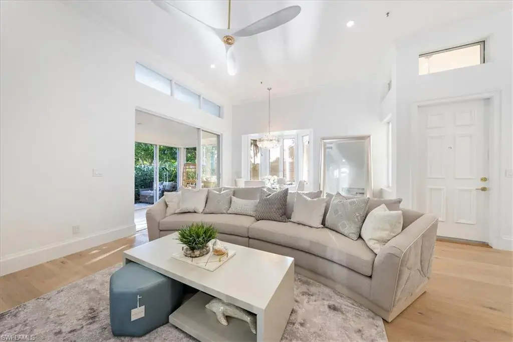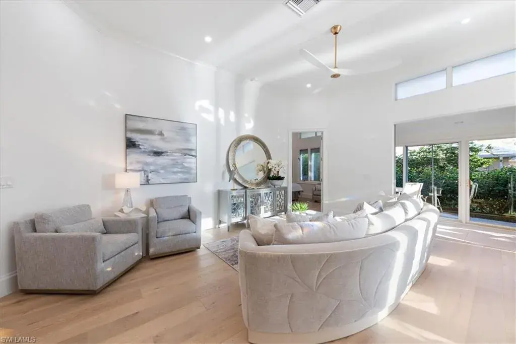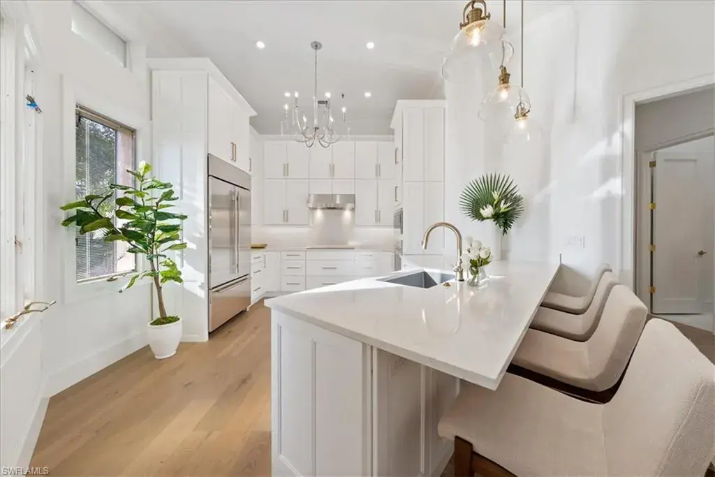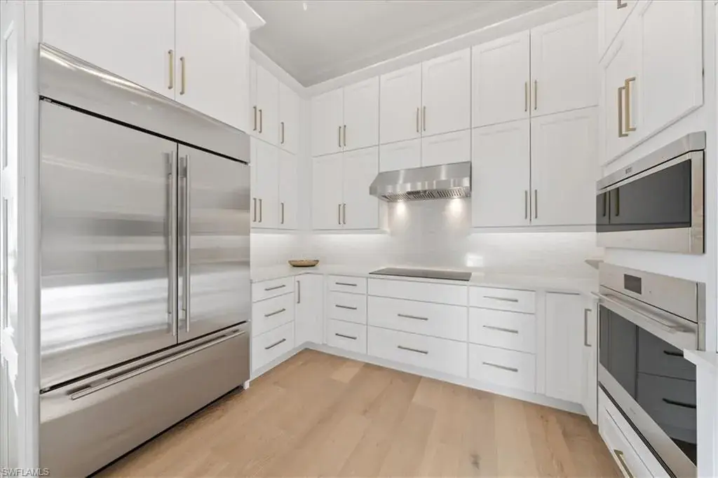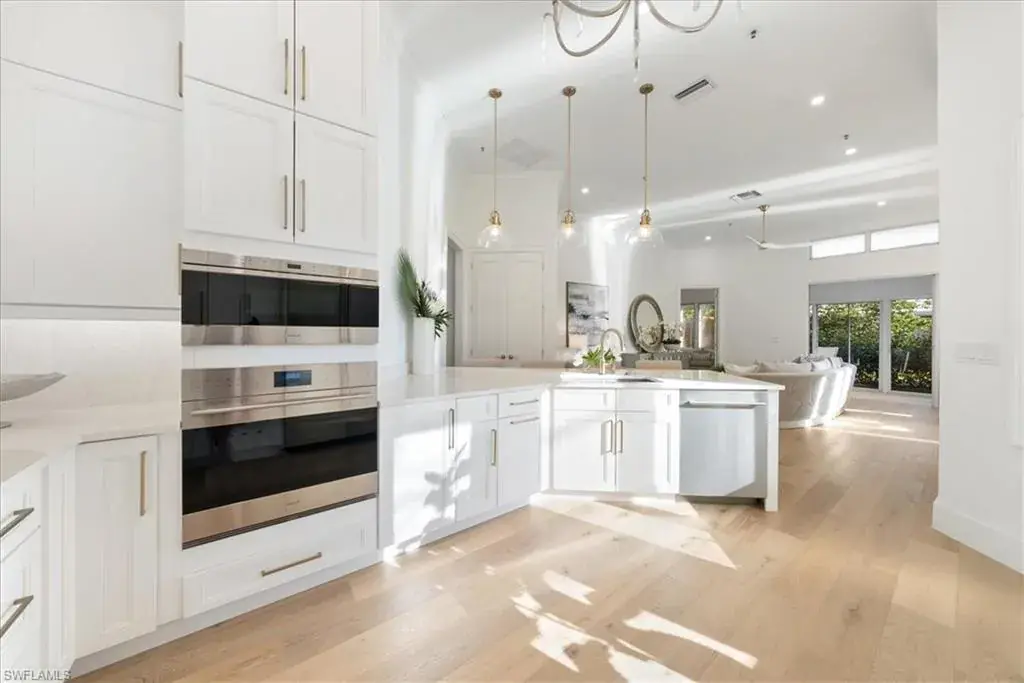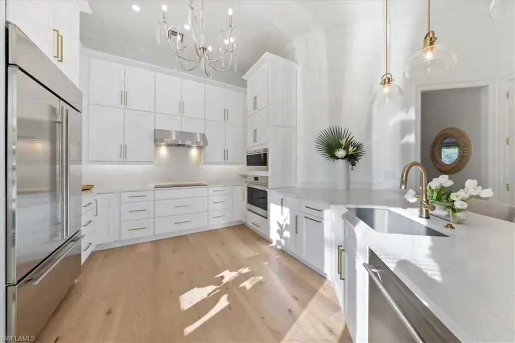 FULLY RENOVATED Single-Story Villa – NO STAIRS!! LuxRe Construction has done it again in the heart of Park Shore off Belair Ln, this end unit attached villa has a newly designed wide open floor plan with high end appliances and finishes, 2 bedrooms, 2 baths, and a 2 car garage. With high vaulted ceilings, 8’ solid core doors, engineered hardwood throughout, fully built out closets with 2 in the primary suite and an oversized guest, Subzero fridge, Wolf Induction Cooktop, Wolf oven and convection oven, and gorgeous Cambria Quartz and Mystery White Marble tops. All of the work has been done for you to move right in! Enter through your own side yard with additional guest parking to this end unit with tons of windows and natural light flowing in. Walk out to your private covered lanai with sliding glass doors to close whenever it is too hot outside, or walk out to your extended patio created with a privacy clusia hedge for uncovered outdoor living space you rarely find in a villa. This development just painted the Villas a beautiful white for a fresh and beautiful new and improved look! This villa is located steps from the Venetian Village Dining And Shops, Community Pool, and Park Shore Private Beach club you can join for a small fee by owning a home in Park Shore. With a location like this you typically have to give up garage space, finishes, ceiling height, or have to go upstairs. This unit has everything you have been searching for and more!